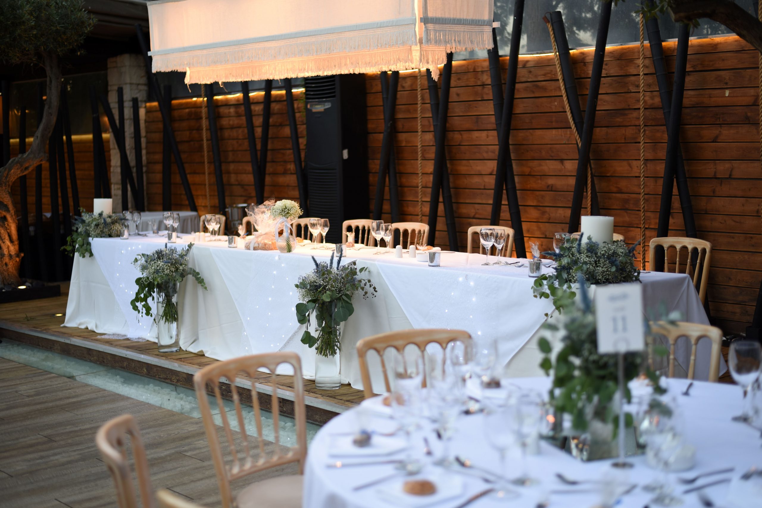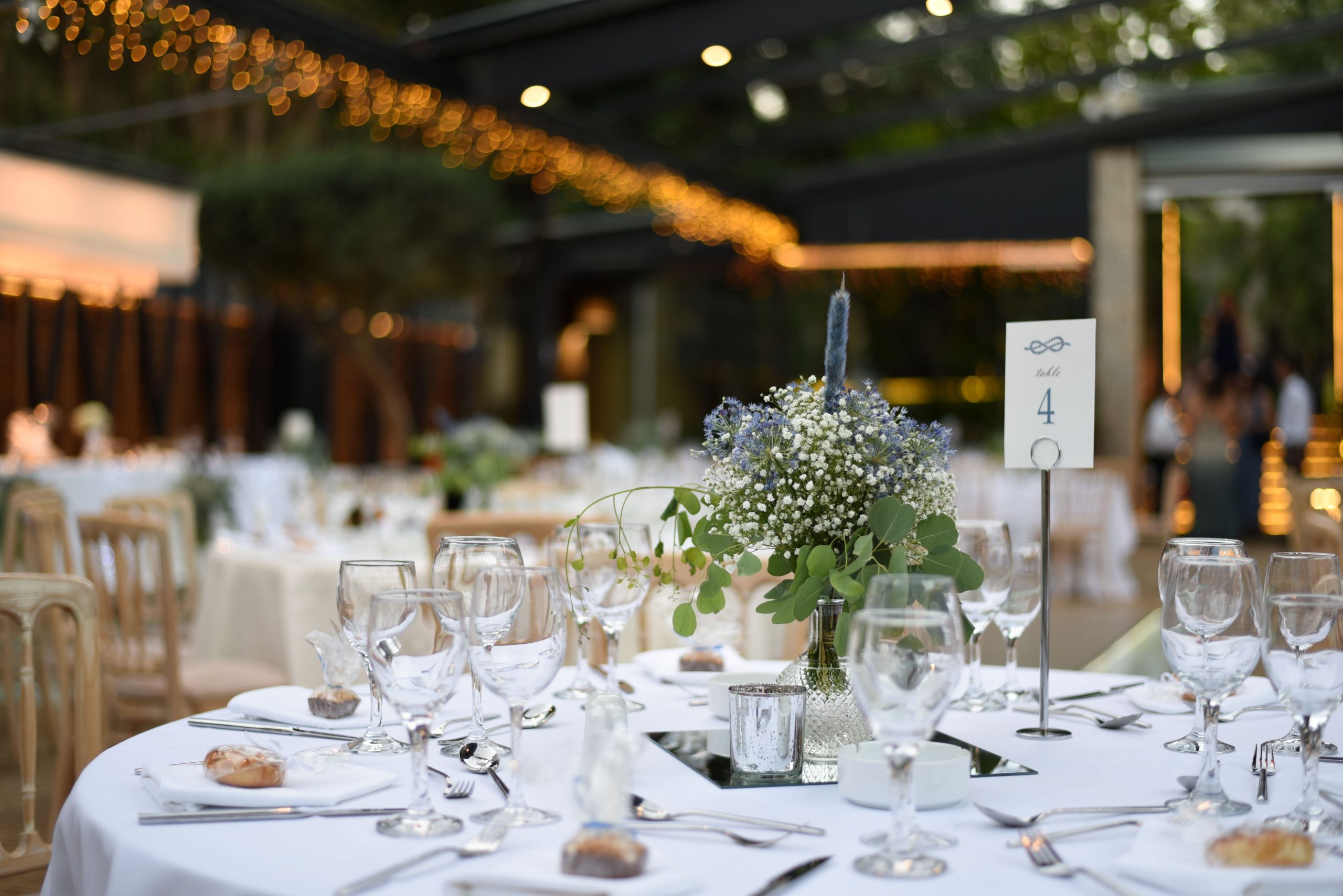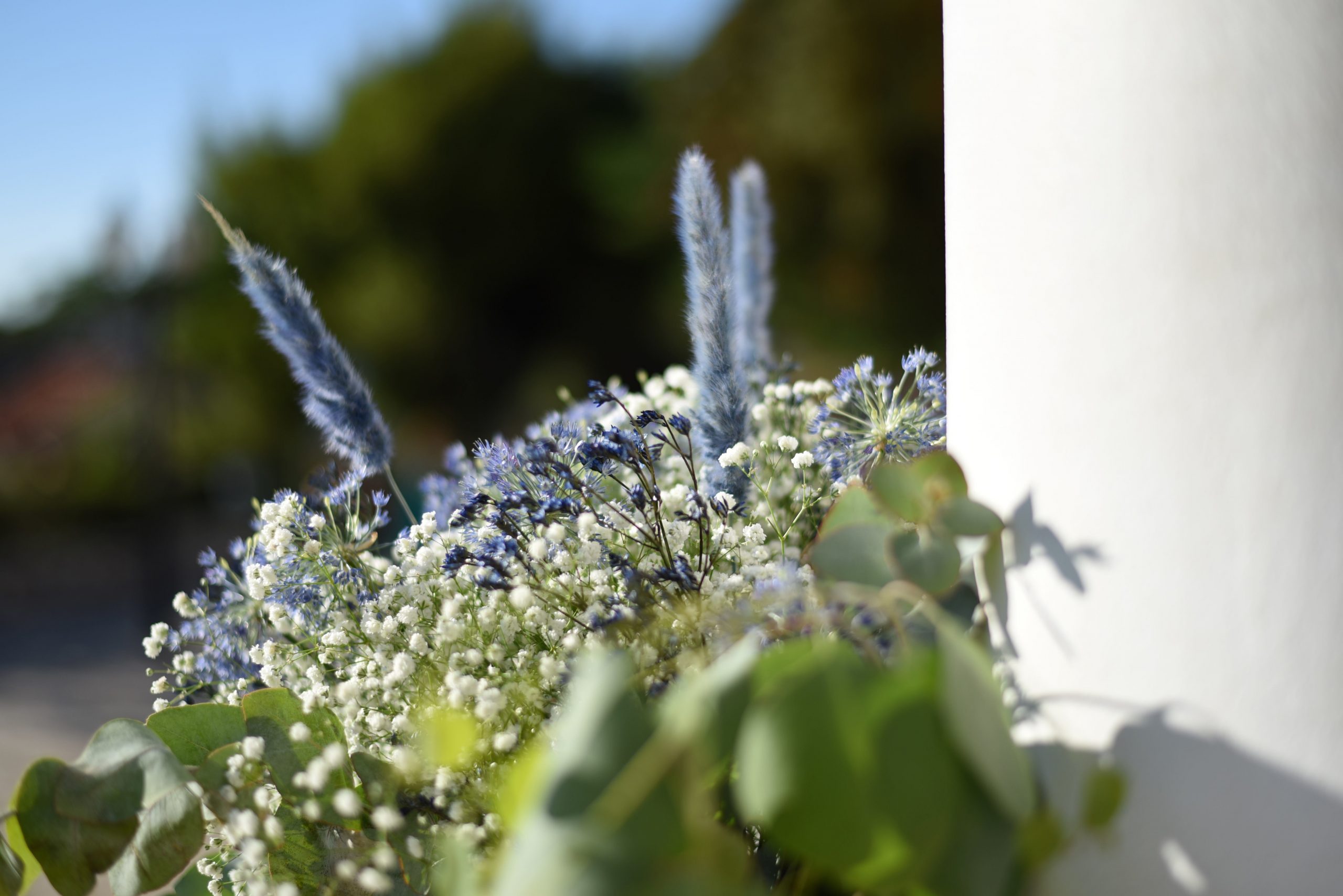 The floral arrangements combined gypsophila, eucalyptus and delicate blue touches, creating a sense of freshness and discreet luxury.