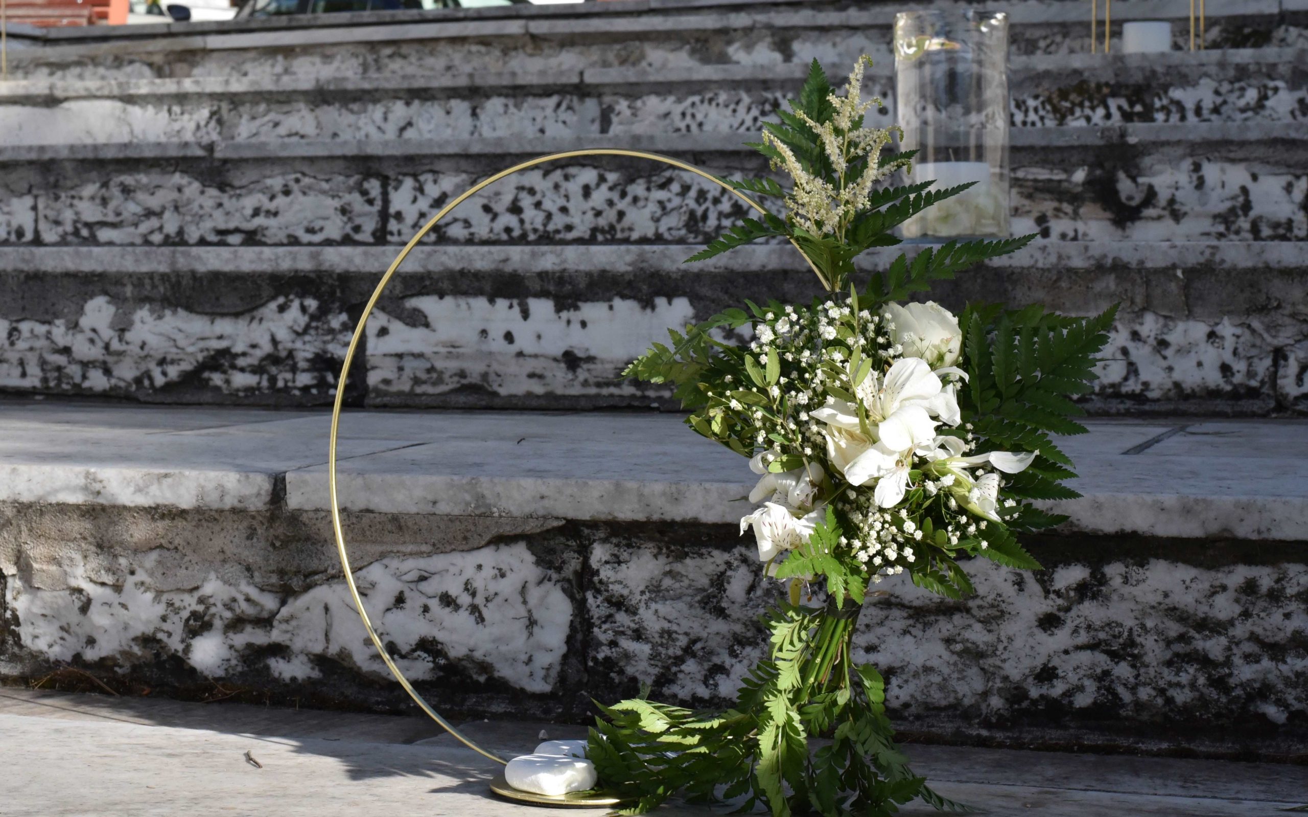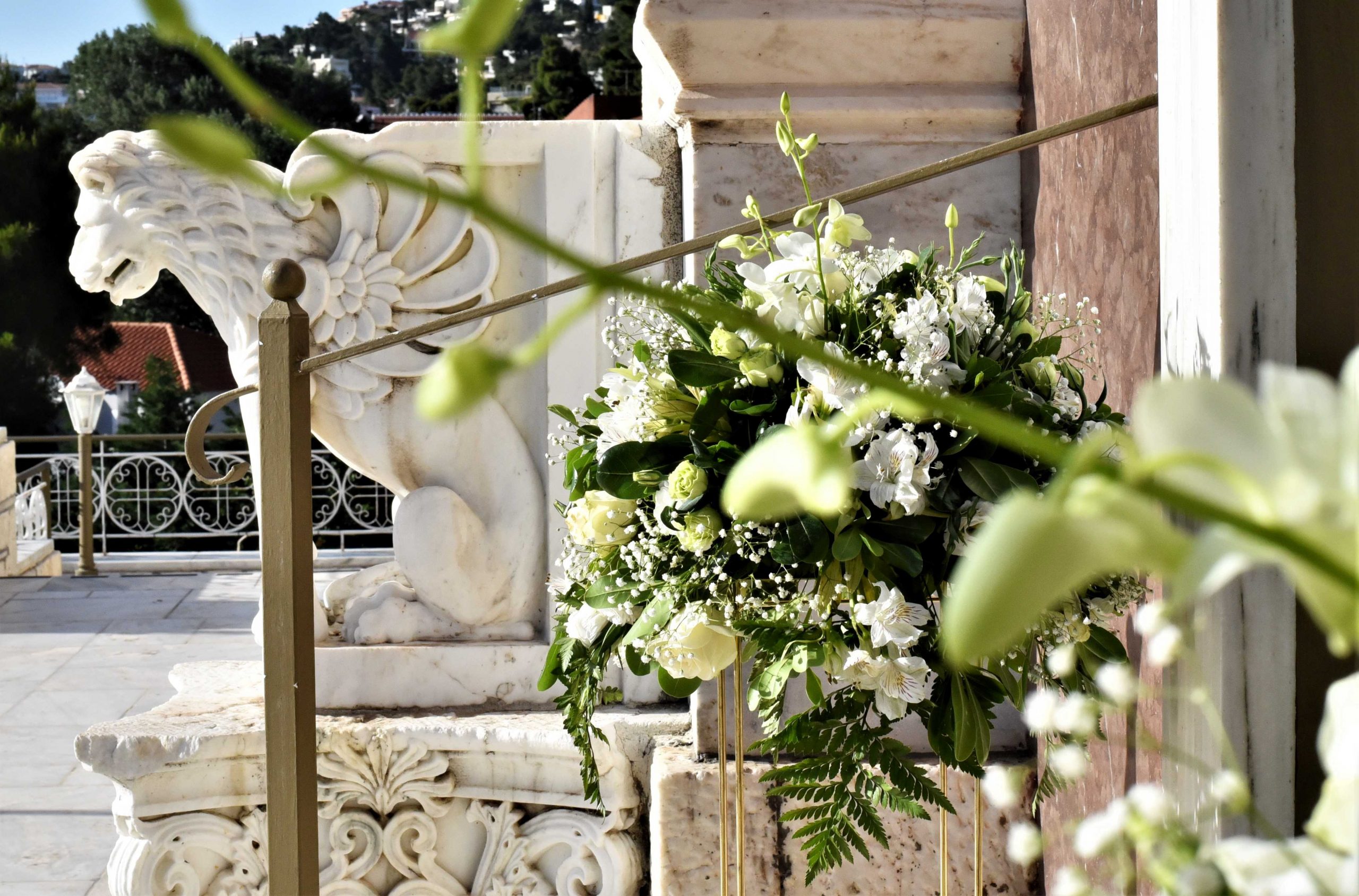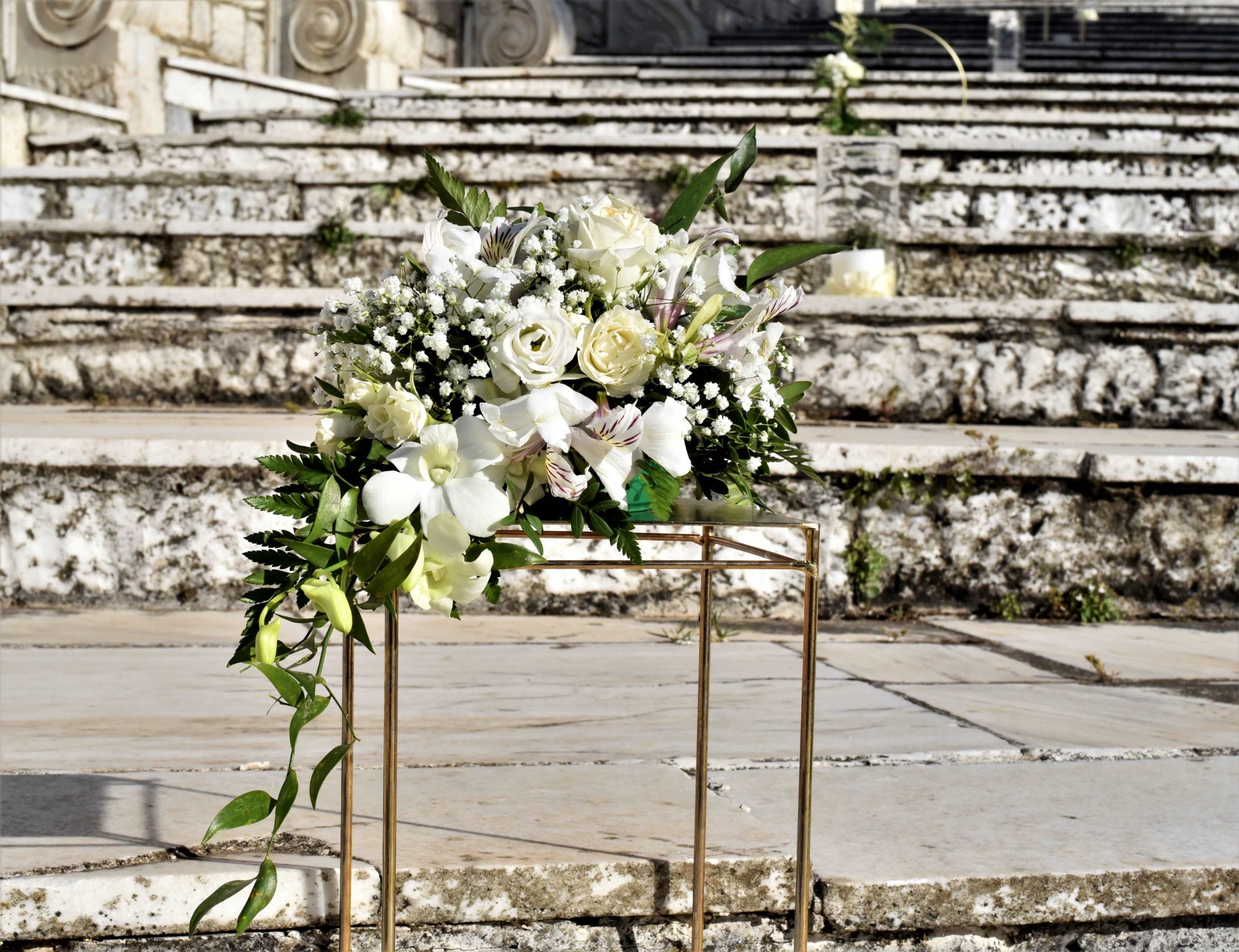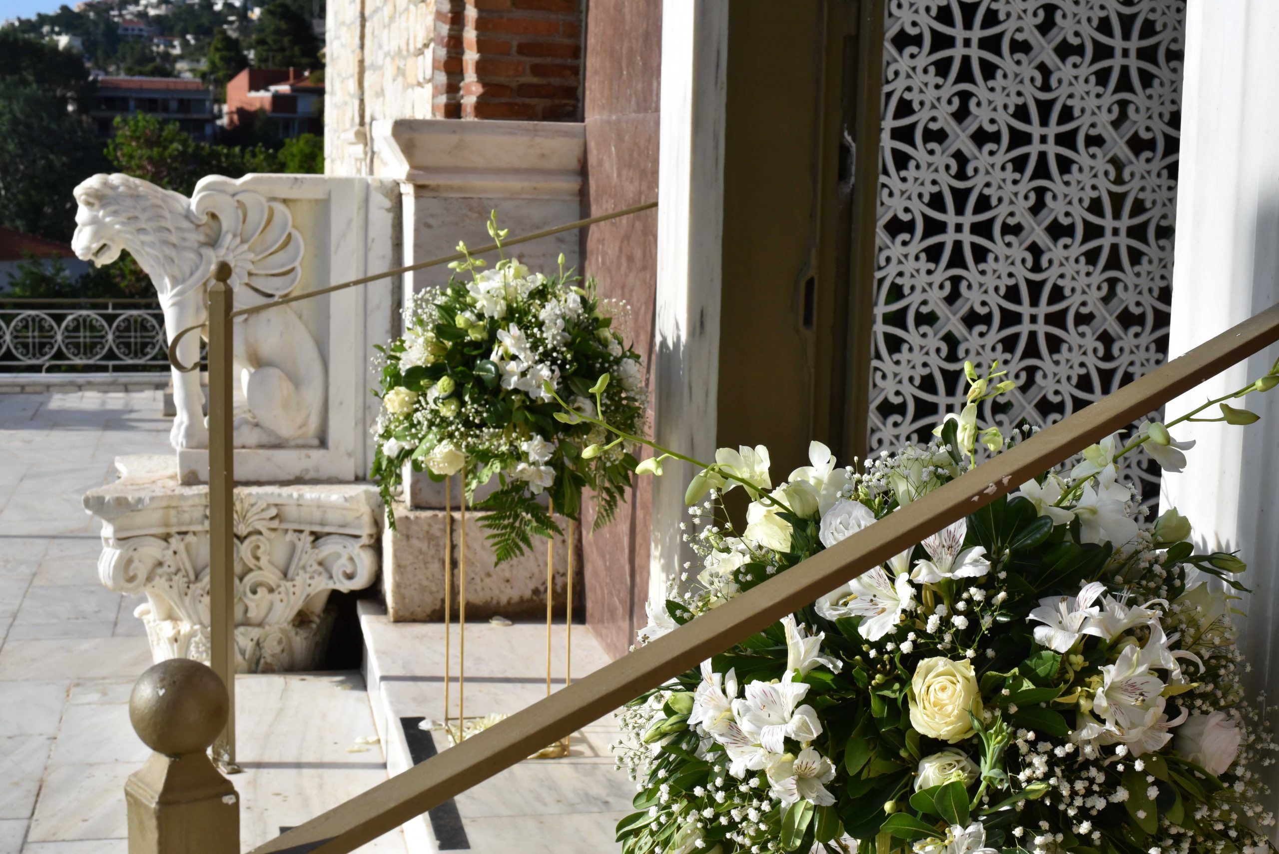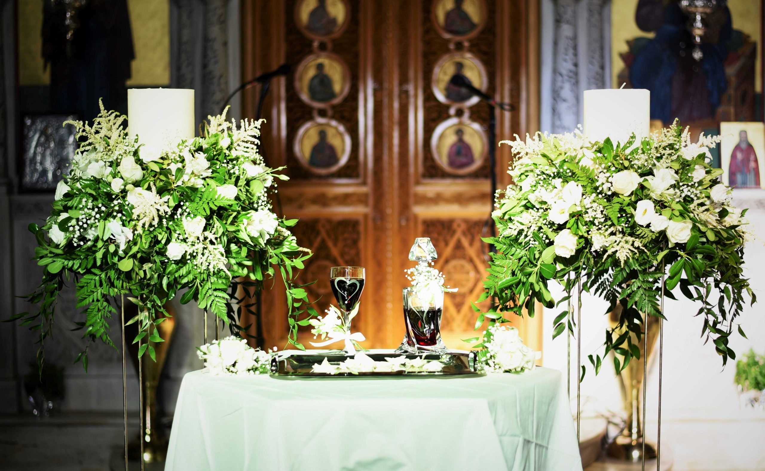 The wedding of Dora and Alexandros took place at Panagia Eleftherotria in Kifissia. The decoration moved in a palette of white flowers and green leaves, exuding tranquility, freshness and timeless elegance. At the entrances and on the steps of the church, rich compositions of white roses, alstroemerias and gypsophila were framed by lush eucalyptus and Italian rouscous leaves, creating a natural flow that led discreetly towards the interior. The compositions were placed on metal bases, giving height and a stately presence, while the overall image remained light and airy — a harmonious balance between simplicity and luxury.