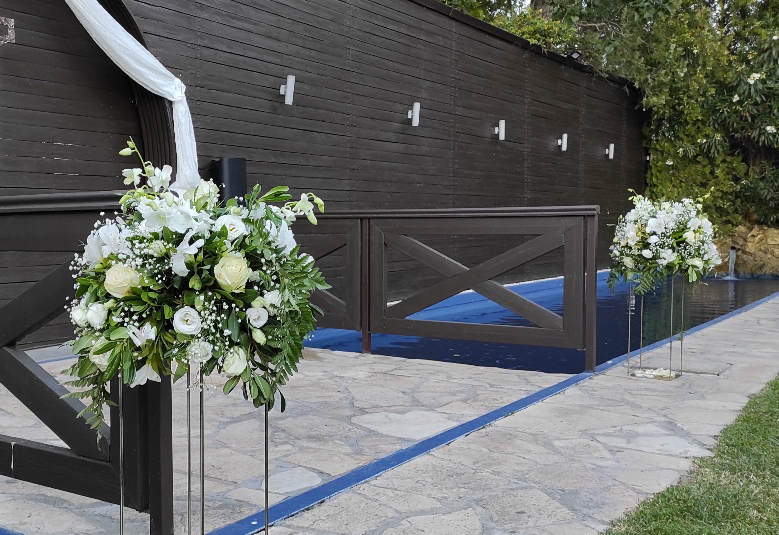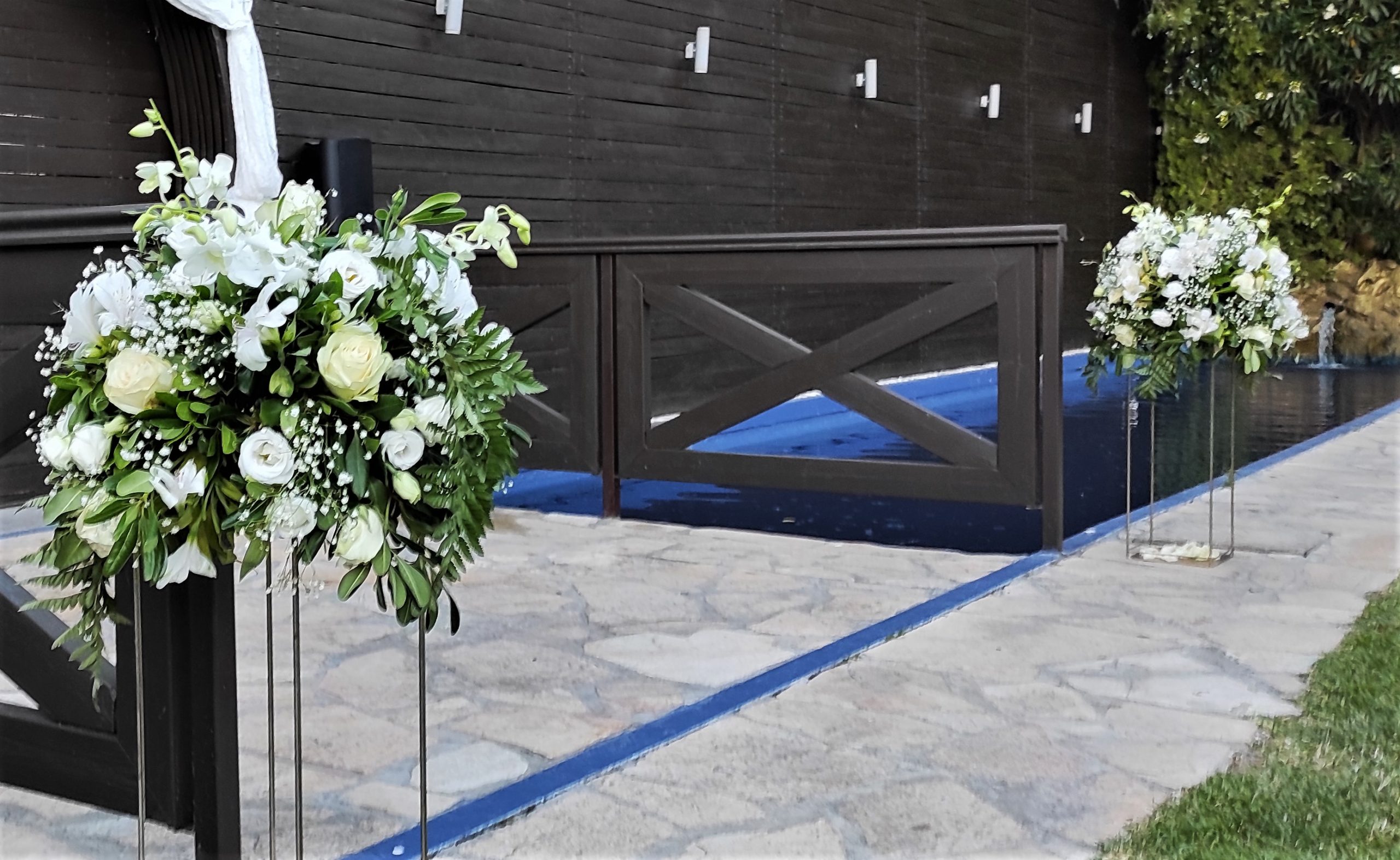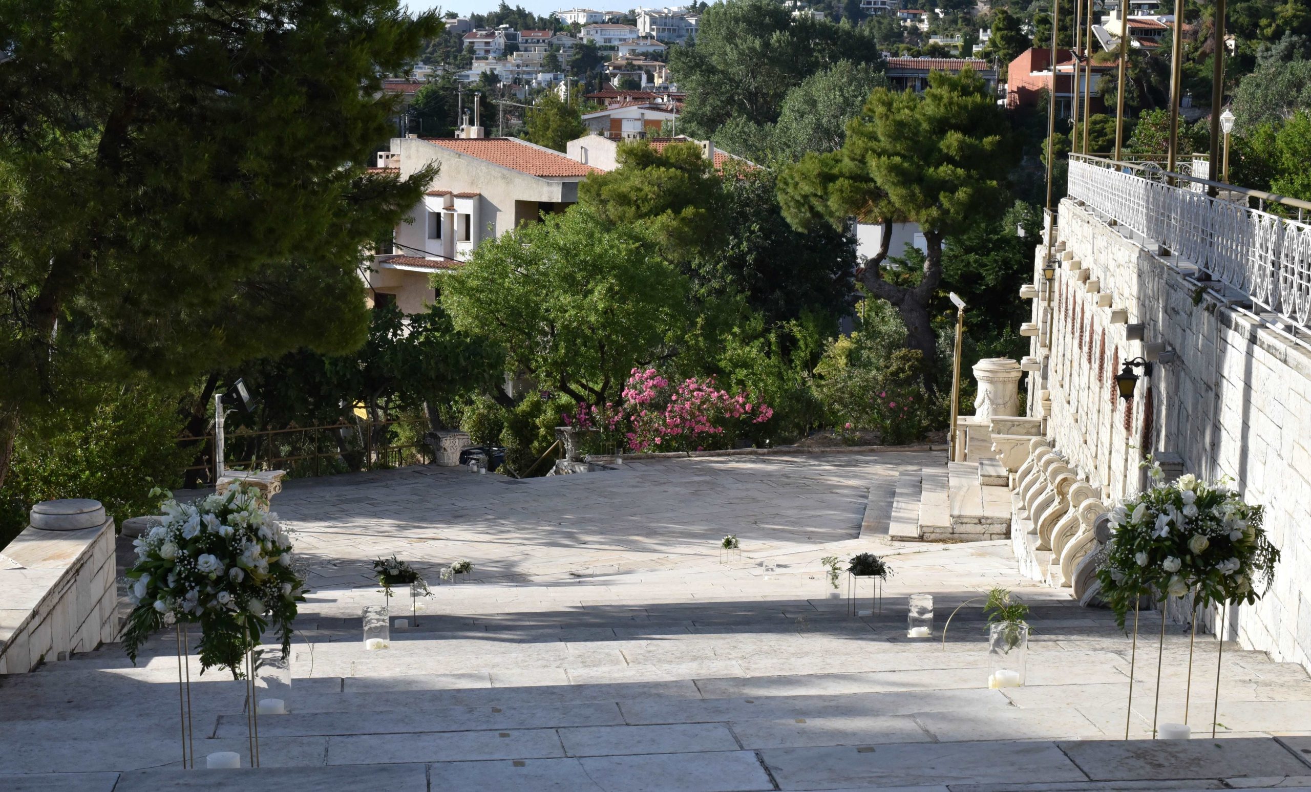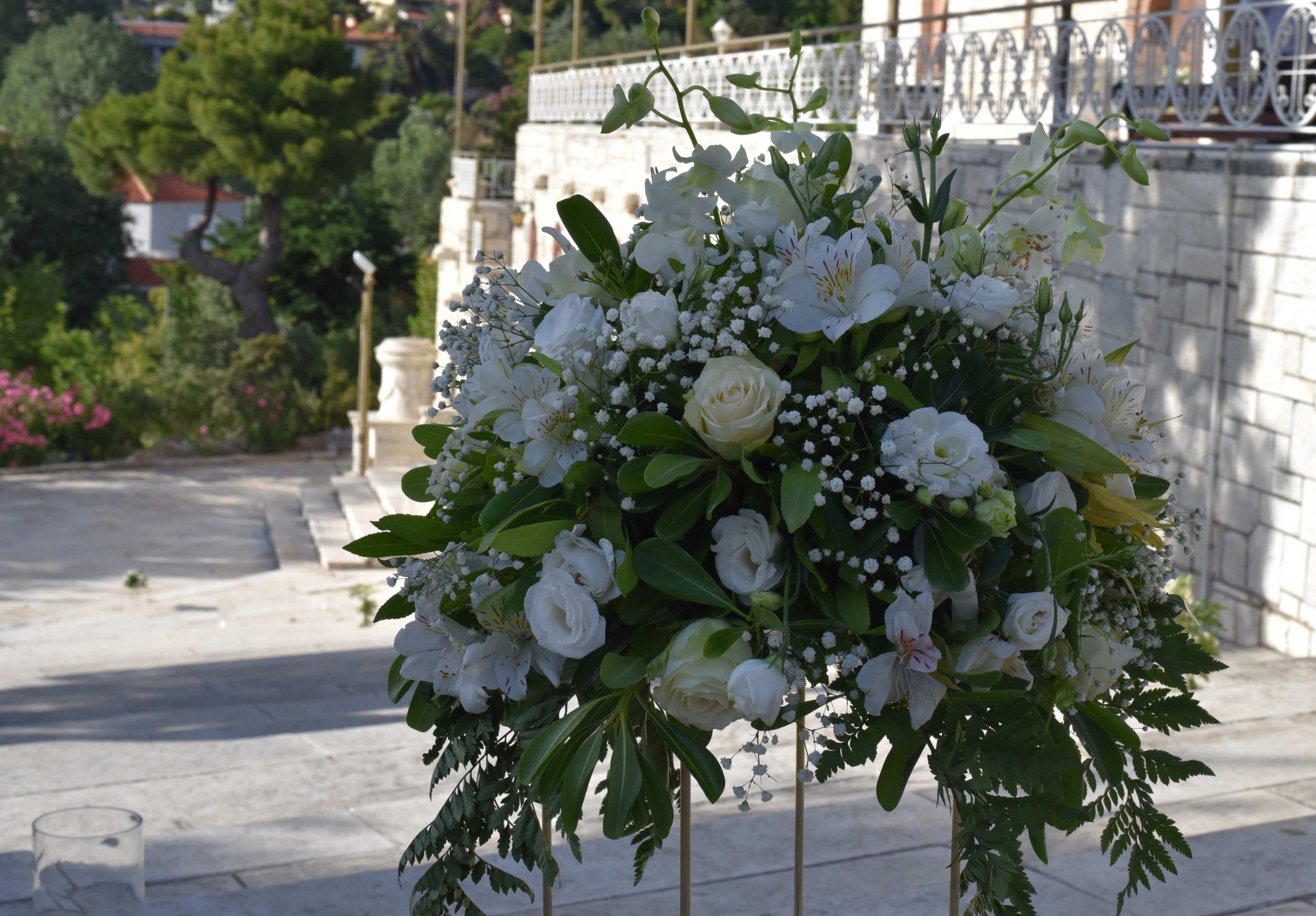 The wedding of Dora and Alexandros took place at Panagia Eleftherotria in Kifissia. The decoration moved in a palette of white flowers and green leaves, exuding tranquility, freshness and timeless elegance. At the entrances and on the steps of the church, rich compositions of white roses, alstroemerias and gypsophila were framed by lush eucalyptus and Italian rouscous leaves, creating a natural flow that led discreetly towards the interior. The compositions were placed on metal bases, giving height and a stately presence, while the overall image remained light and airy — a harmonious balance between simplicity and luxury.