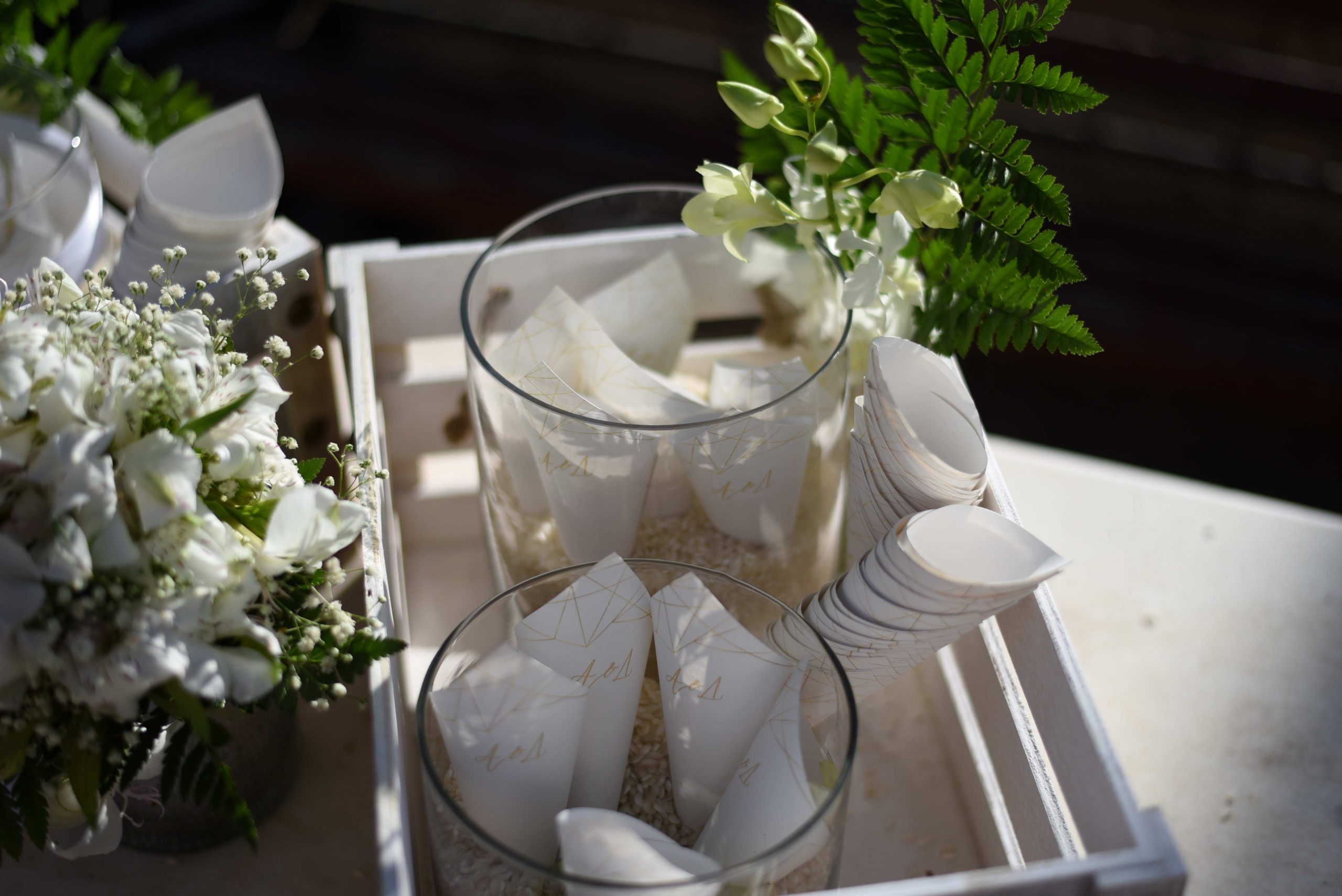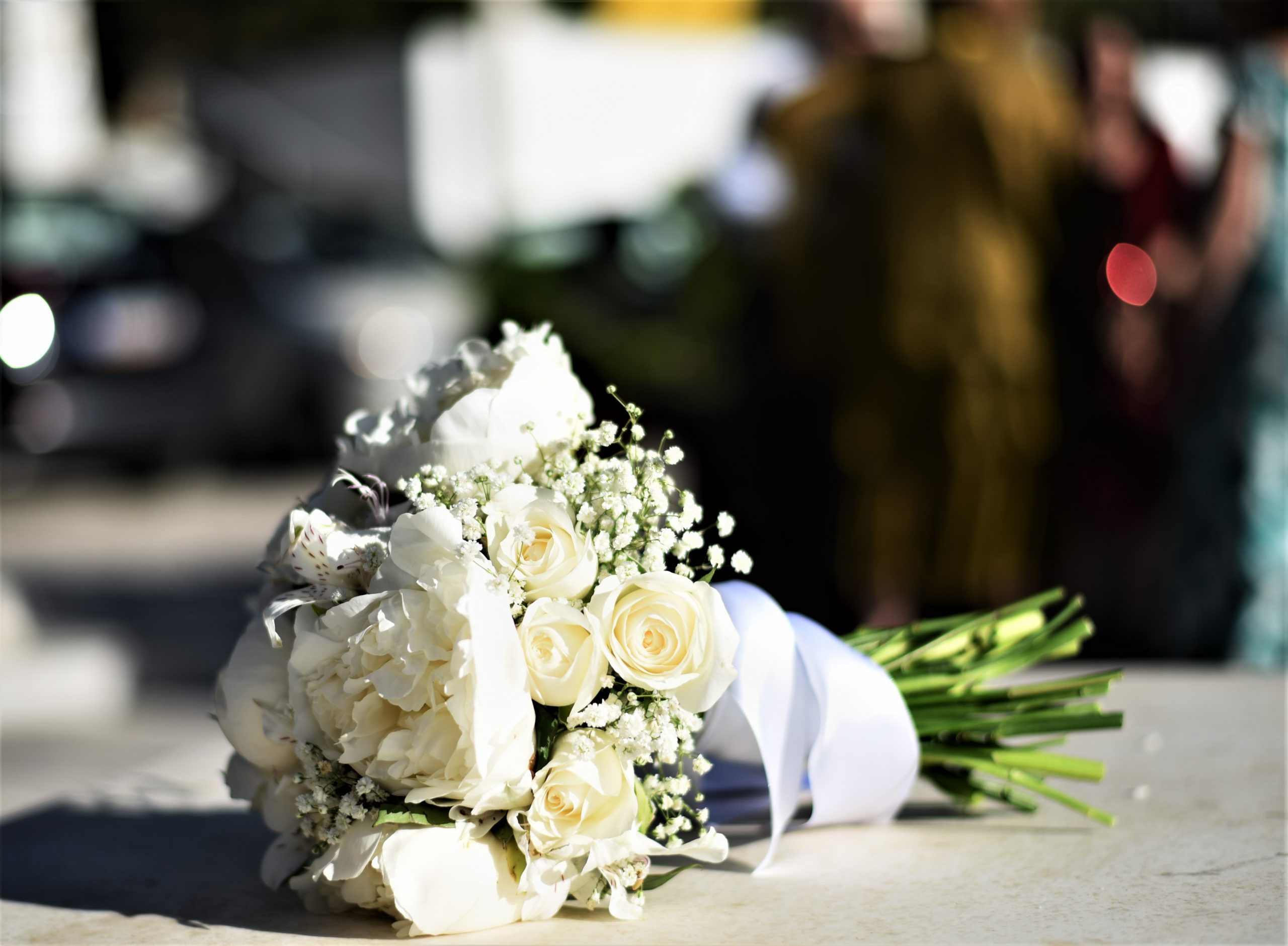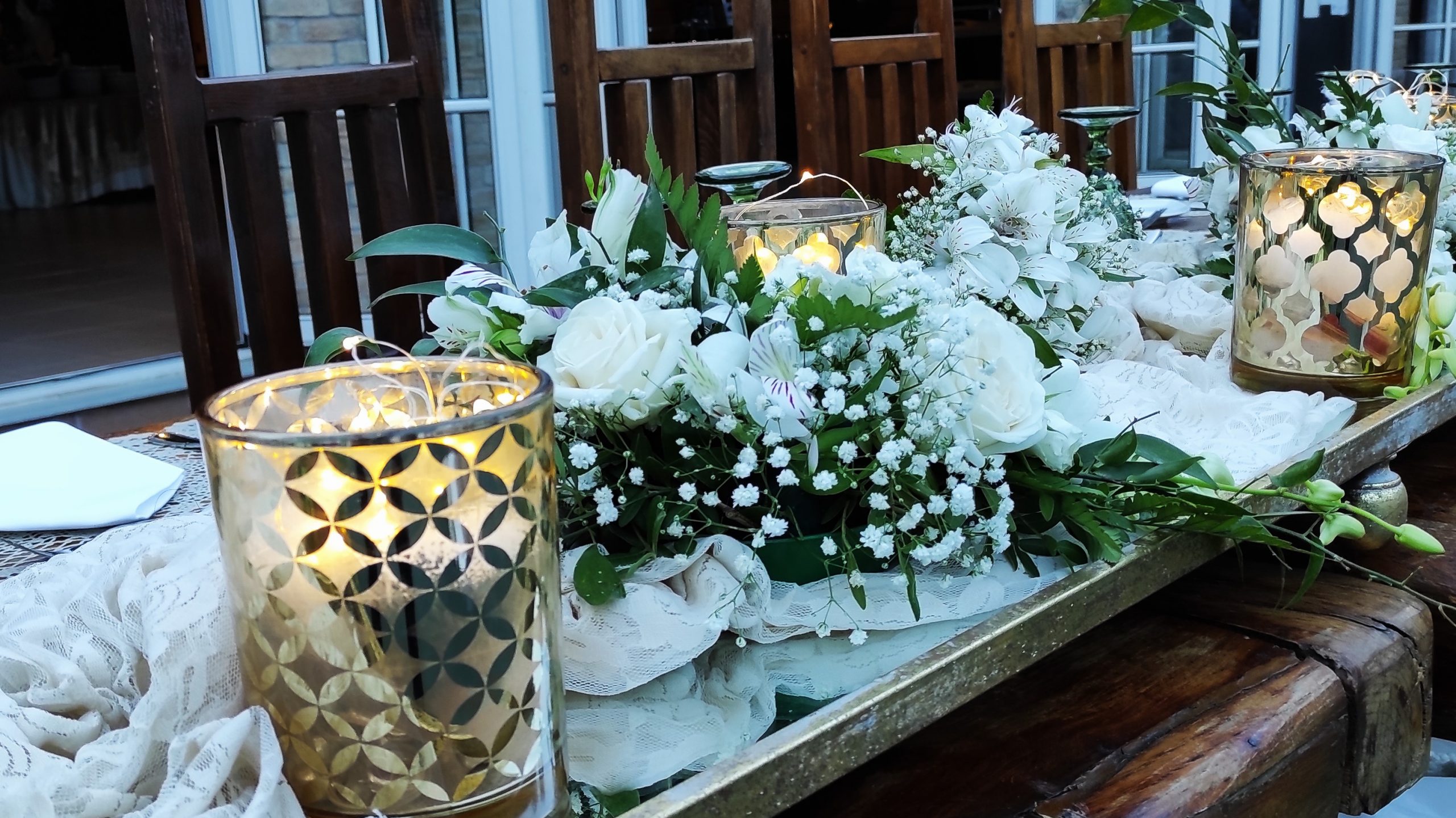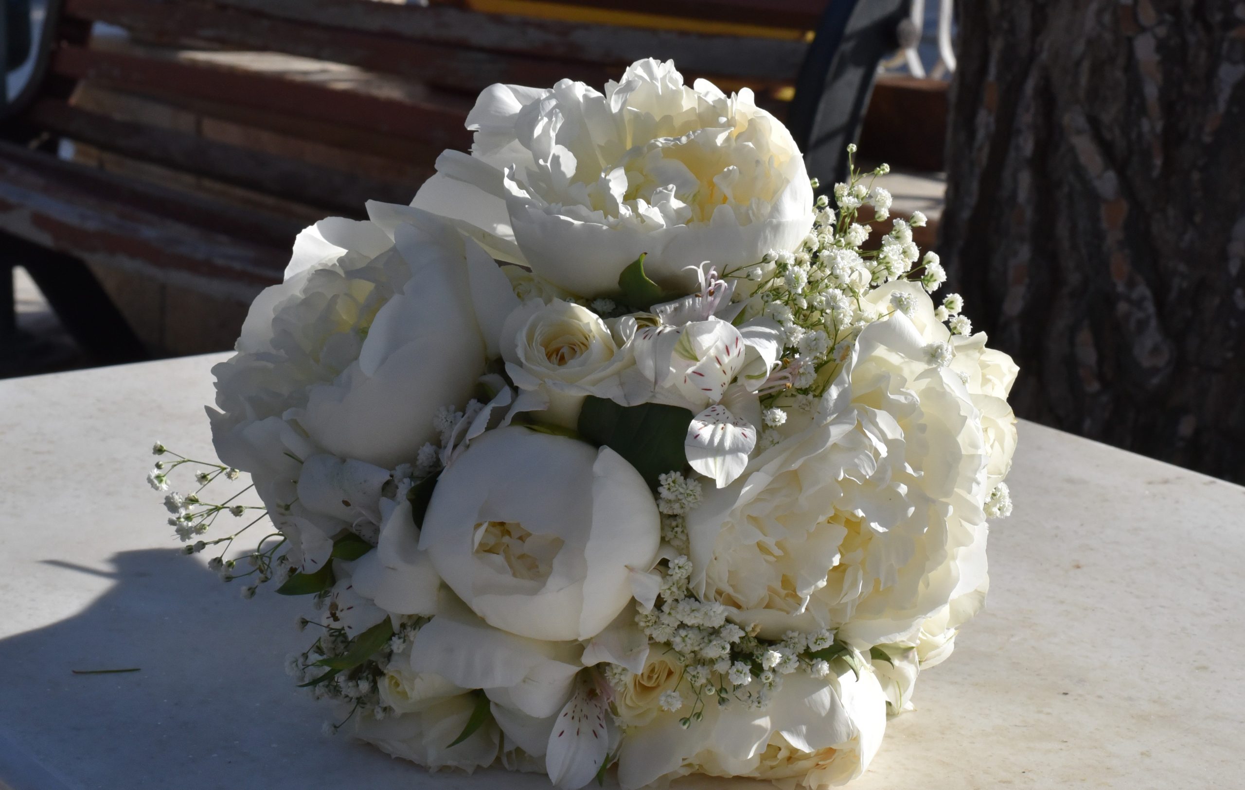 Inside the church, the wedding candles were designed with clean lines and natural elegance. White candles were decorated with white flowers and greenery, following the same aesthetic of purity and brightness. The ceremony table had minimal decoration, so that nothing would “burden” the sacred setting, but would complement it with respect and elegance. The bridal bouquet of peonies and other white flowers completed the image and highlighted the bride’s elegance.
