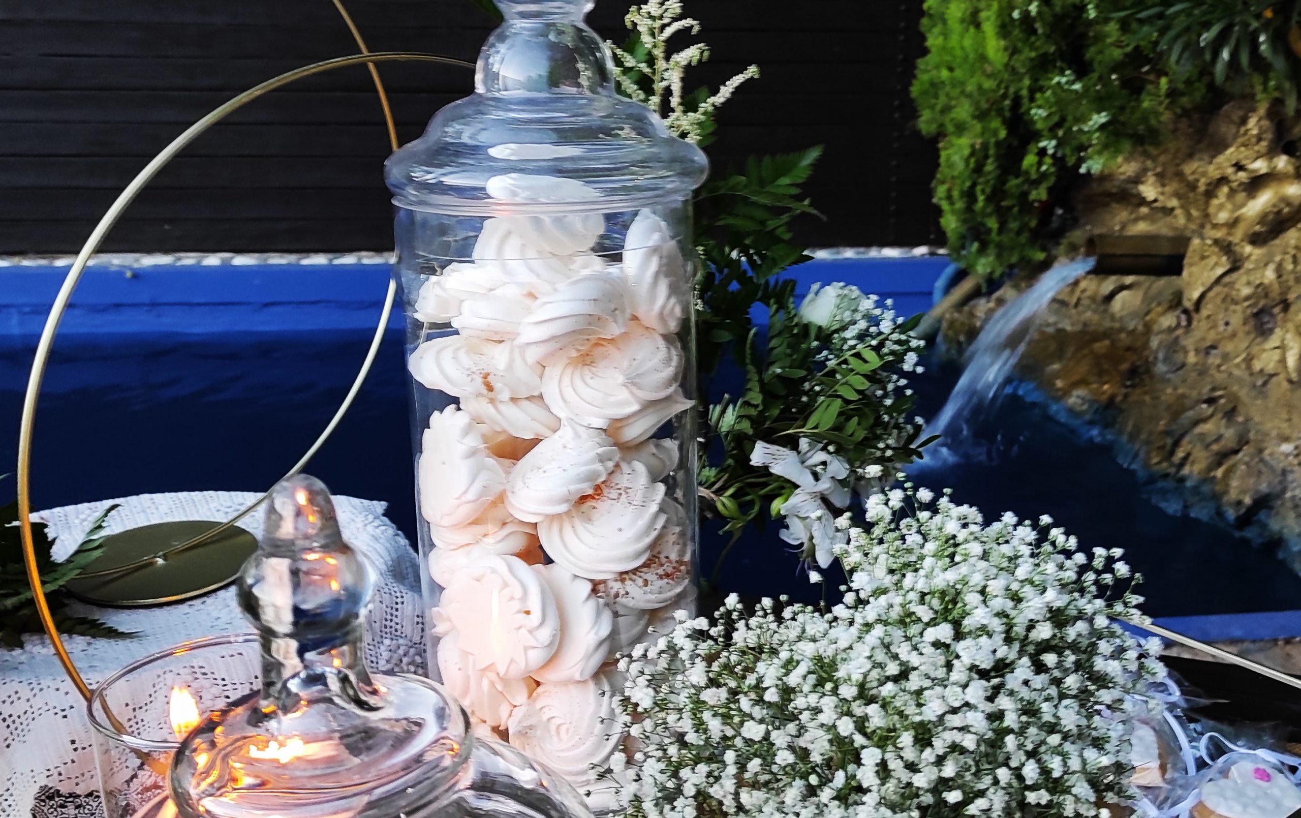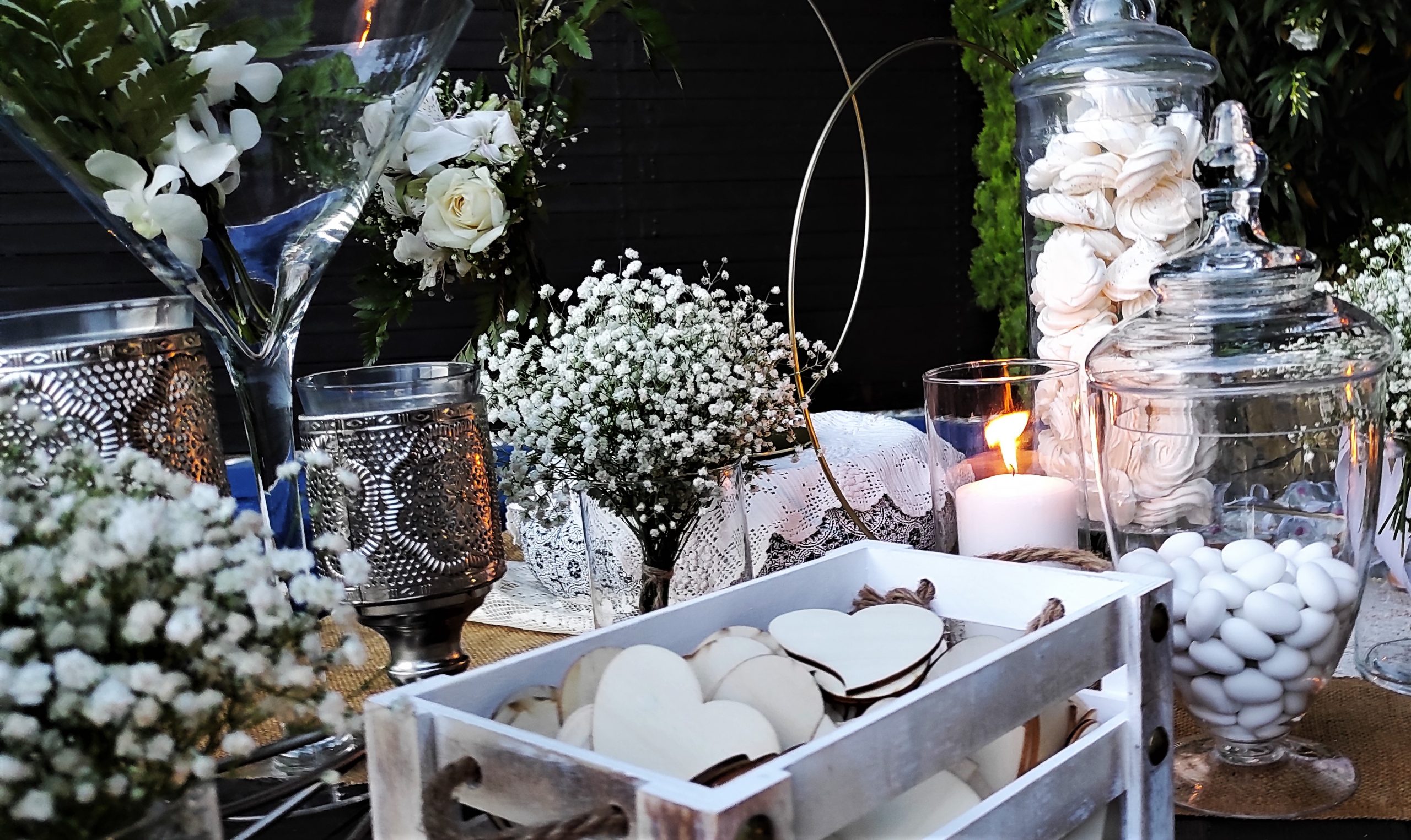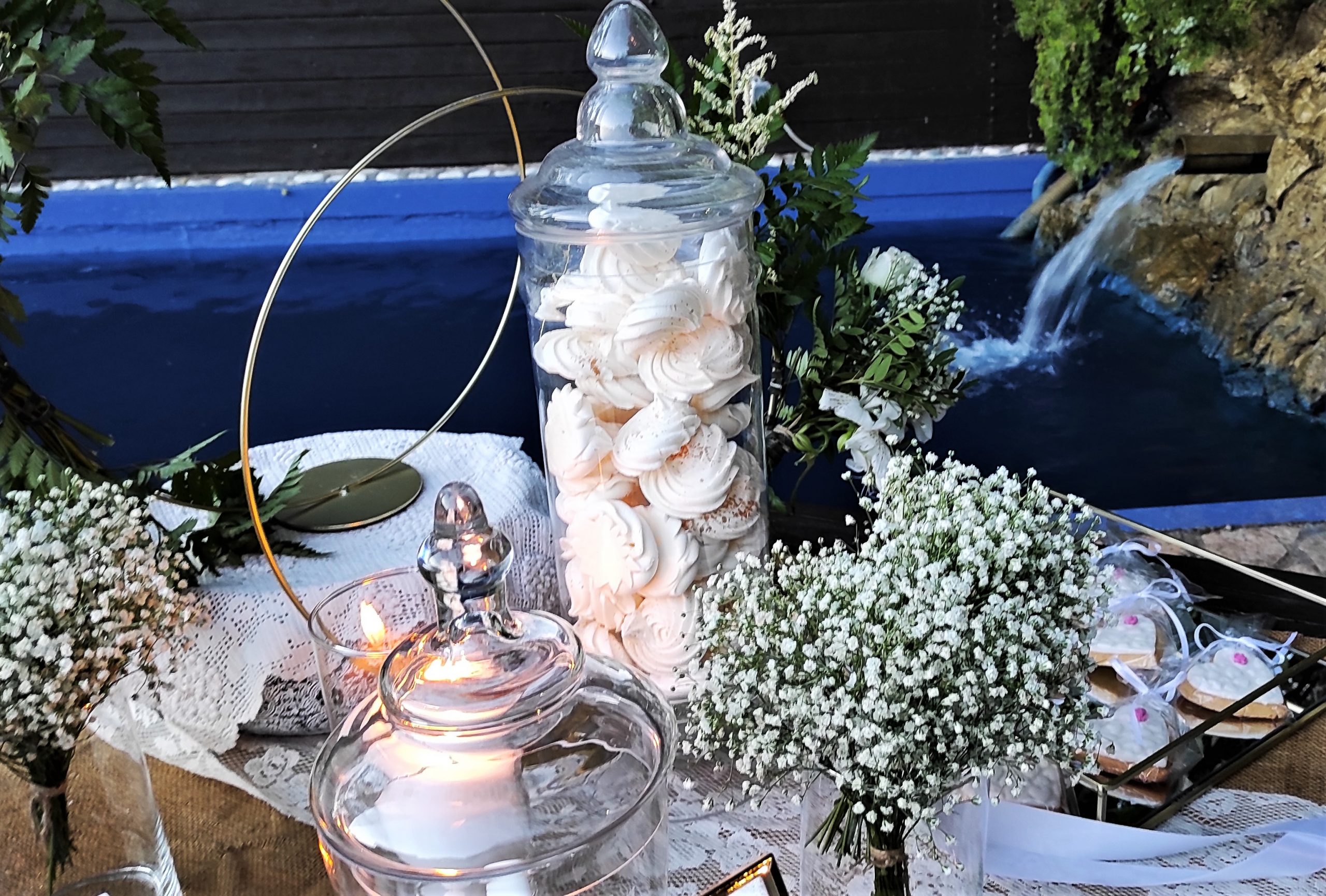 The Dessert Table was designed as a small setting of romance and detail. Glass jars with sweets, white and pastel elements, lace and natural materials were combined with small touches of gypsophila and green leaves. Wooden decorations and candles completed the image, creating a warm and elegant space that invited guests to stand, smile, and enjoy.