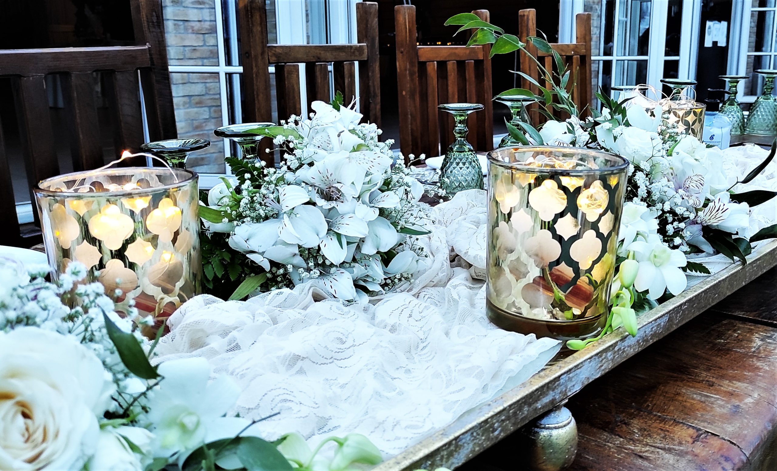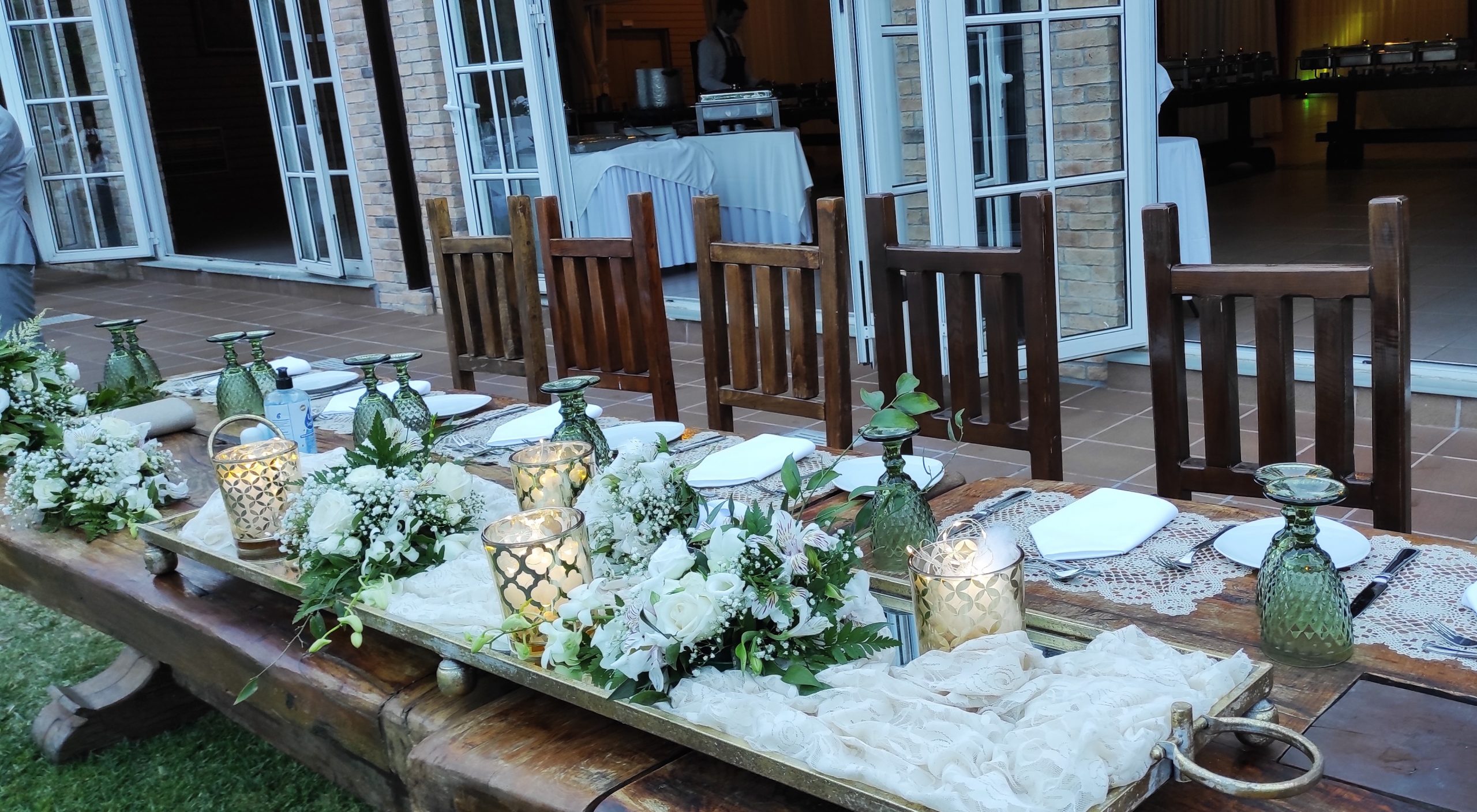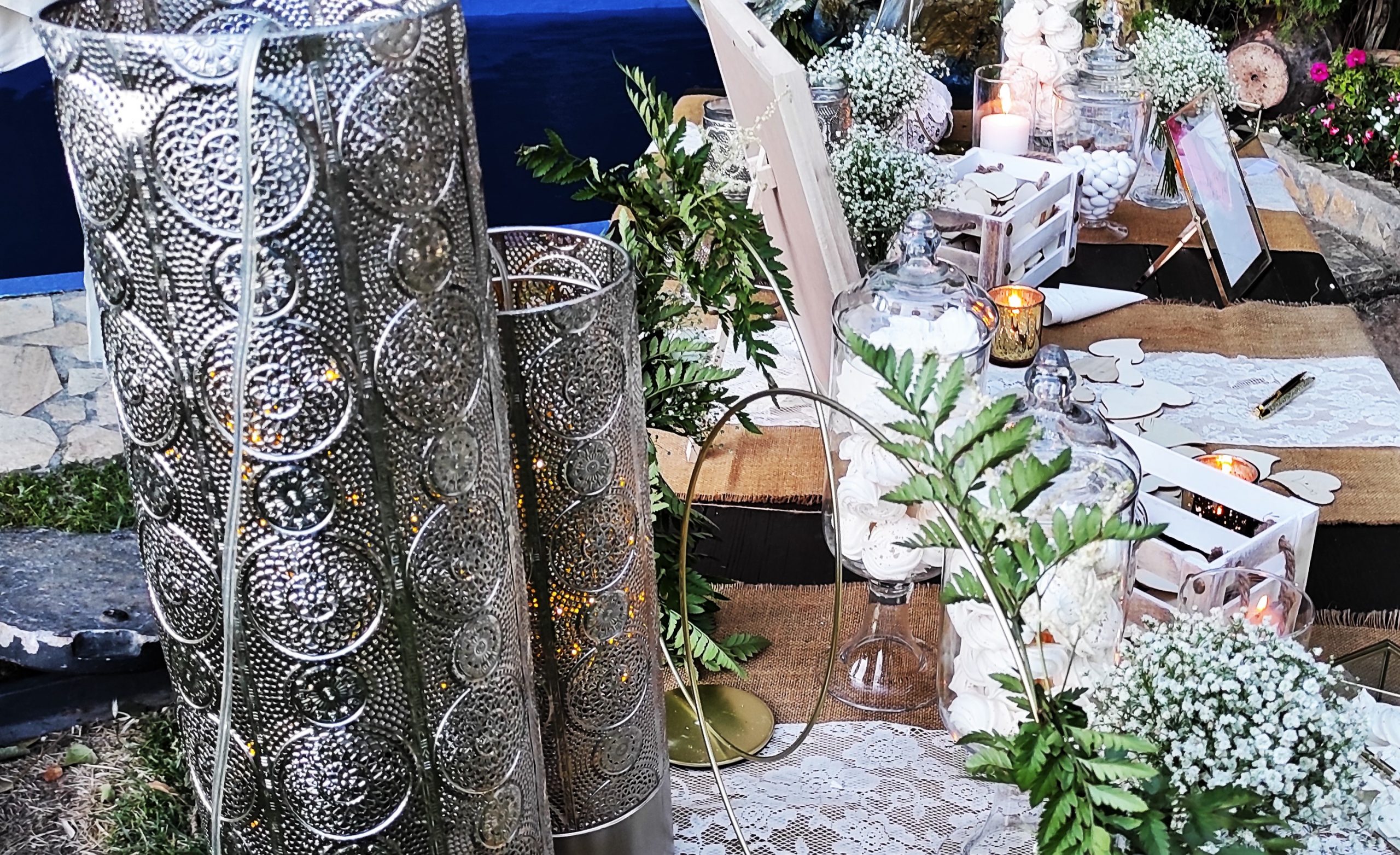 The Dessert Table was designed as a small setting of romance and detail. Glass jars with sweets, white and pastel elements, lace and natural materials were combined with small touches of gypsophila and green leaves. Wooden decorations and candles completed the image, creating a warm and elegant space that invited guests to stand, smile, and enjoy.