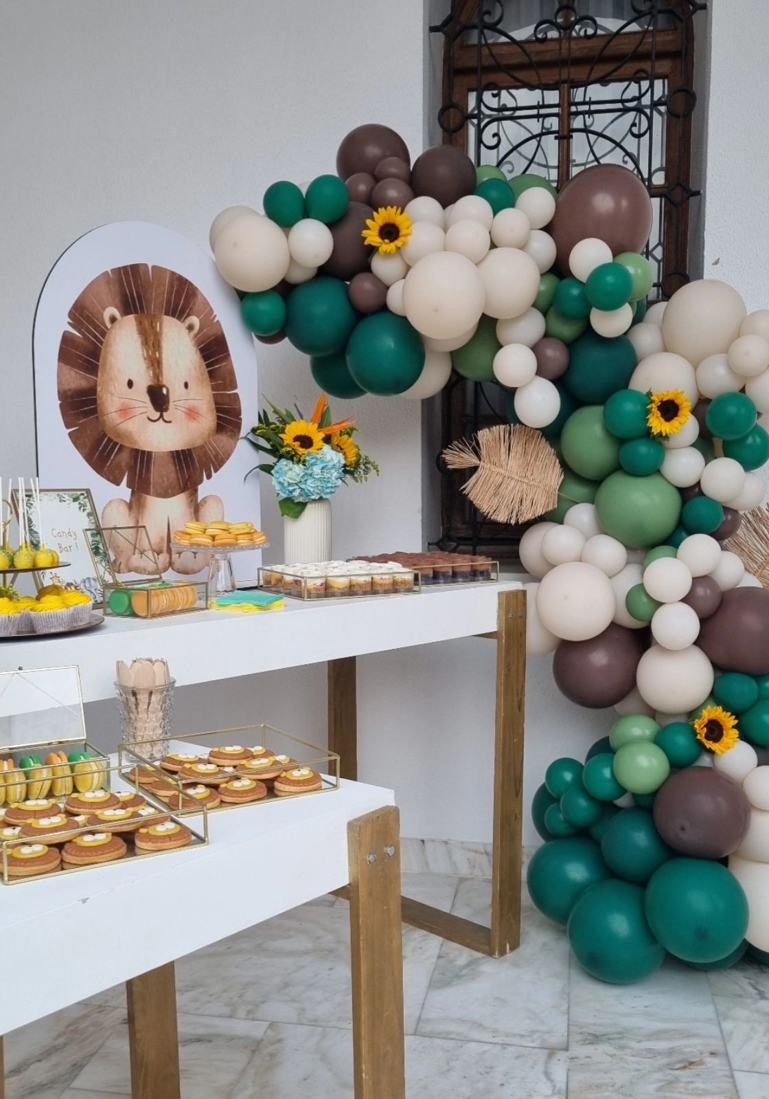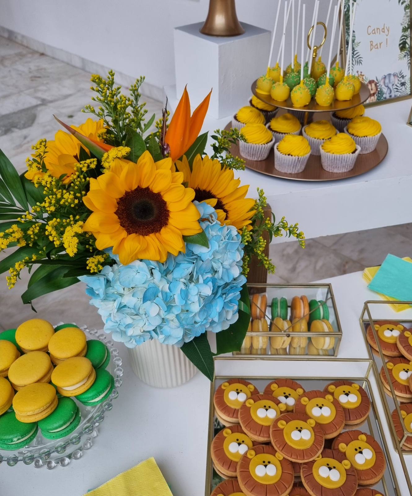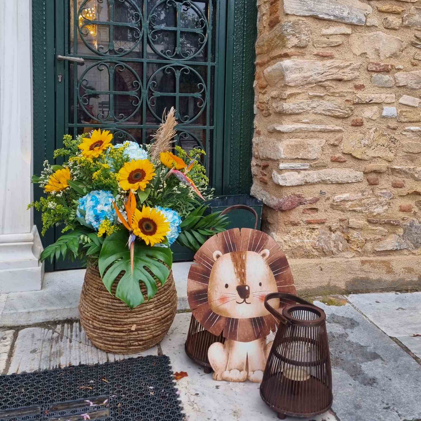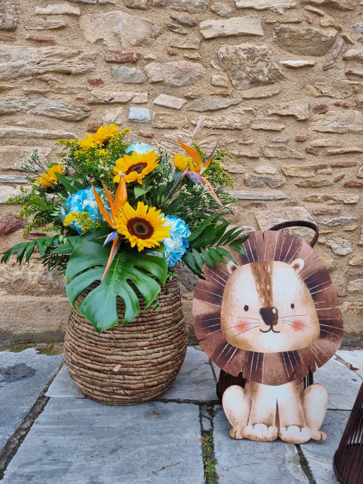 Το θέμα που επέλεξαν ήταν το Lion and friends!!! Εμείς προσαρμόσαμε την ιδέα τους στο “trend” επιλέγοντας συνθέσεις με σιελ ορτανσίες και ηλίανθους και πράσινα φυλλώματα, διατηρώντας μια αίσθηση tropical!!!