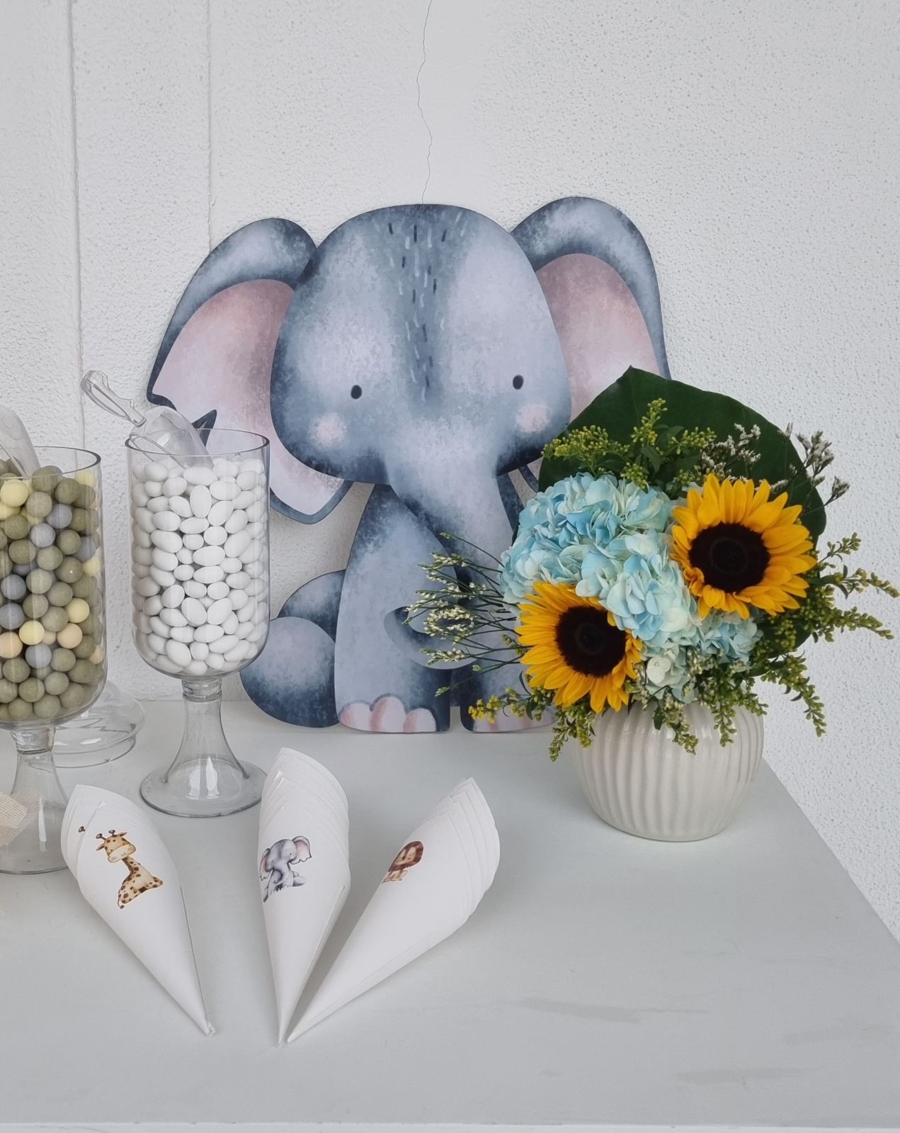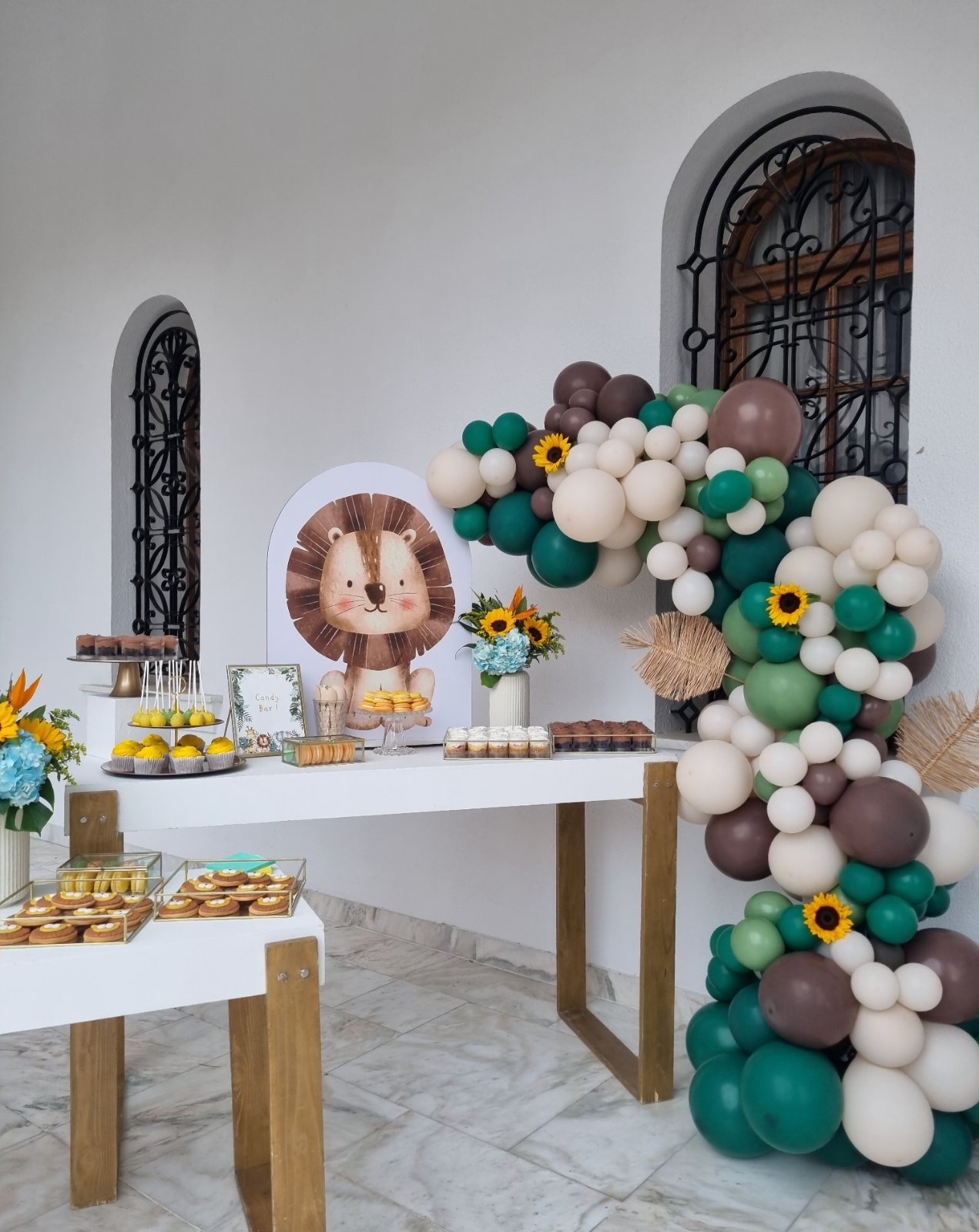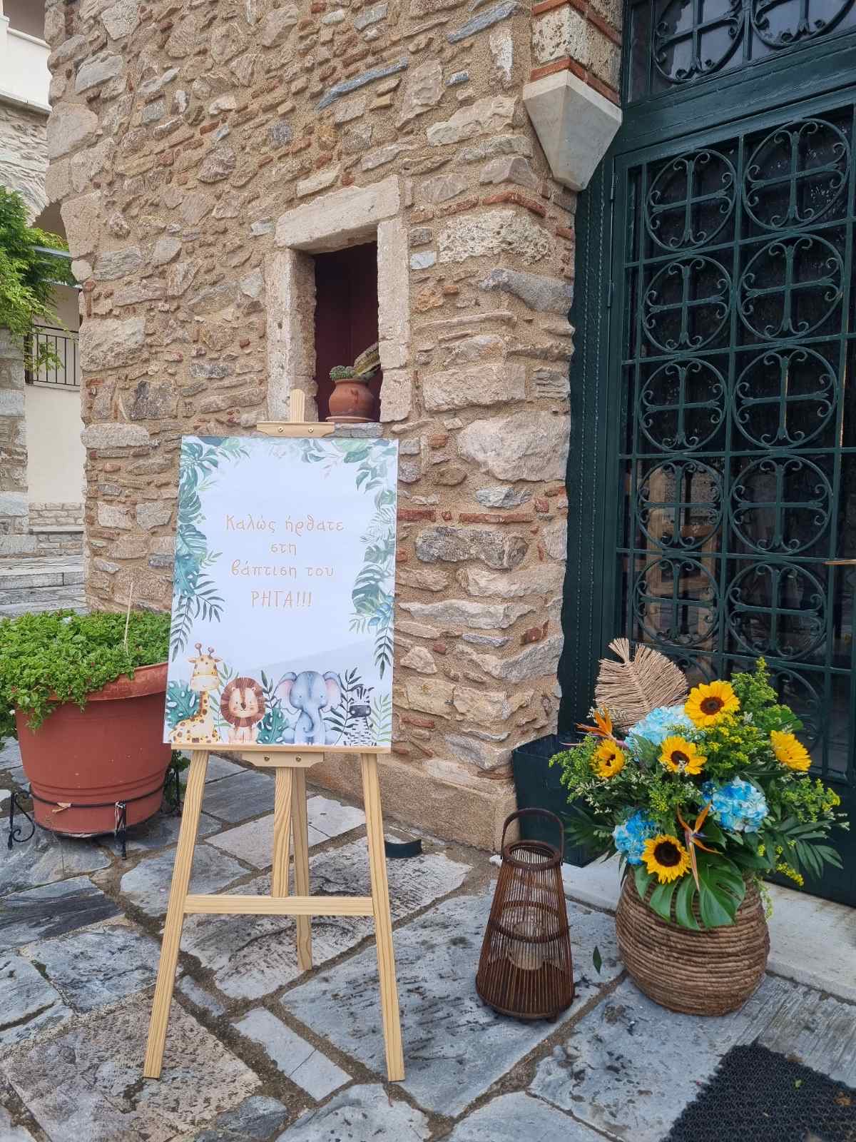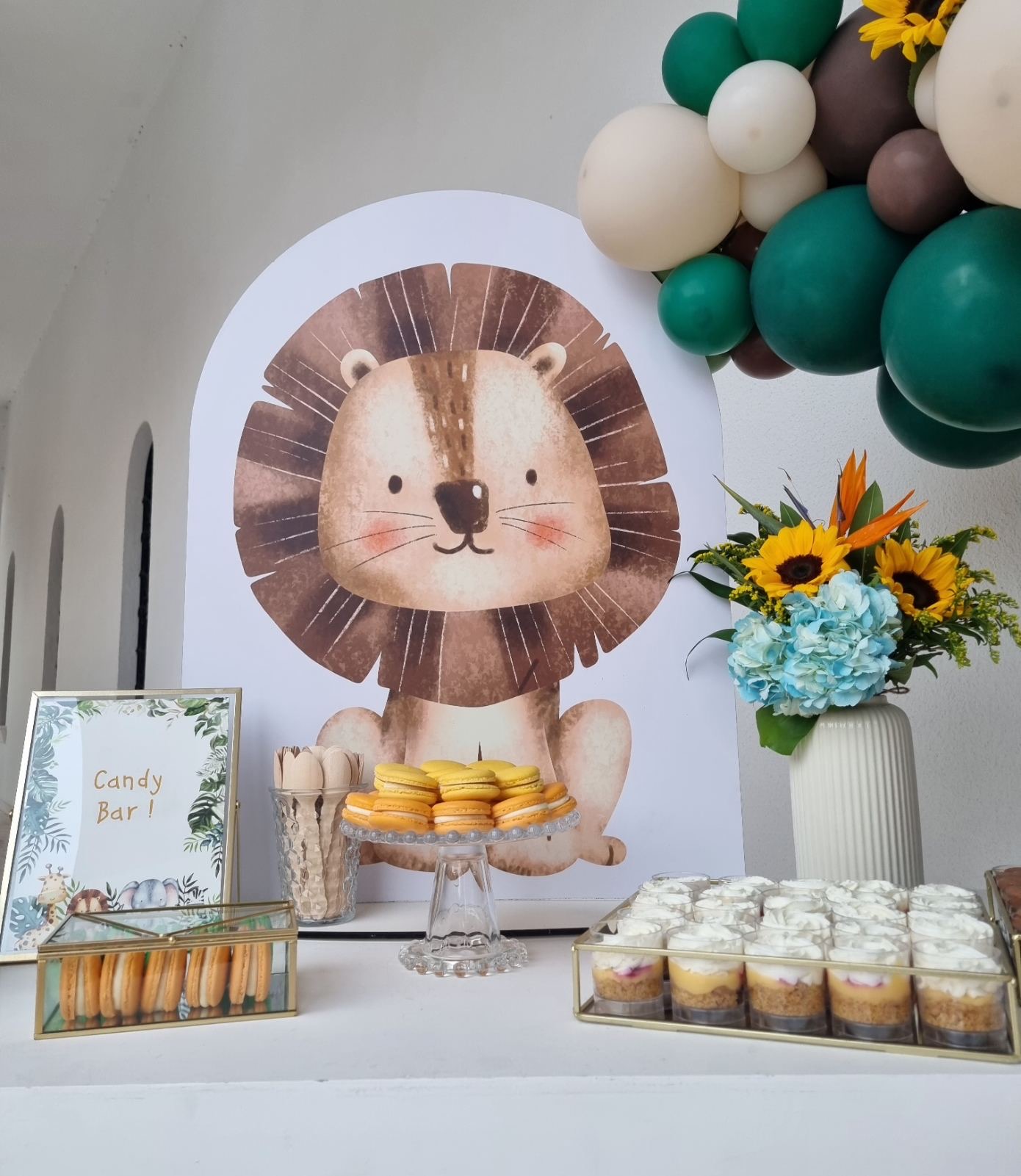Το θέμα που επέλεξαν ήταν το Lion and friends!!! Εμείς προσαρμόσαμε την ιδέα τους στο “trend” επιλέγοντας συνθέσεις με σιελ ορτανσίες και ηλίανθους και πράσινα φυλλώματα, διατηρώντας μια αίσθηση tropical!!!