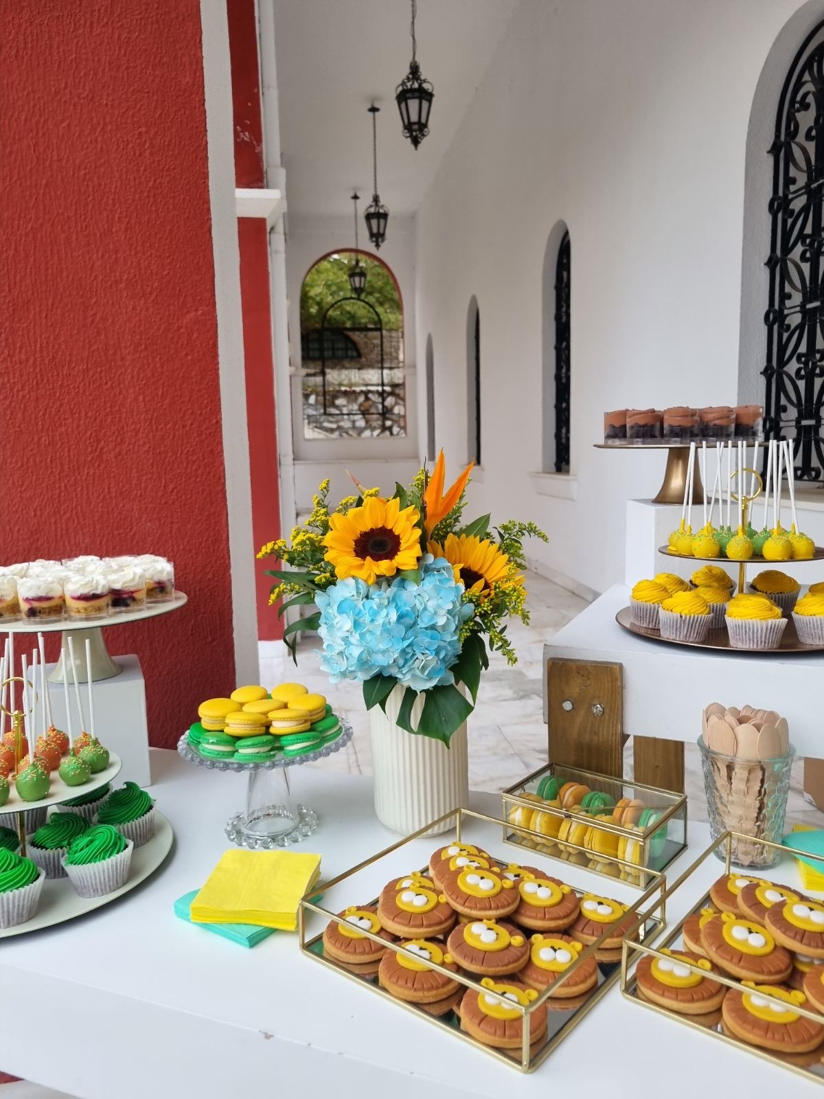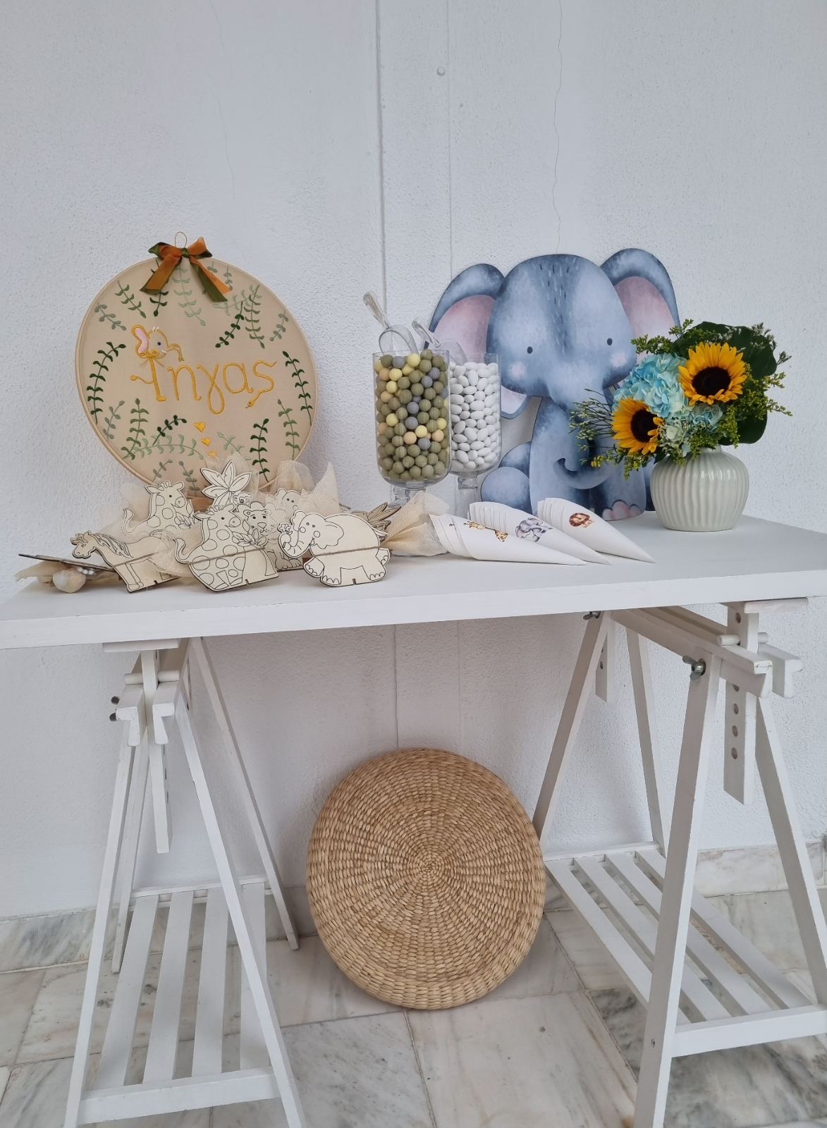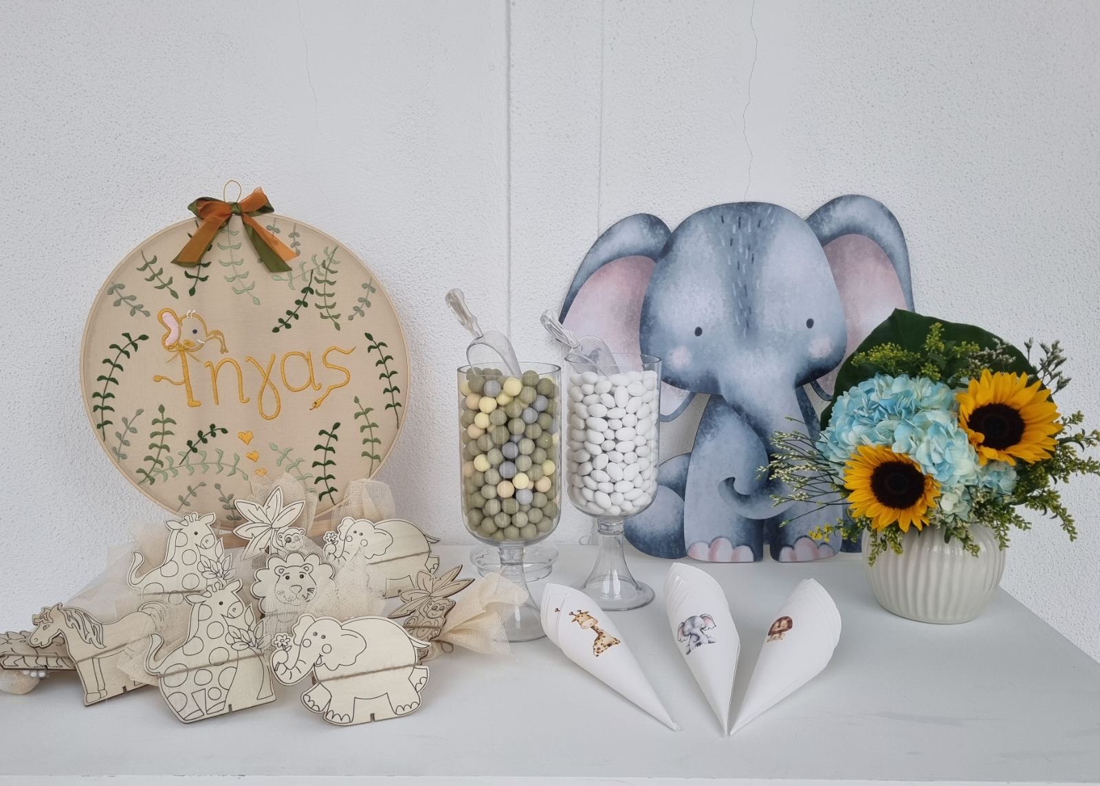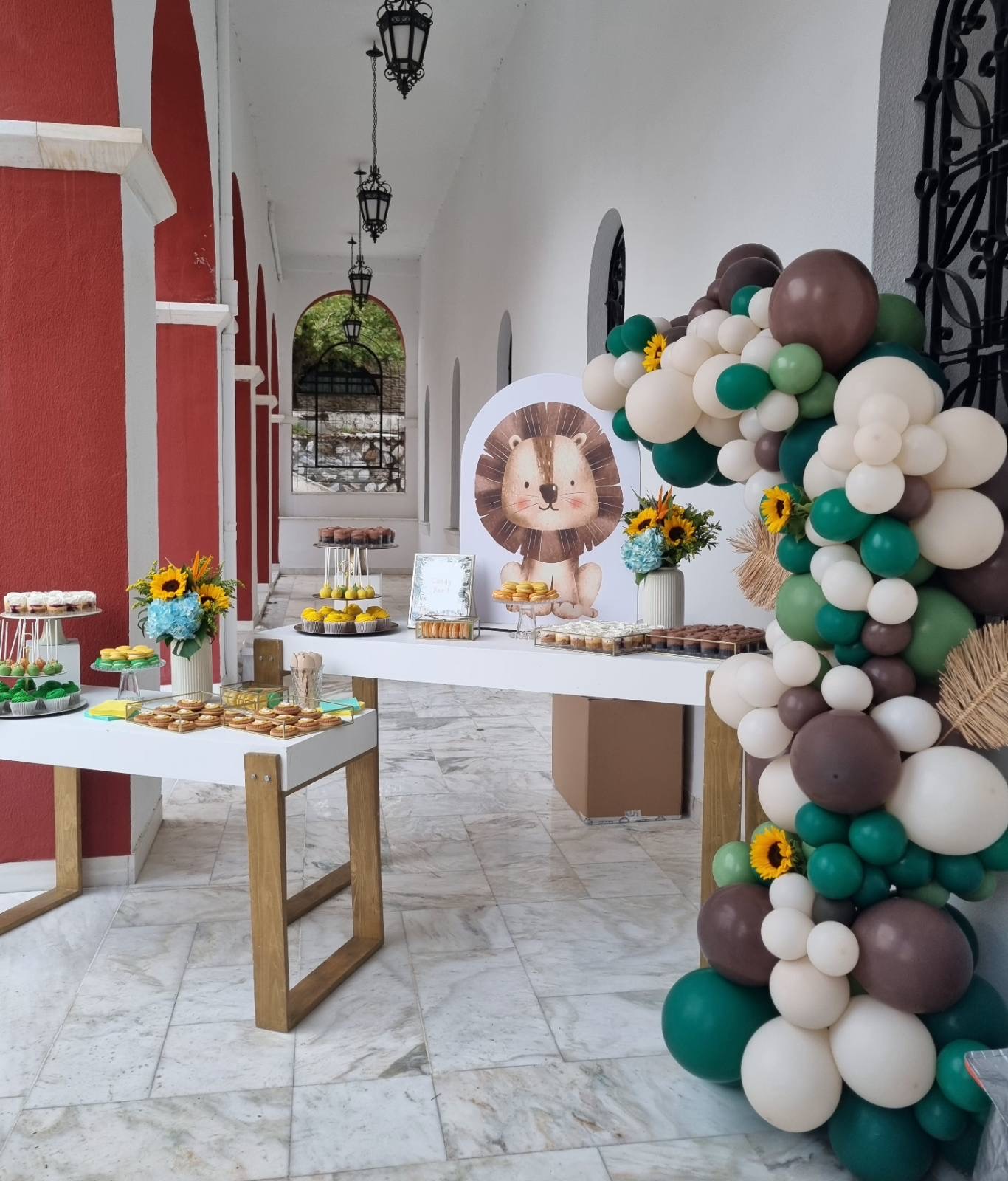 Το θέμα που επέλεξαν ήταν το Lion and friends!!! Εμείς προσαρμόσαμε την ιδέα τους στο “trend” επιλέγοντας συνθέσεις με σιελ ορτανσίες και ηλίανθους και πράσινα φυλλώματα, διατηρώντας μια αίσθηση tropical!!!