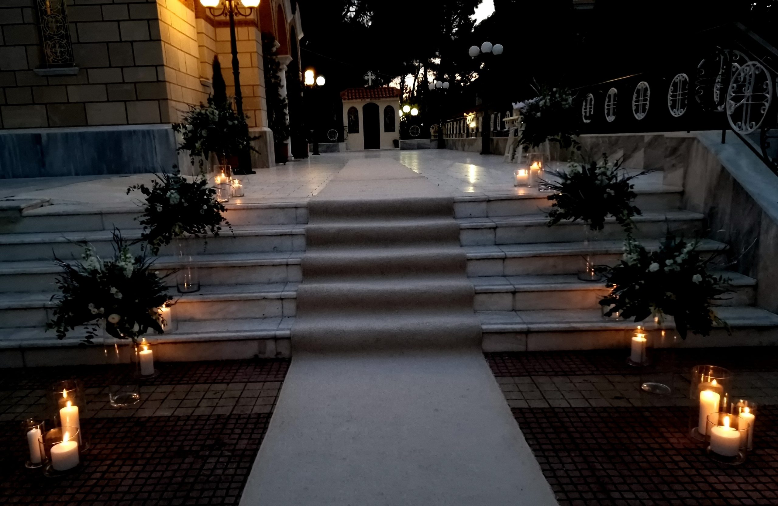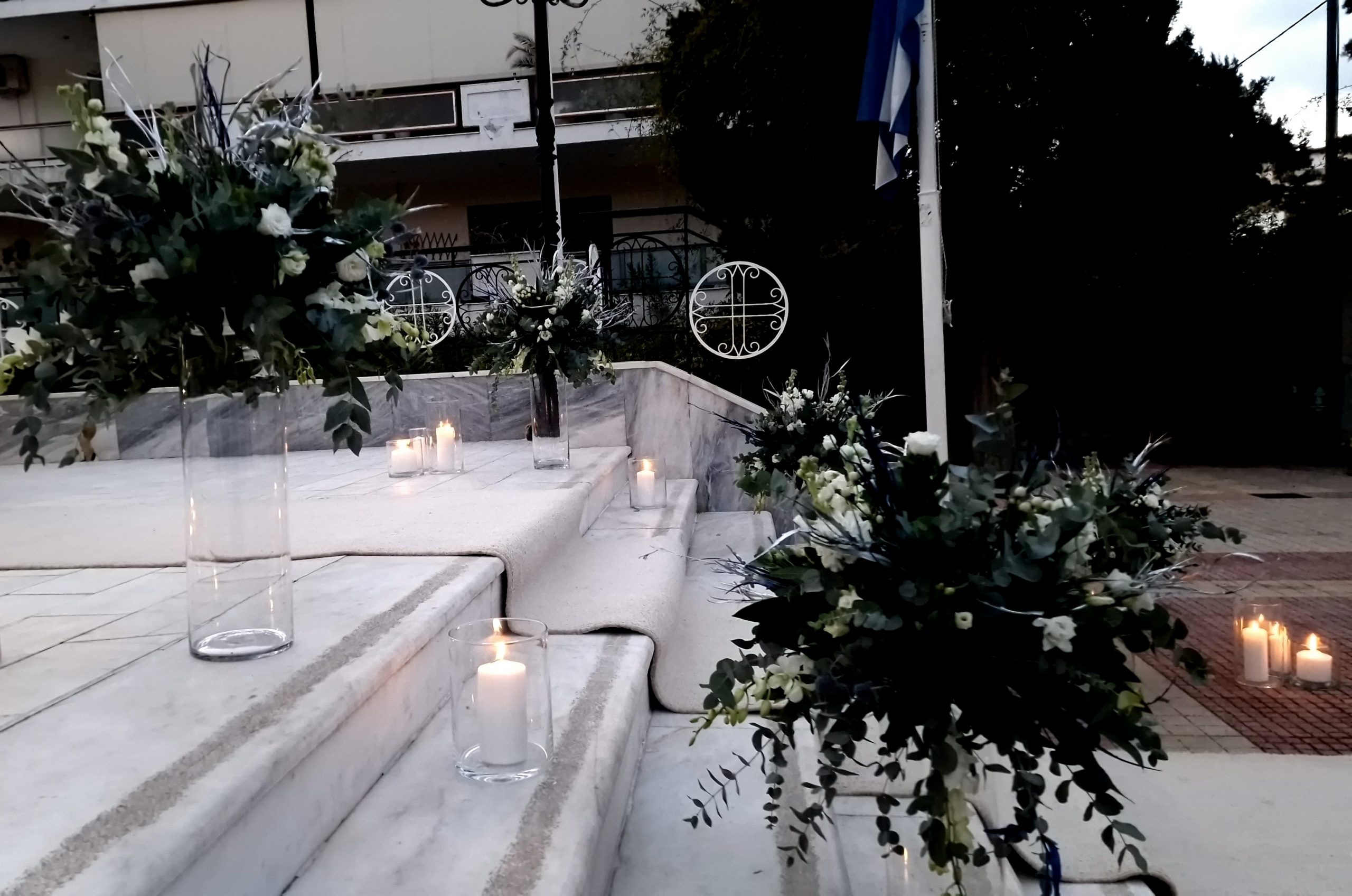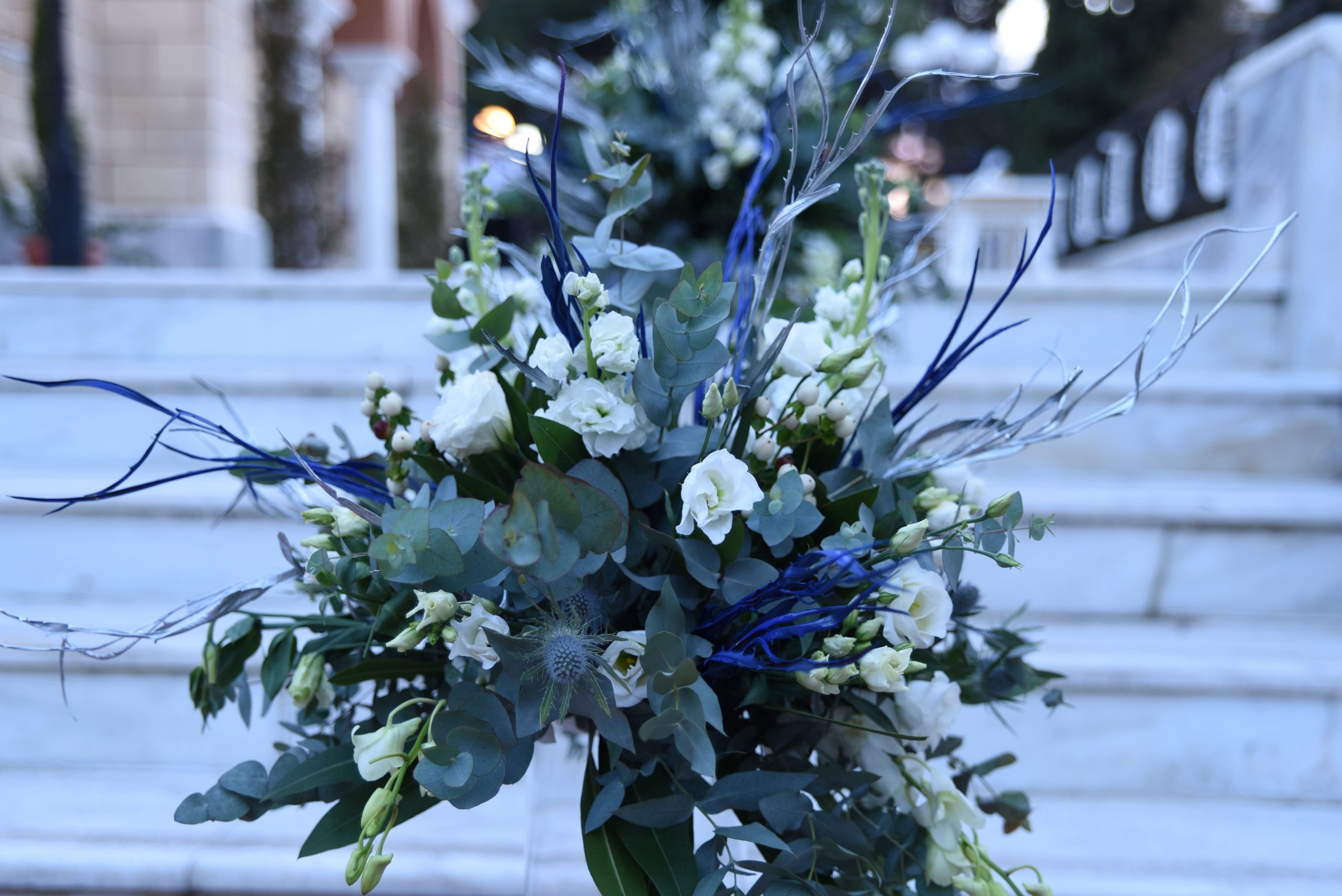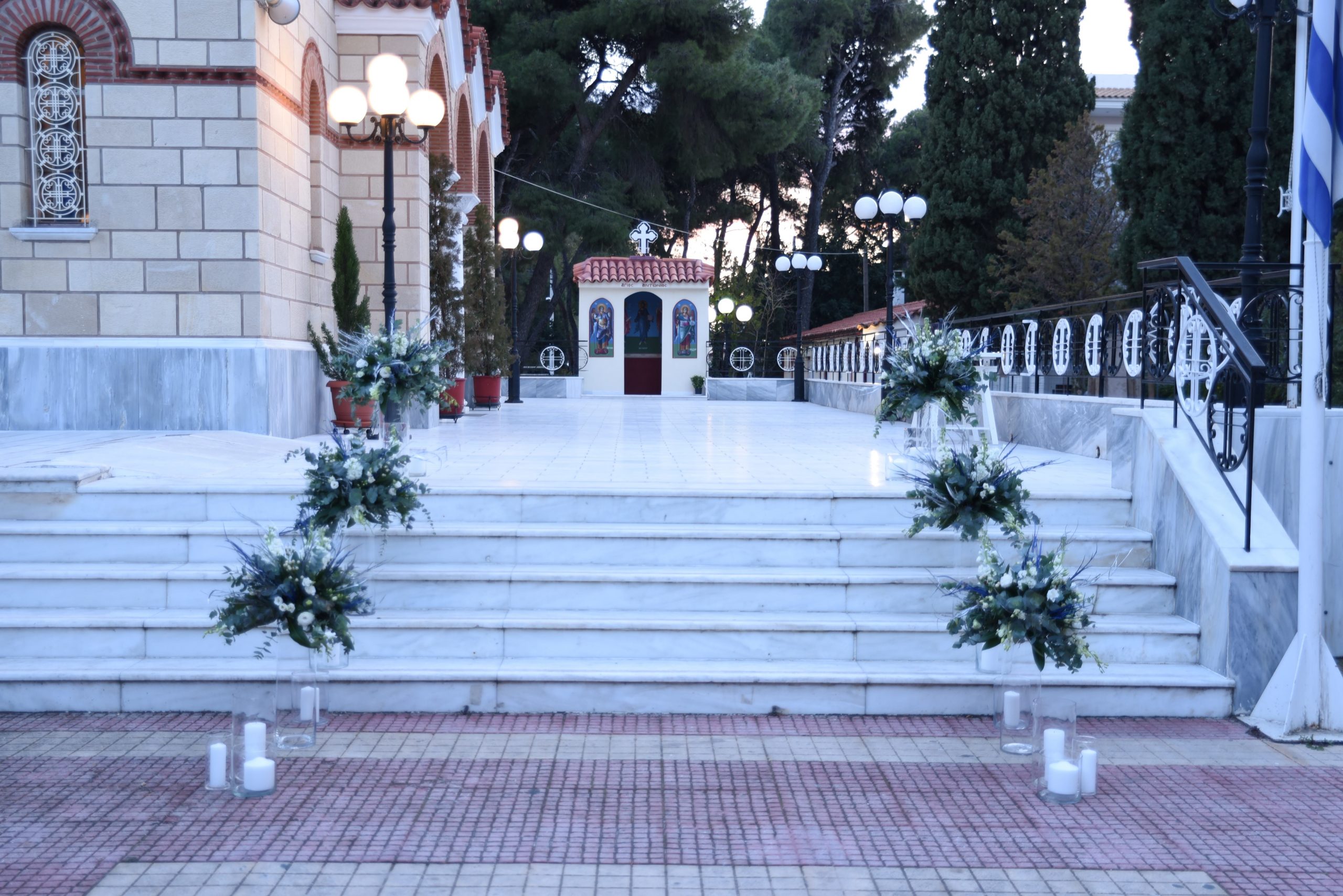 The floral decoration of the church was based exclusively on a palette balanced between white, blue and green with gold and silver touches. In the sanctuary, tall arrangements frame the sacrament table with elegance and respect. The choice of flowers and the vertical development of the arrangements give height and nobility, without competing with the space or the importance of the ceremony. In the outdoor area, on the steps and along the entrance, the floral arrangements were placed on glass bases, creating a calm, ceremonial rhythm. The candles on the floor enhanced the warmth and light of the moment. The bridal bouquet followed suit – an orchid with movement, texture and an unpretentious elegance that perfectly suited the very beautiful bride.