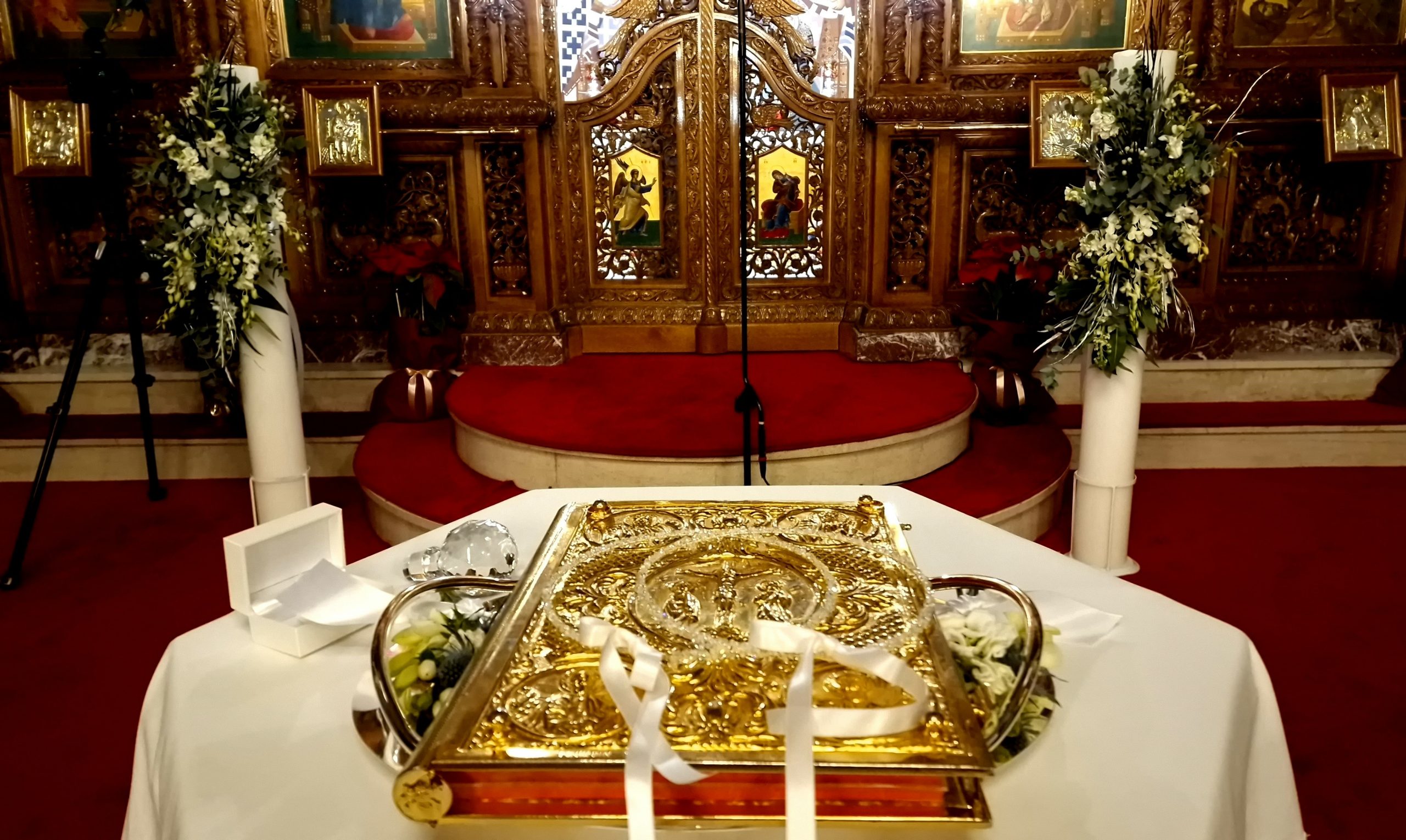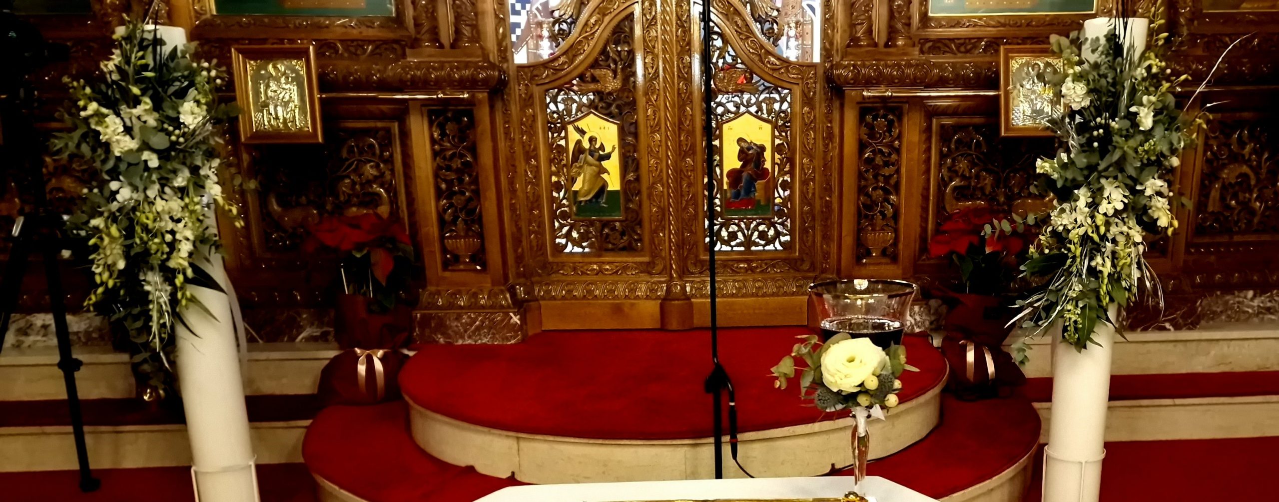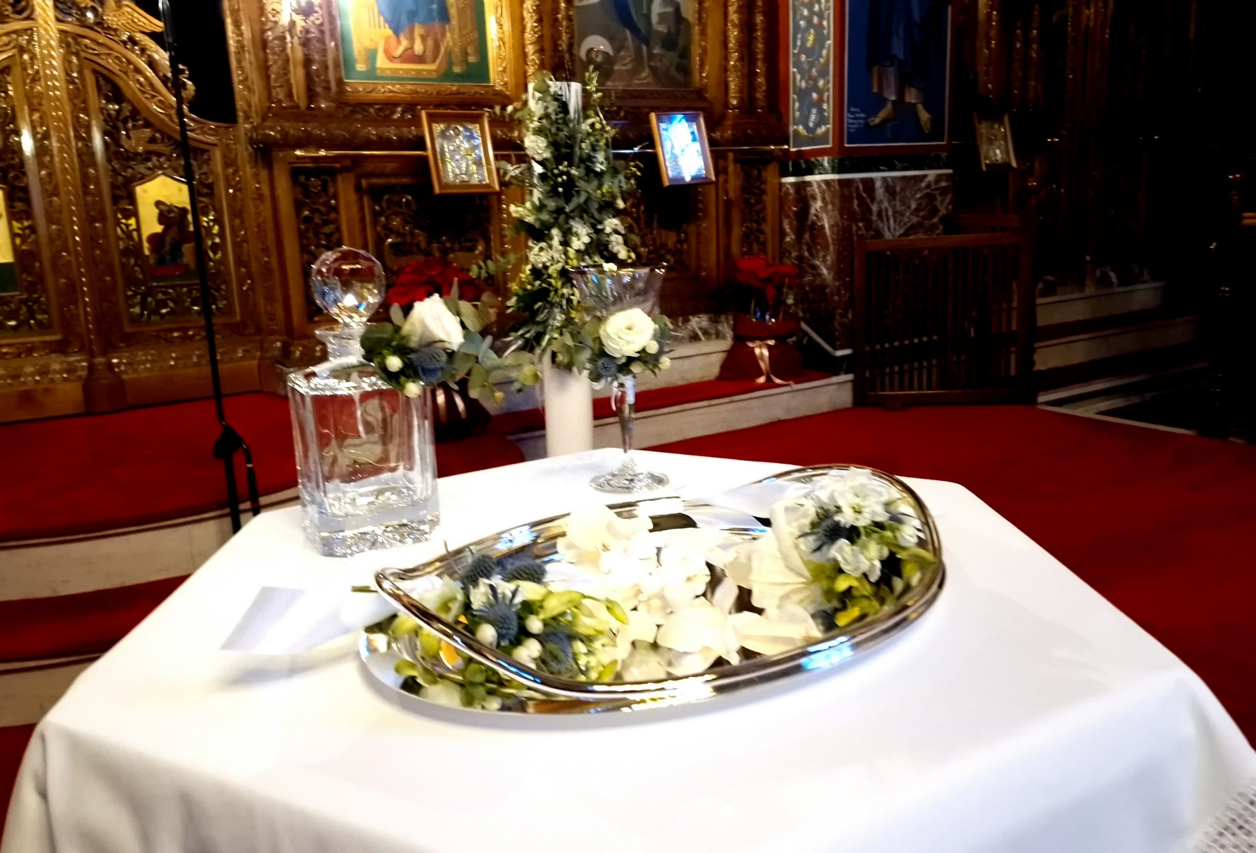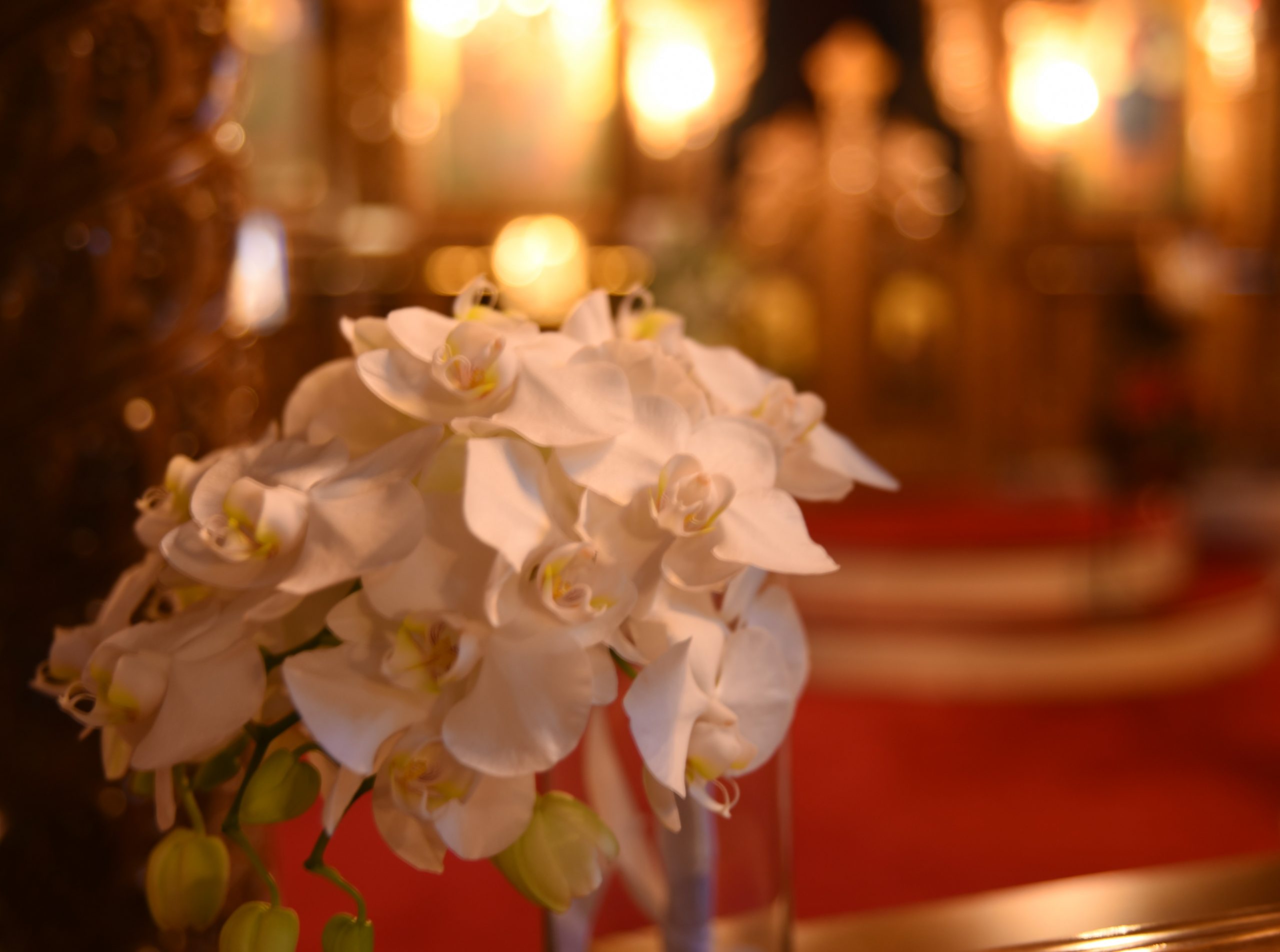 The floral decoration of the church was based exclusively on a palette balanced between white, blue and green with gold and silver touches. In the sanctuary, tall arrangements frame the sacrament table with elegance and respect. The choice of flowers and the vertical development of the arrangements give height and nobility, without competing with the space or the importance of the ceremony. In the outdoor area, on the steps and along the entrance, the floral arrangements were placed on glass bases, creating a calm, ceremonial rhythm. The candles on the floor enhanced the warmth and light of the moment. The bridal bouquet followed suit – an orchid with movement, texture and an unpretentious elegance that perfectly suited the very beautiful bride.