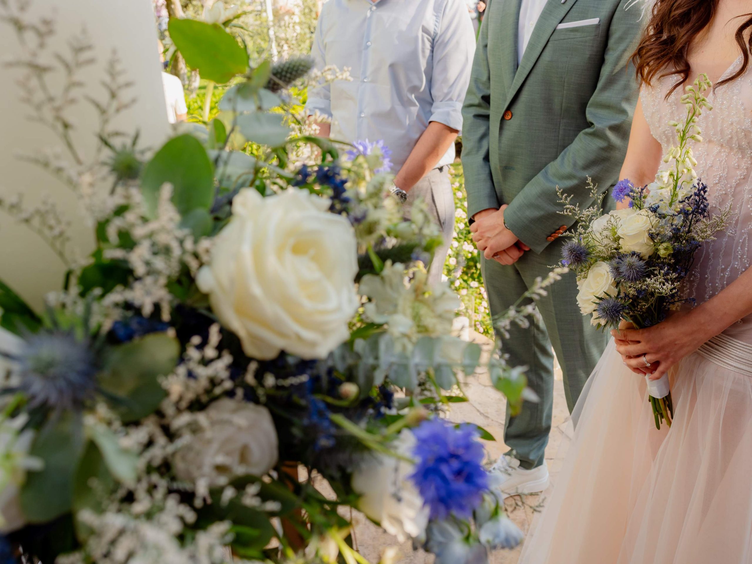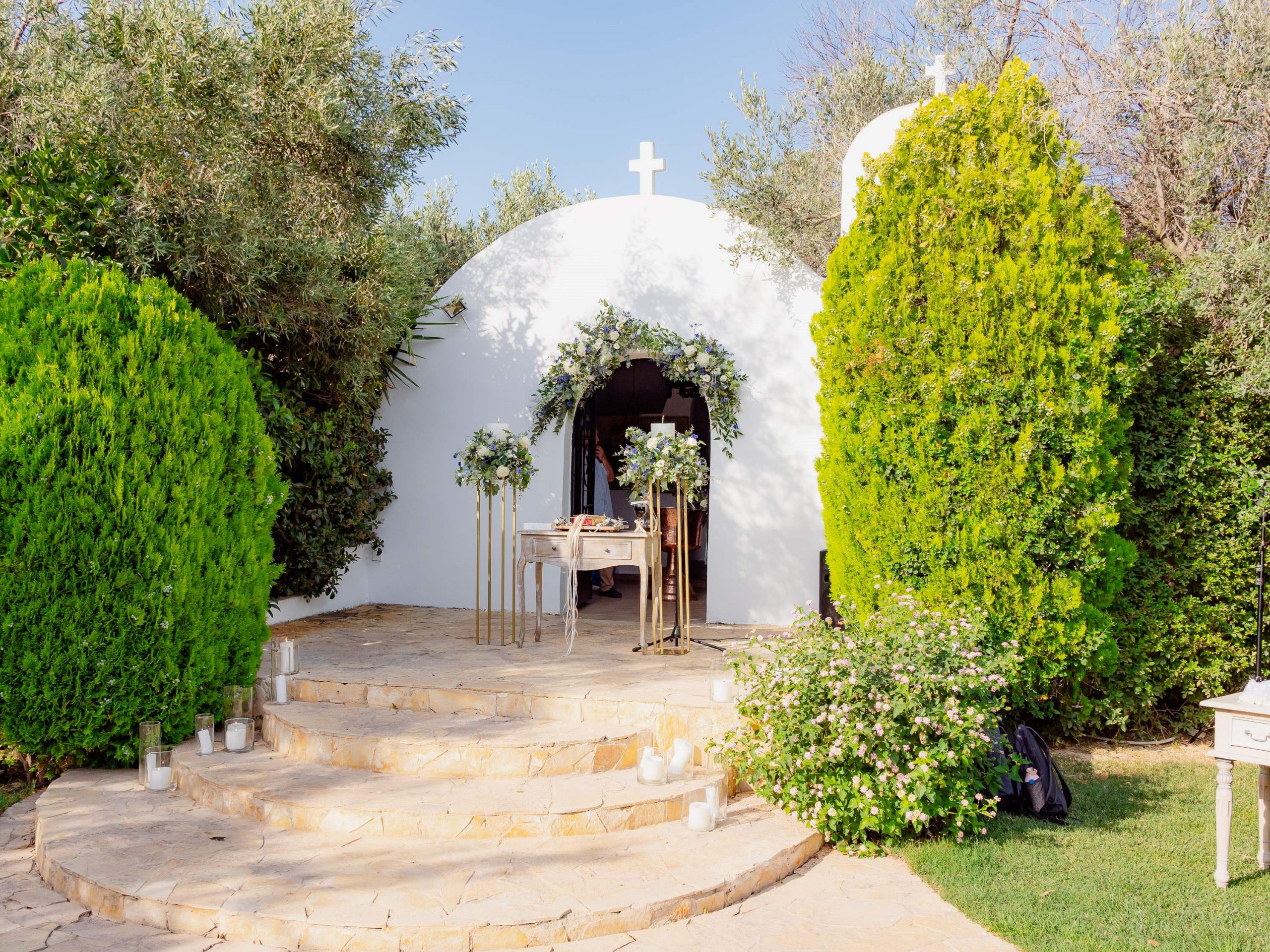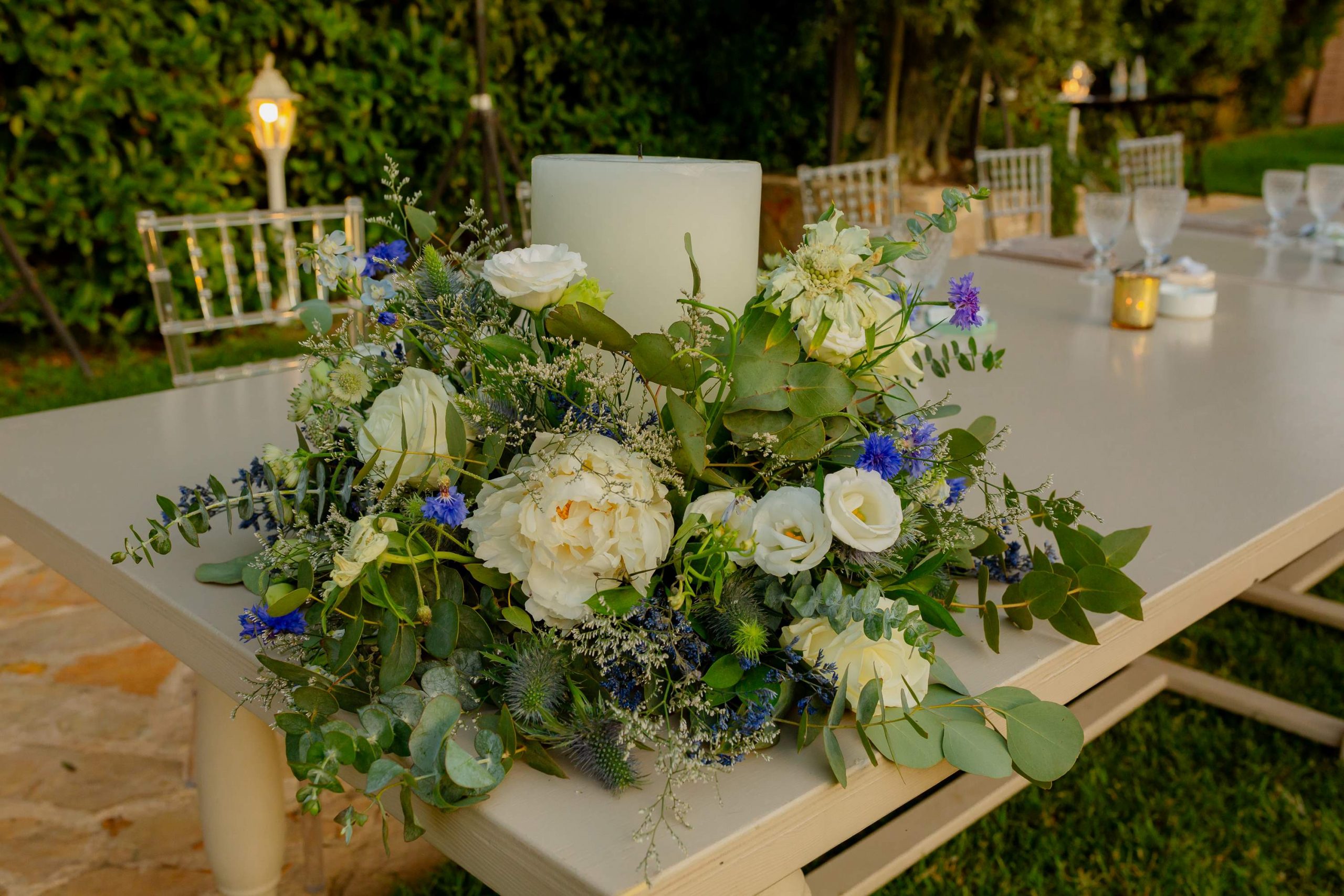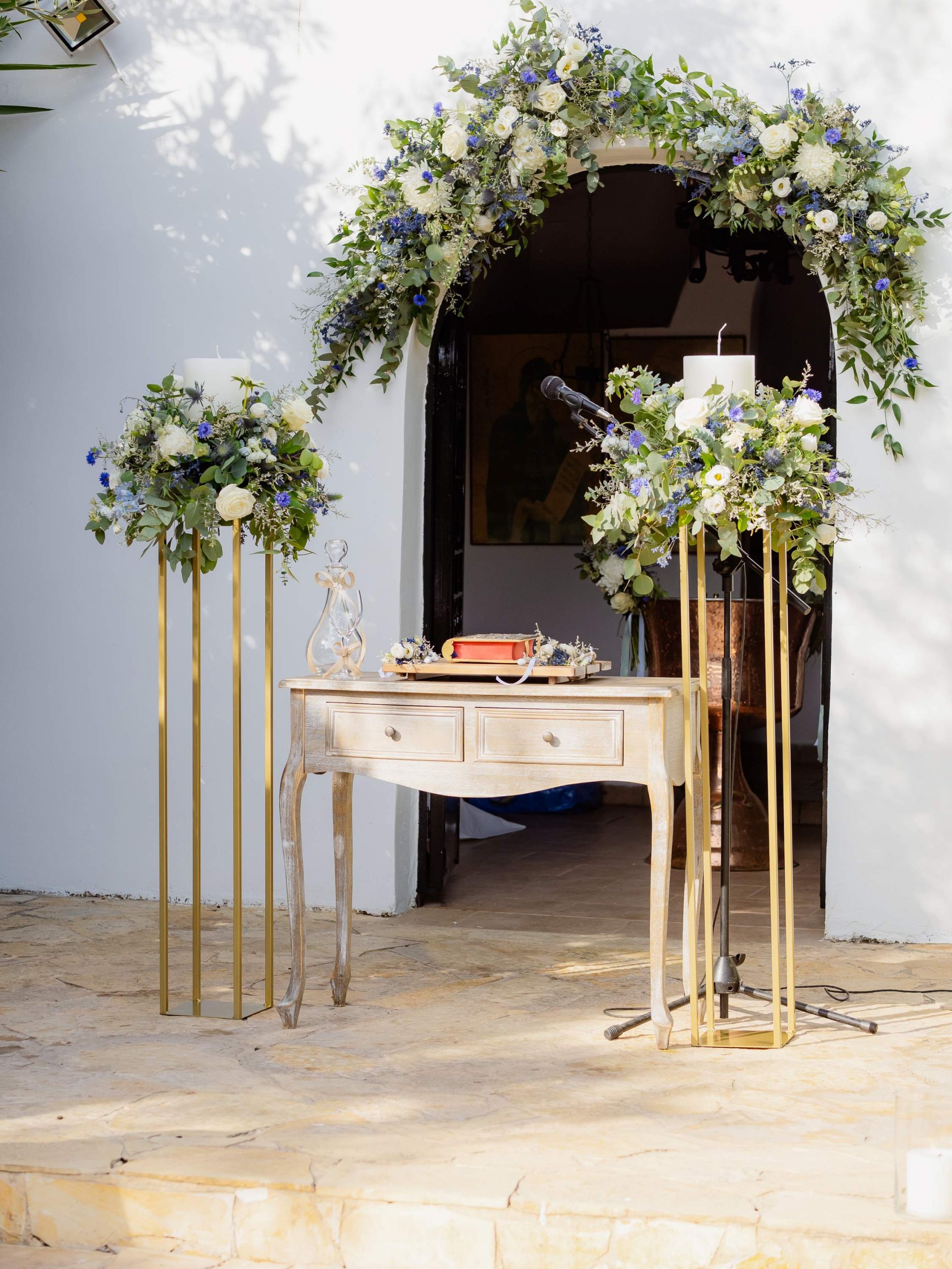 The aesthetics of the wedding were based on naturalness and discreet elegance, with a common line from the bridal bouquet to the reception. The flowers were chosen with freshness and balance in mind, without strong contrasts or exaggerations. The decoration was in natural tones, with white and blue flowers and discreet touches of gold. In the ceremony area, the floral arrangements harmoniously framed the setting, creating a sense of calm and freshness, while the details of the baptism were discreetly integrated into the overall aesthetic. The baptism was captured through thoughtful elements: candle, baptismal accessories and thematic details, all carefully designed to complement the romantic atmosphere of the day and highlight the theme. The materials, textures and color combinations created a warm and balanced result.