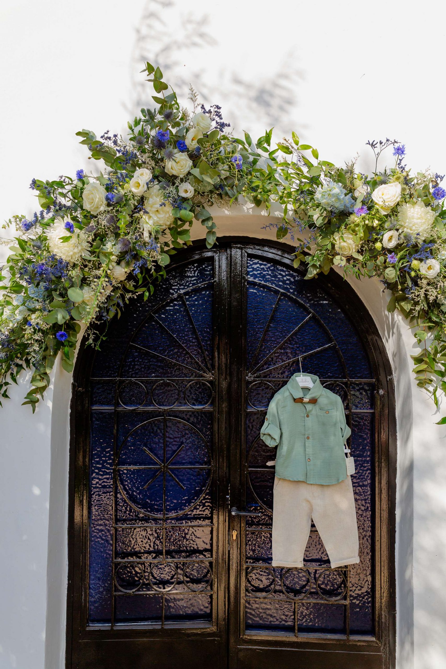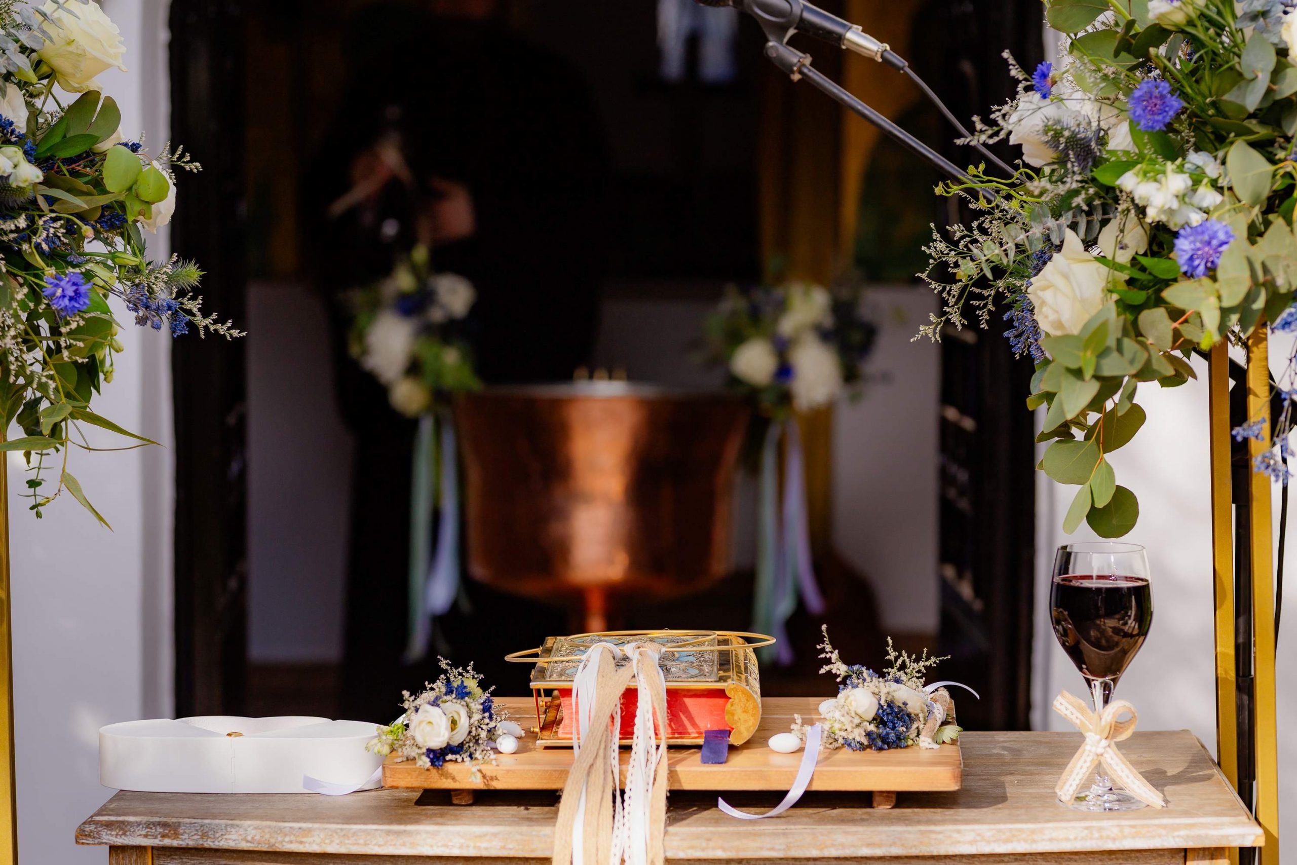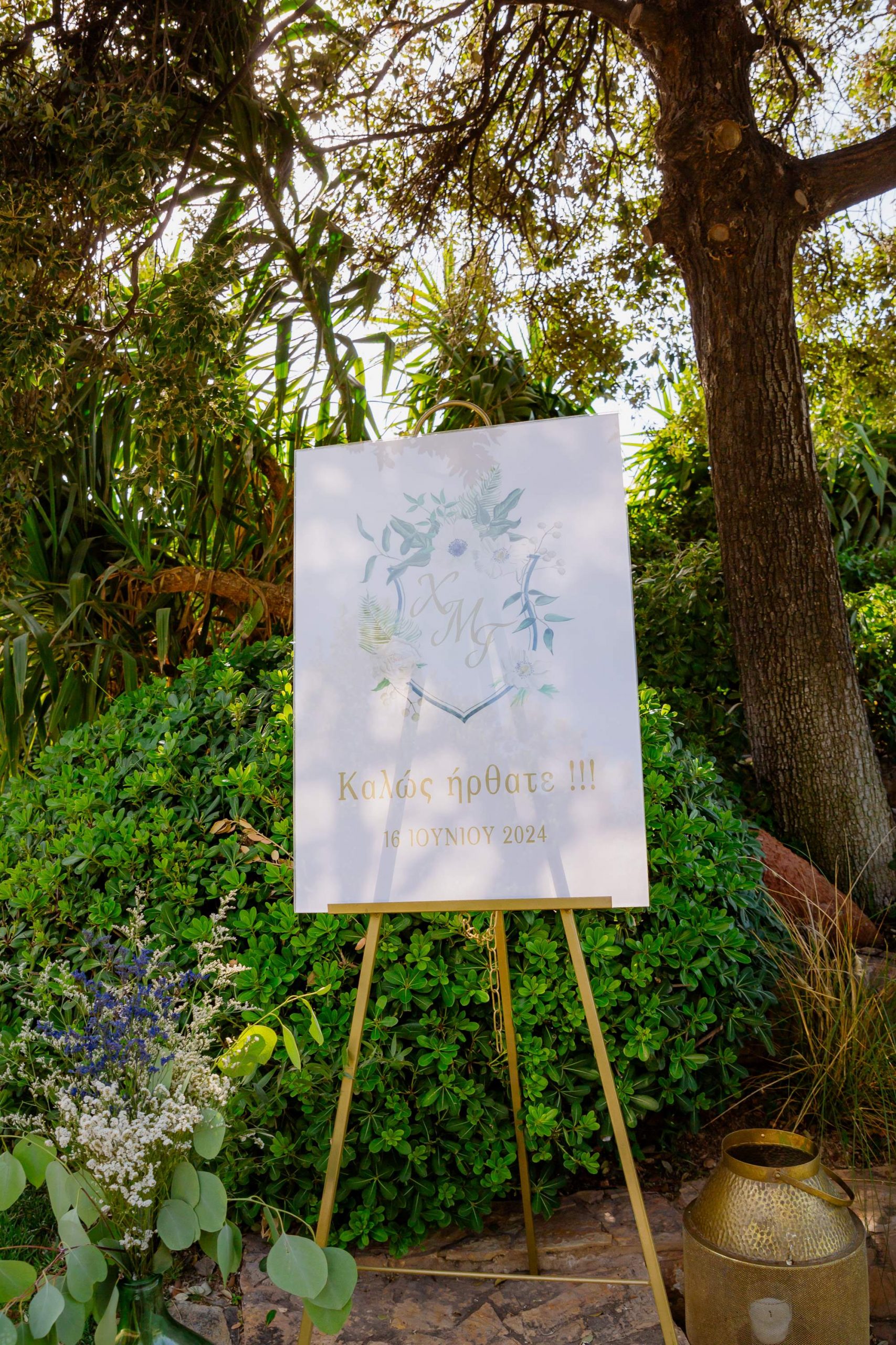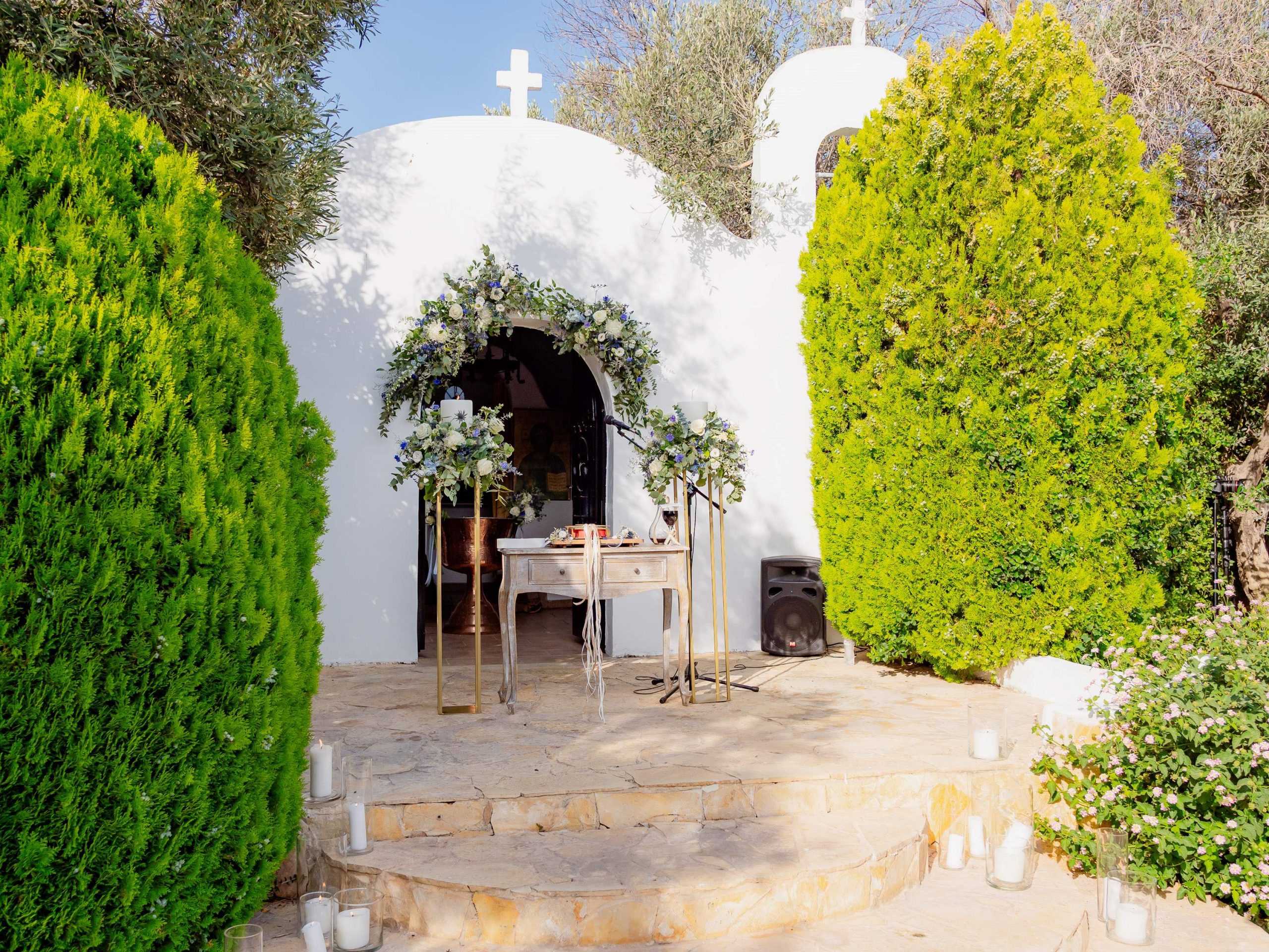 The aesthetics of the wedding were based on naturalness and discreet elegance, with a common line from the bridal bouquet to the reception. The flowers were chosen with freshness and balance in mind, without strong contrasts or exaggerations. The decoration was in natural tones, with white and blue flowers and discreet touches of gold. In the ceremony area, the floral arrangements harmoniously framed the setting, creating a sense of calm and freshness, while the details of the baptism were discreetly integrated into the overall aesthetic. The baptism was captured through thoughtful elements: candle, baptismal accessories and thematic details, all carefully designed to complement the romantic atmosphere of the day and highlight the theme. The materials, textures and color combinations created a warm and balanced result.