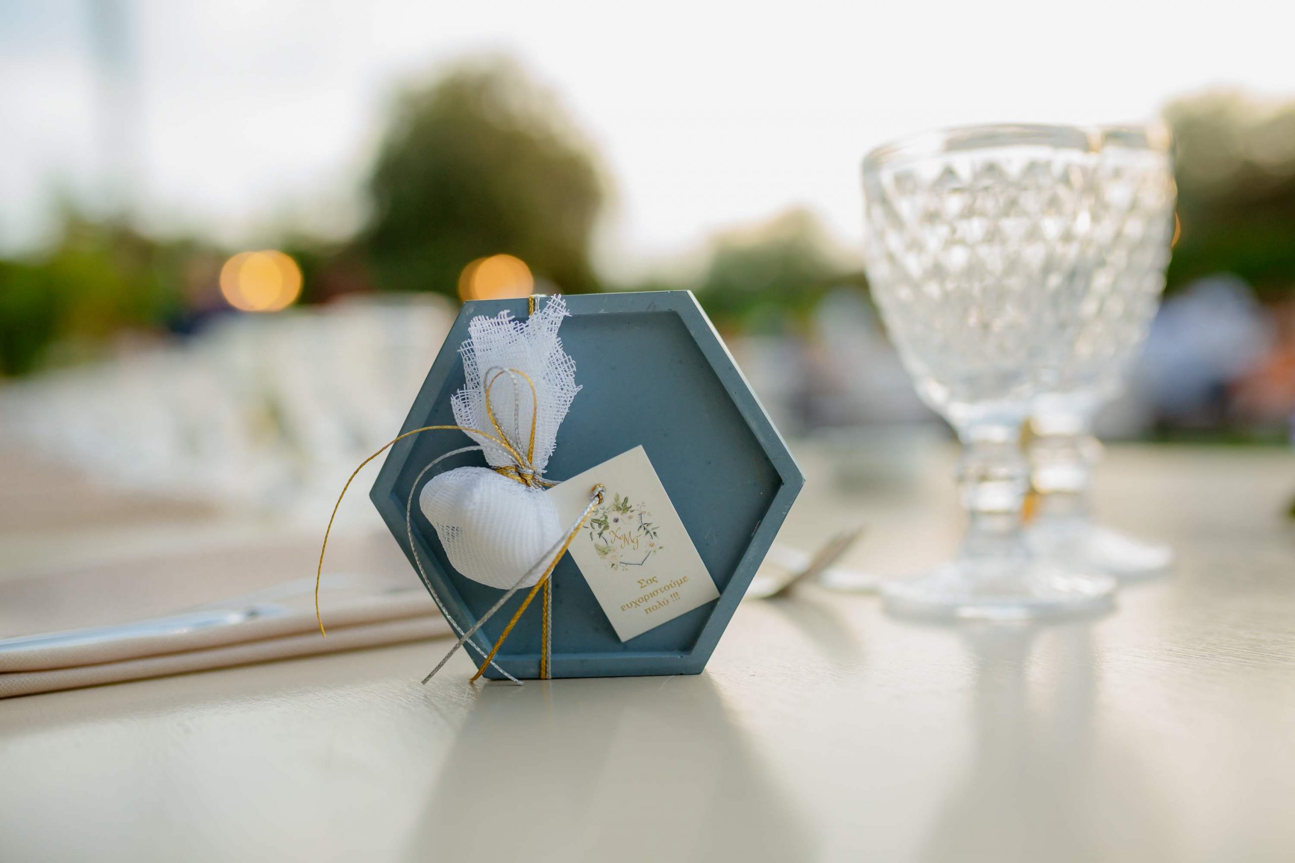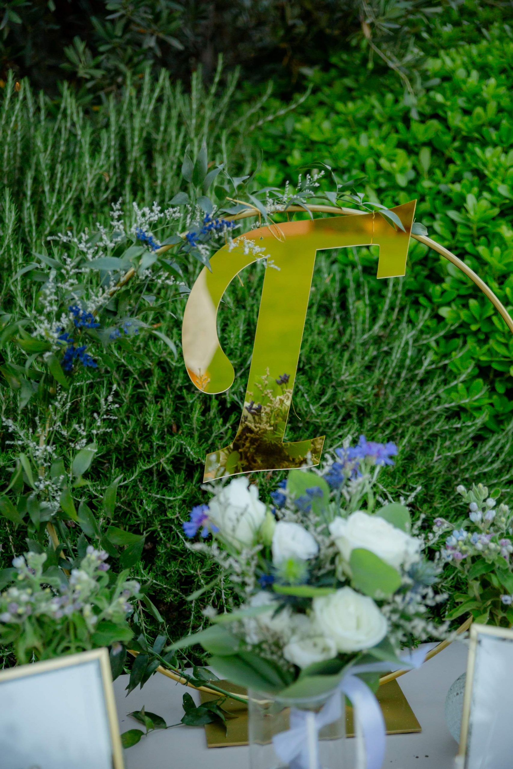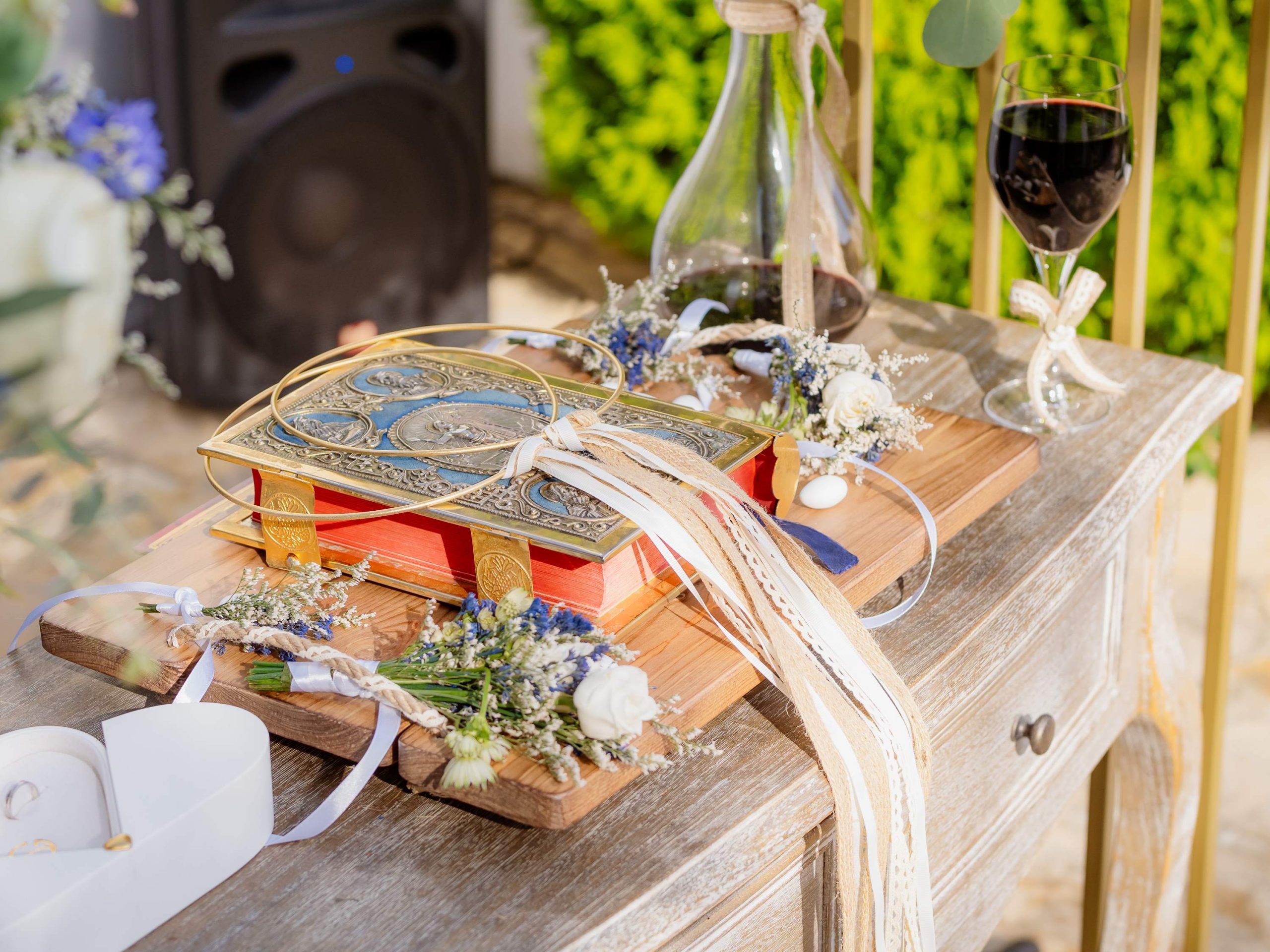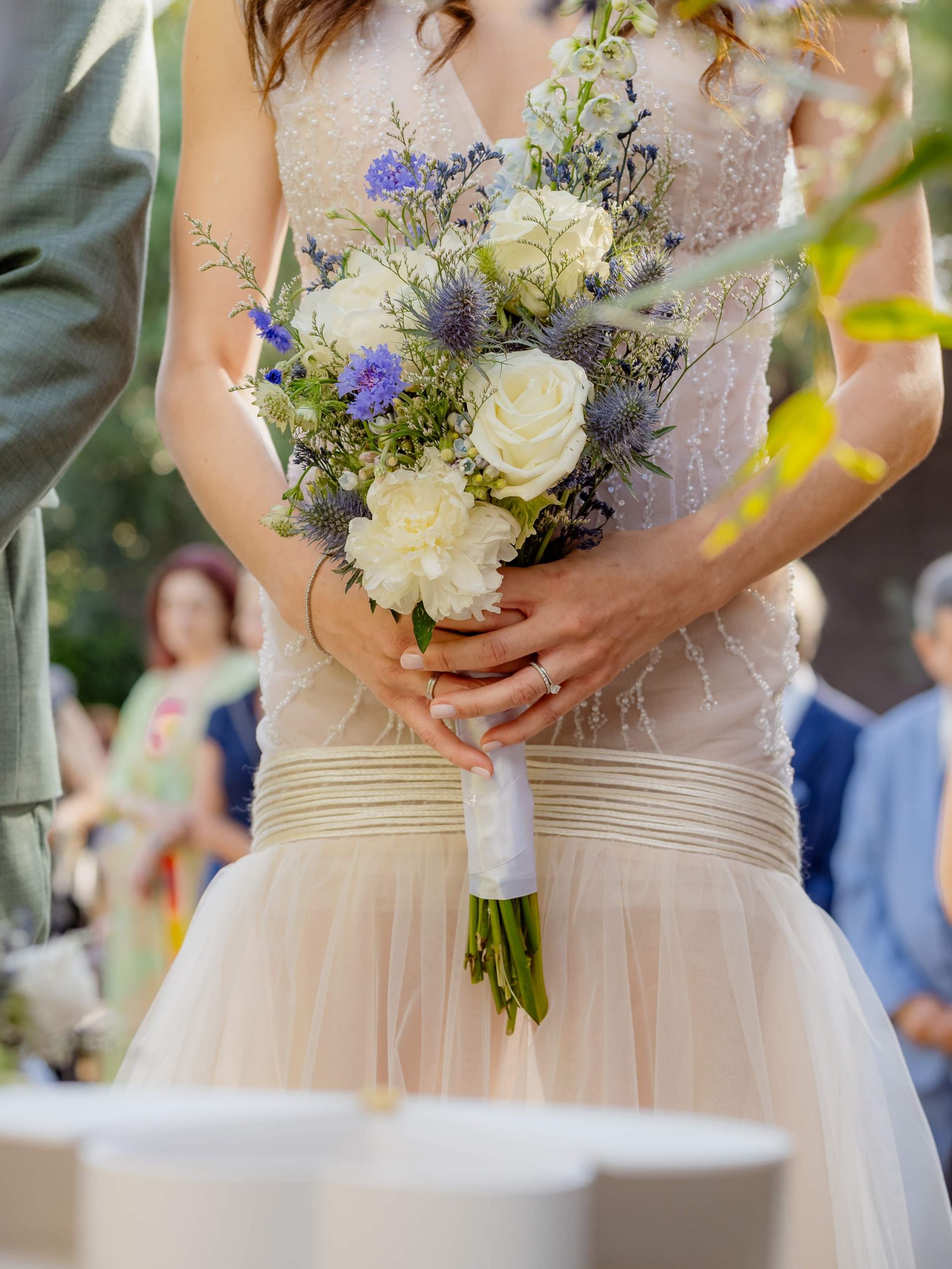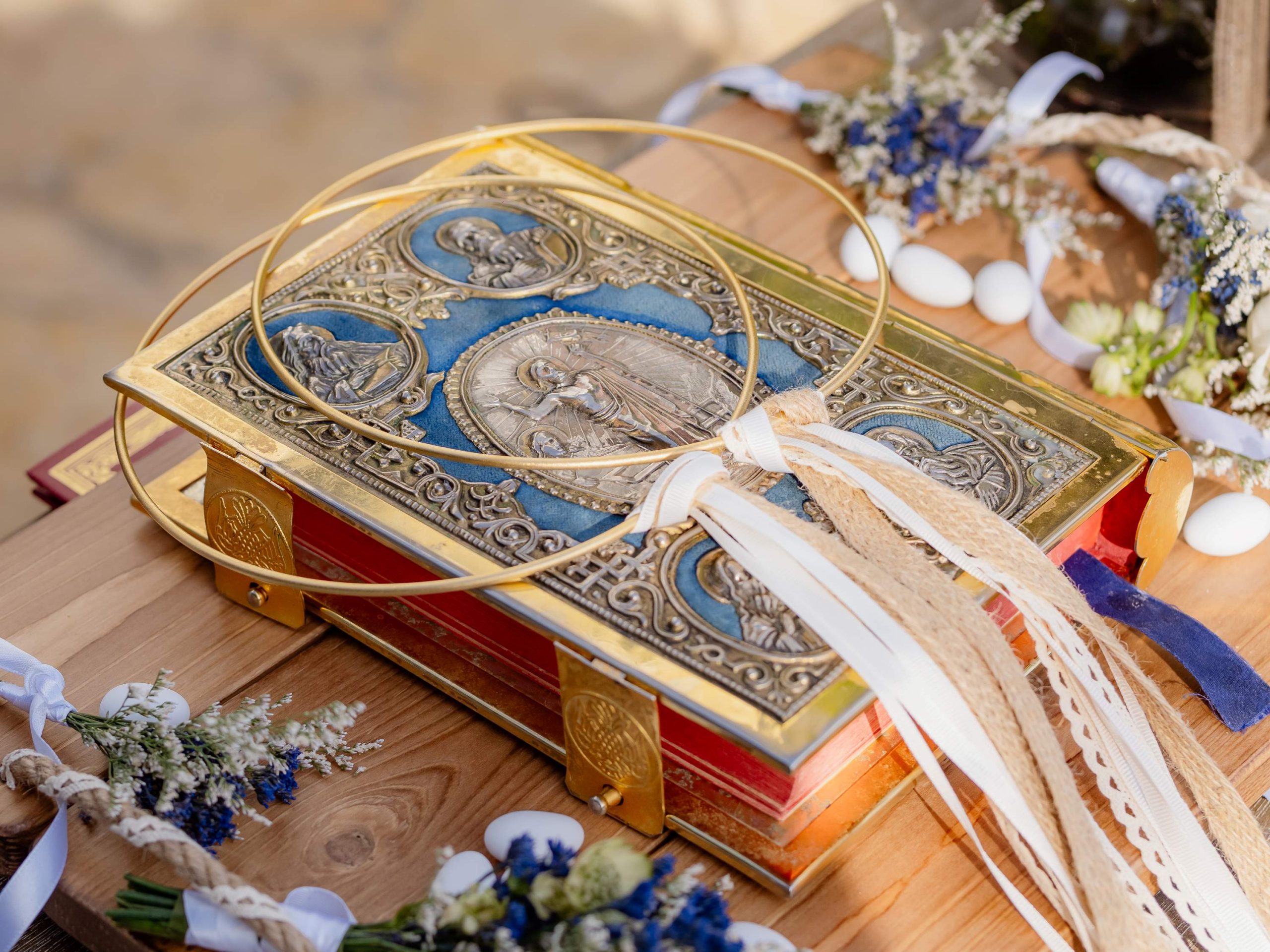 The aesthetics of the wedding were based on naturalness and discreet elegance, with a common line from the bridal bouquet to the reception. The flowers were chosen with freshness and balance in mind, without strong contrasts or exaggerations. The decoration was in natural tones, with white and blue flowers and discreet touches of gold. In the ceremony area, the floral arrangements harmoniously framed the setting, creating a sense of calm and freshness, while the details of the baptism were discreetly integrated into the overall aesthetic. The baptism was captured through thoughtful elements: candle, baptismal accessories and thematic details, all carefully designed to complement the romantic atmosphere of the day and highlight the theme. The materials, textures and color combinations created a warm and balanced result.