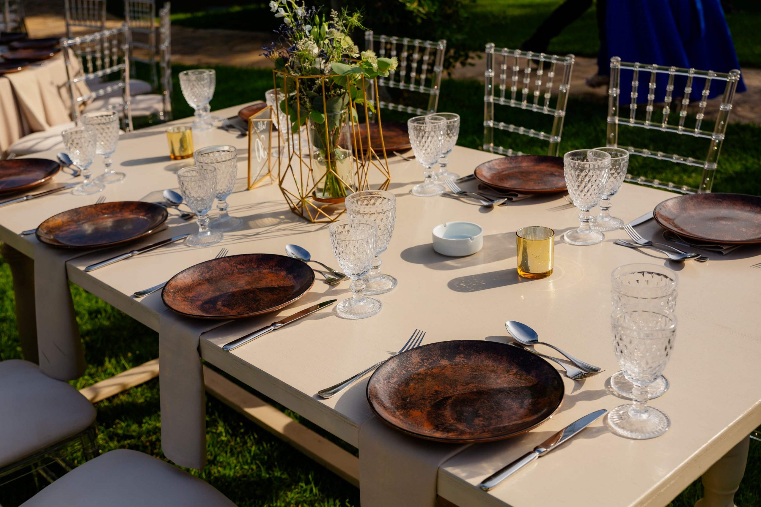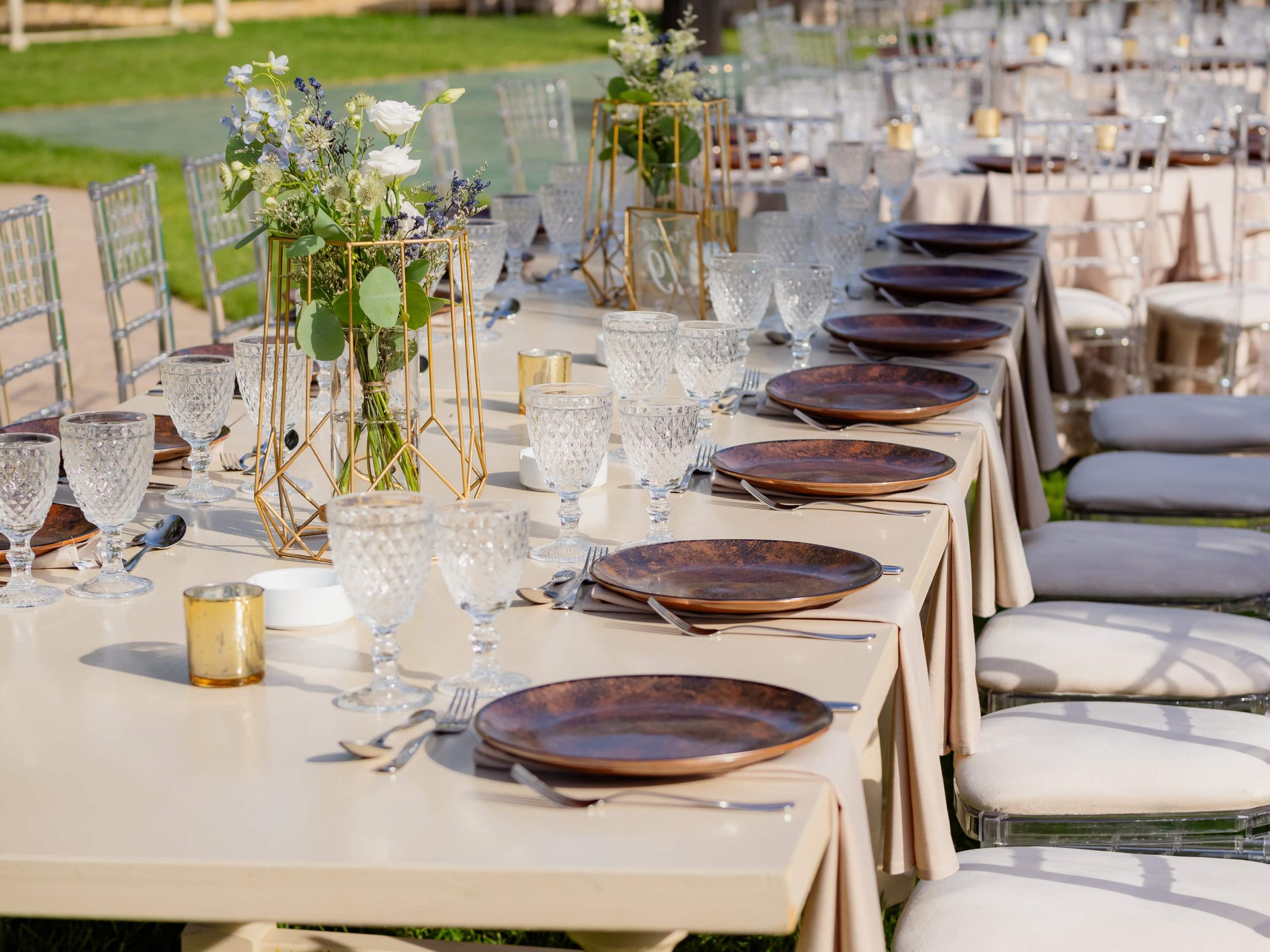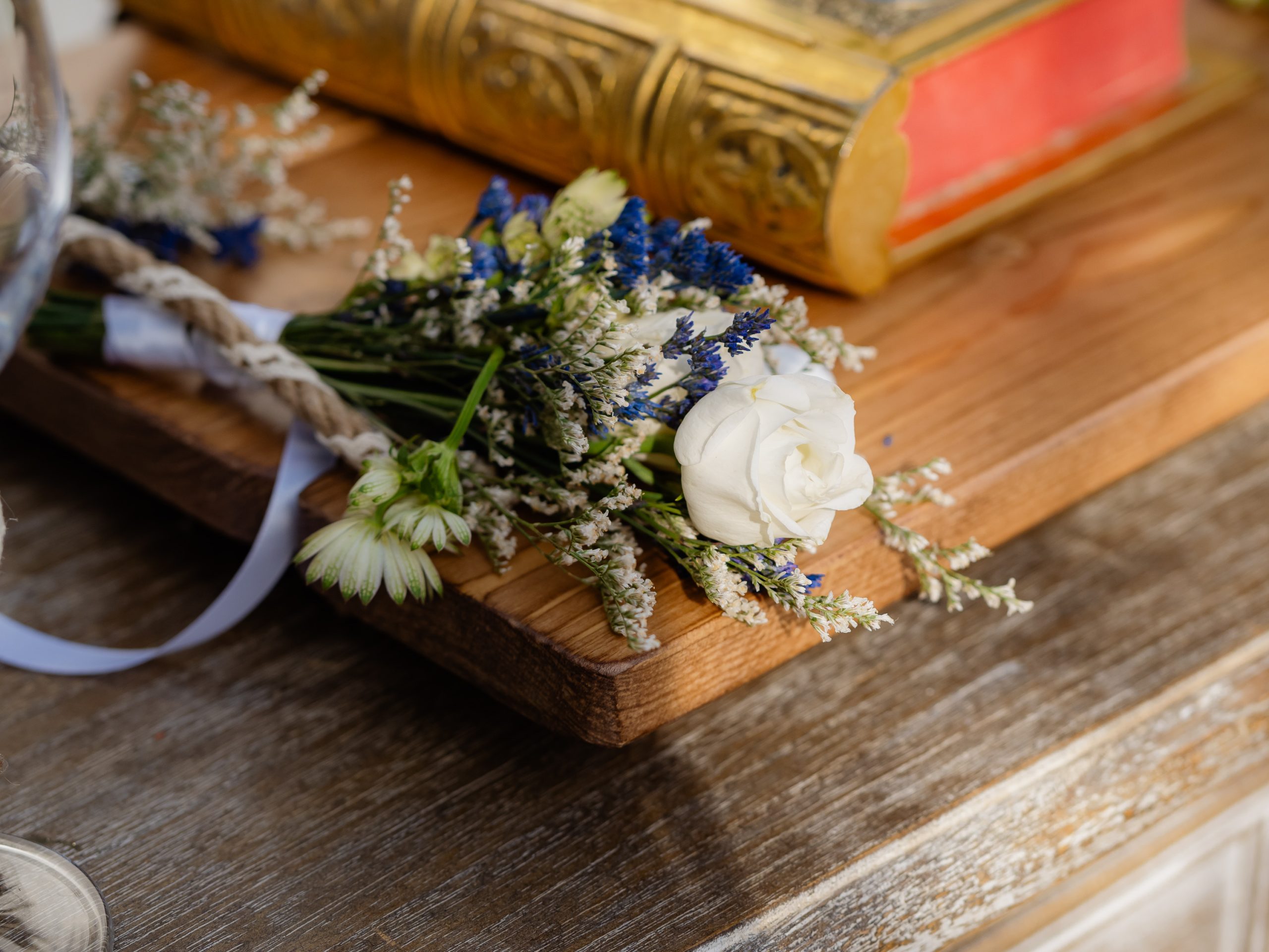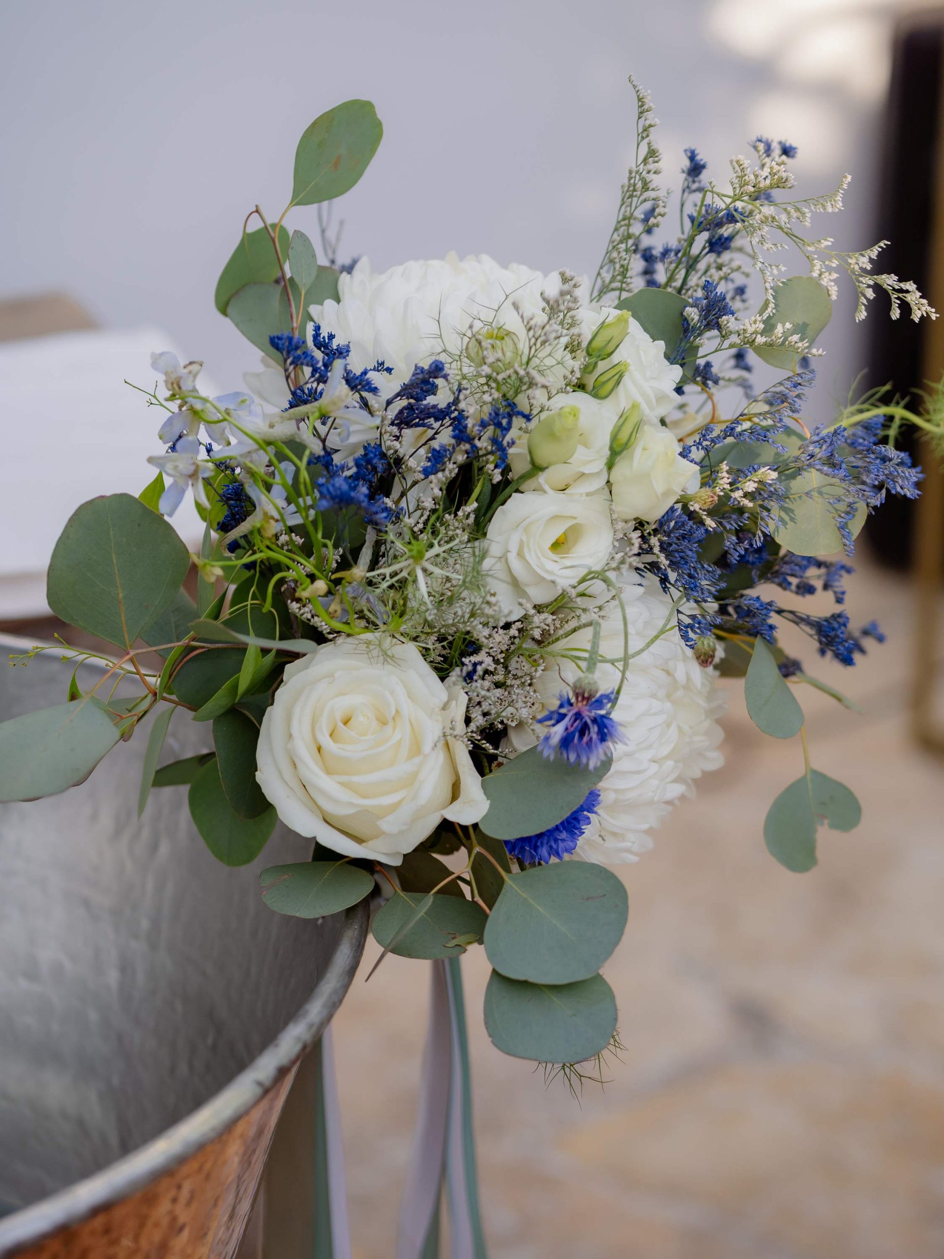 The aesthetics of the wedding were based on naturalness and discreet elegance, with a common line from the bridal bouquet to the reception. The flowers were chosen with freshness and balance in mind, without strong contrasts or exaggerations. The decoration was in natural tones, with white and blue flowers and discreet touches of gold. In the ceremony area, the floral arrangements harmoniously framed the setting, creating a sense of calm and freshness, while the details of the baptism were discreetly integrated into the overall aesthetic. The baptism was captured through thoughtful elements: candle, baptismal accessories and thematic details, all carefully designed to complement the romantic atmosphere of the day and highlight the theme. The materials, textures and color combinations created a warm and balanced result.
