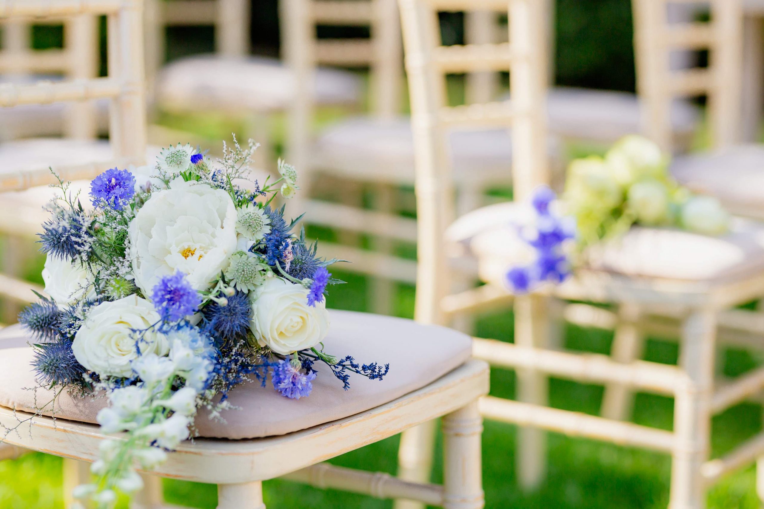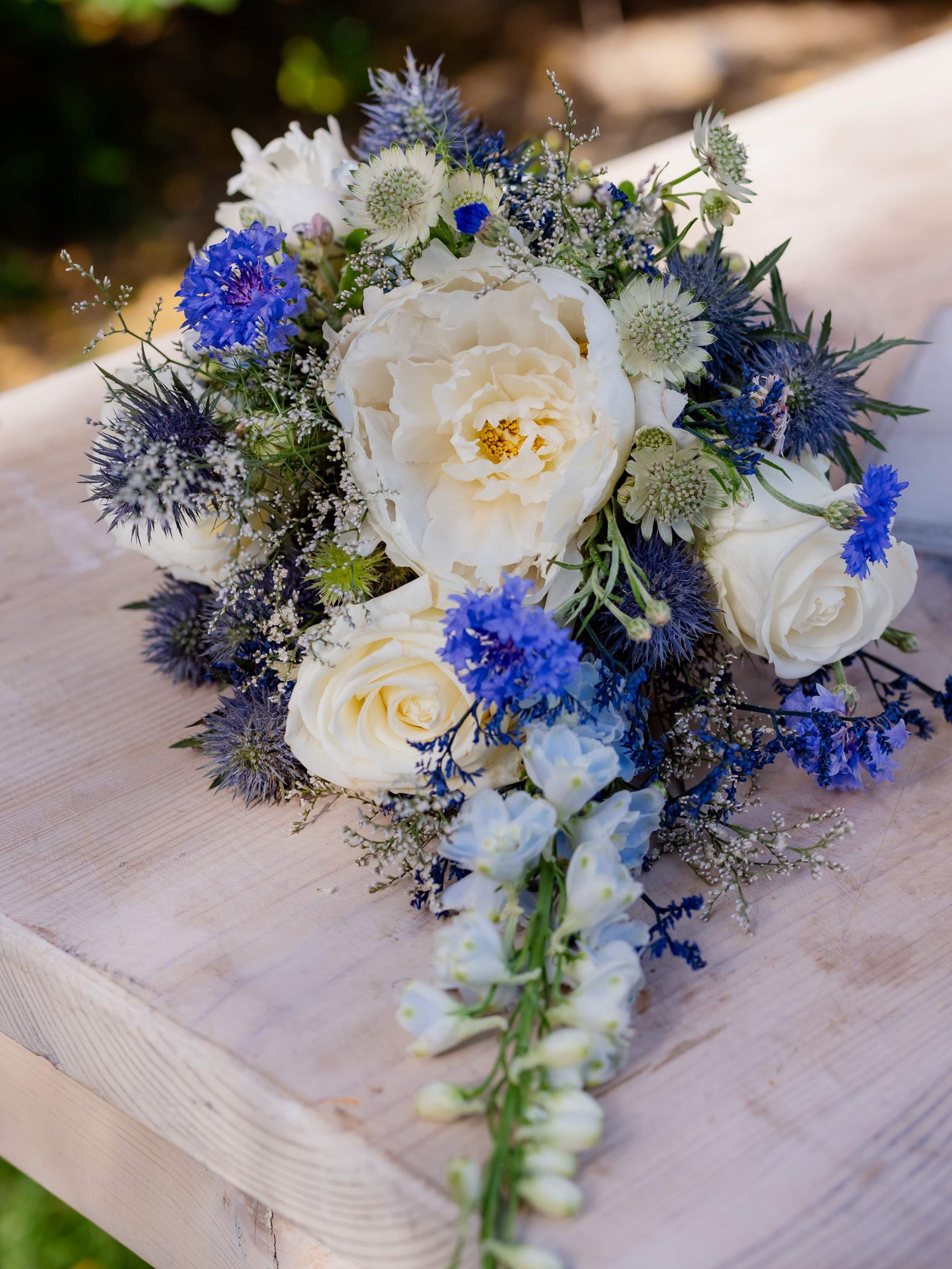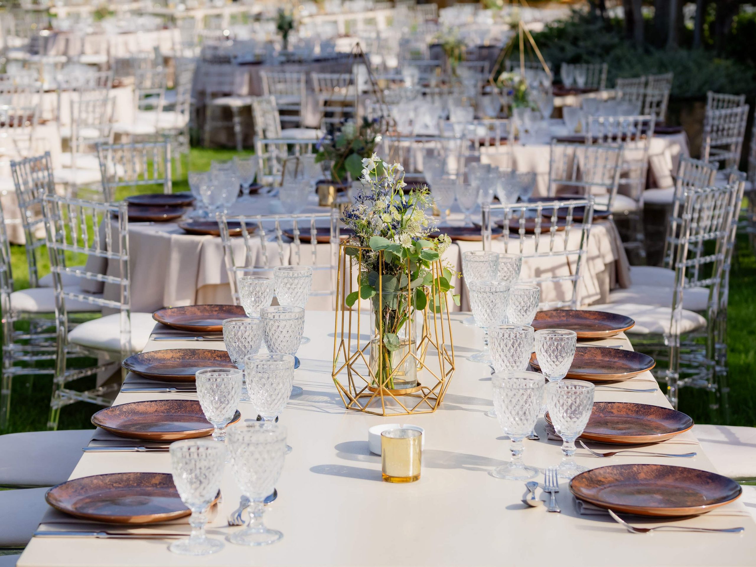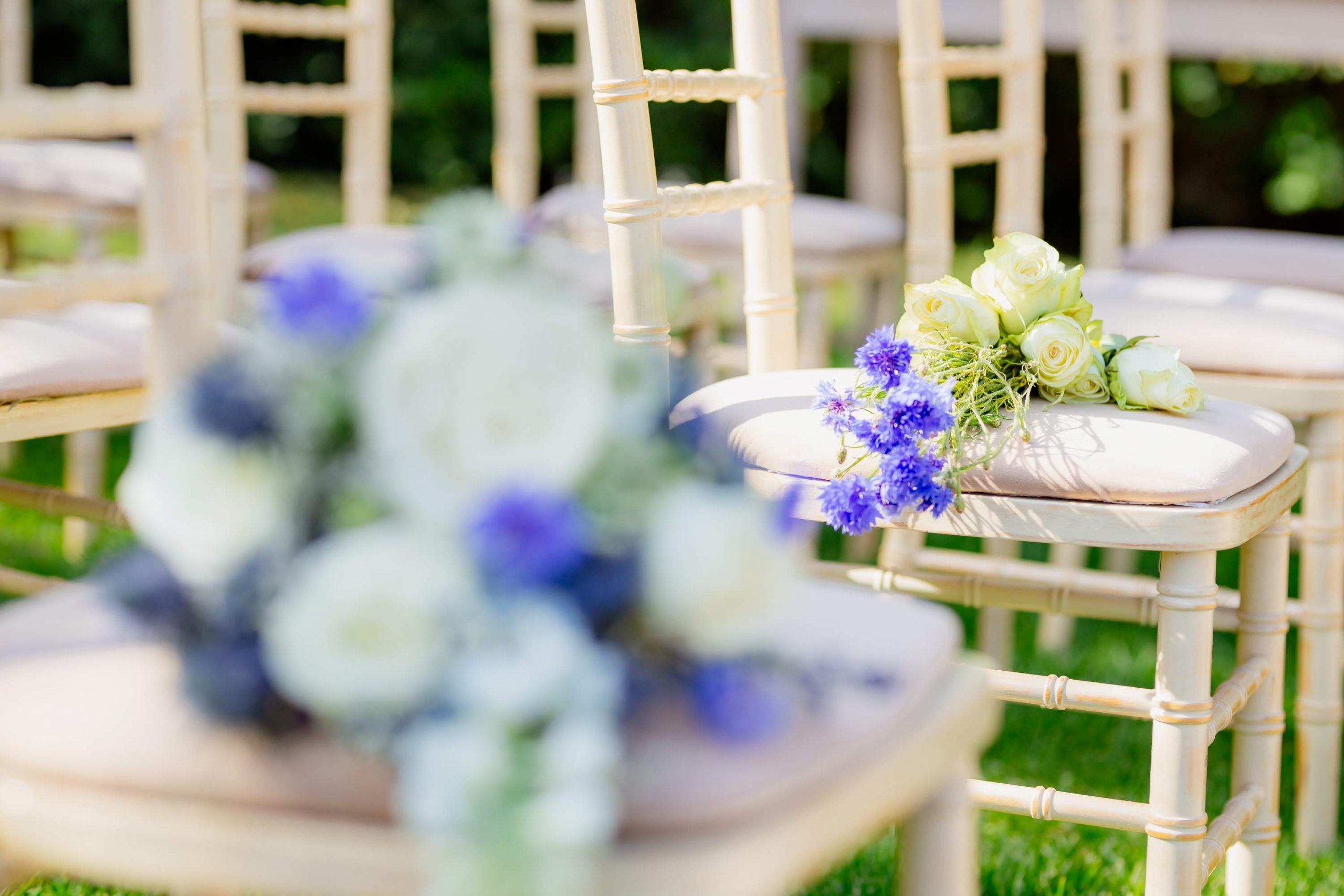 The aesthetics of the wedding were based on naturalness and discreet elegance, with a common line from the bridal bouquet to the reception. The flowers were chosen with freshness and balance in mind, without strong contrasts or exaggerations. The decoration was in natural tones, with white and blue flowers and discreet touches of gold. In the ceremony area, the floral arrangements harmoniously framed the setting, creating a sense of calm and freshness, while the details of the baptism were discreetly integrated into the overall aesthetic. The baptism was captured through thoughtful elements: candle, baptismal accessories and thematic details, all carefully designed to complement the romantic atmosphere of the day and highlight the theme. The materials, textures and color combinations created a warm and balanced result.