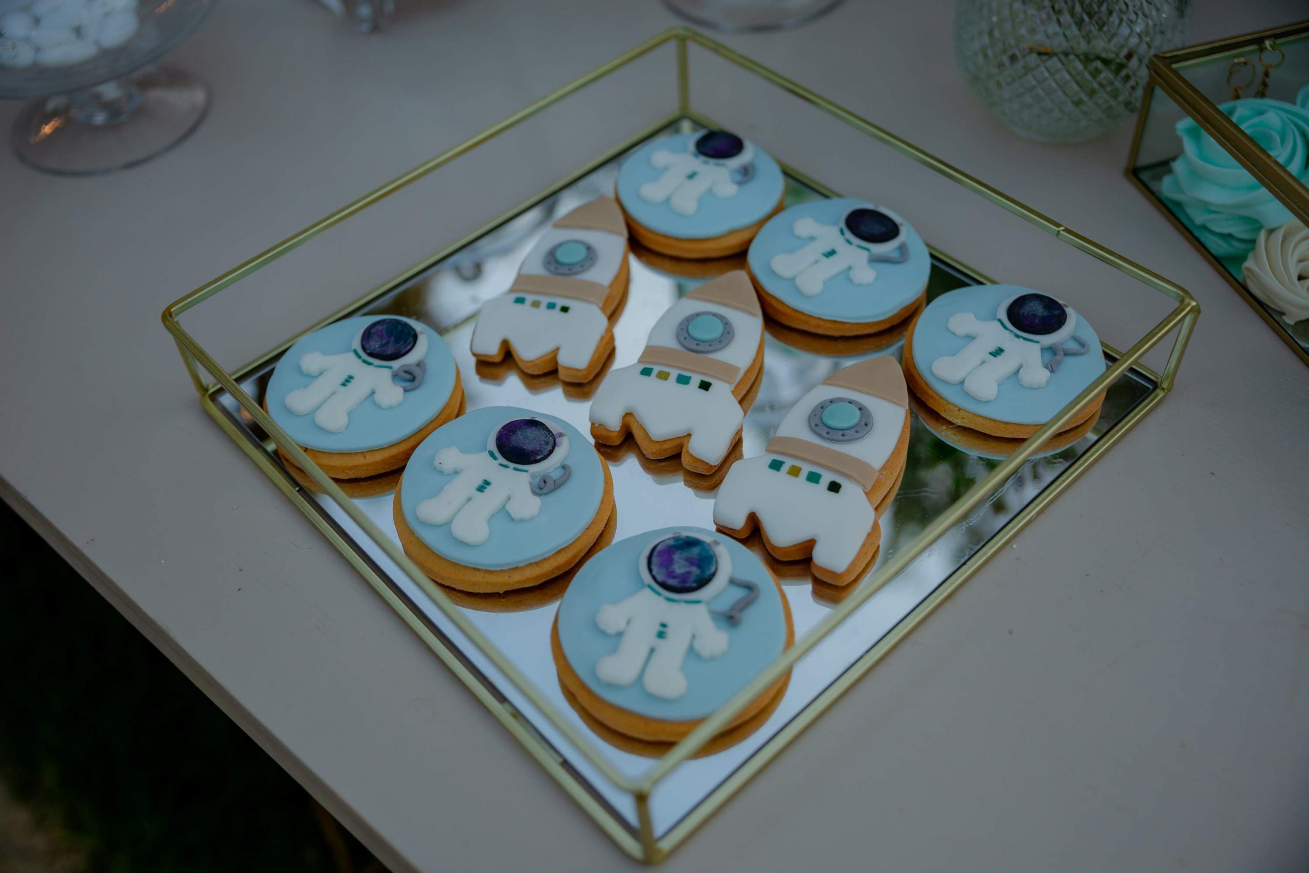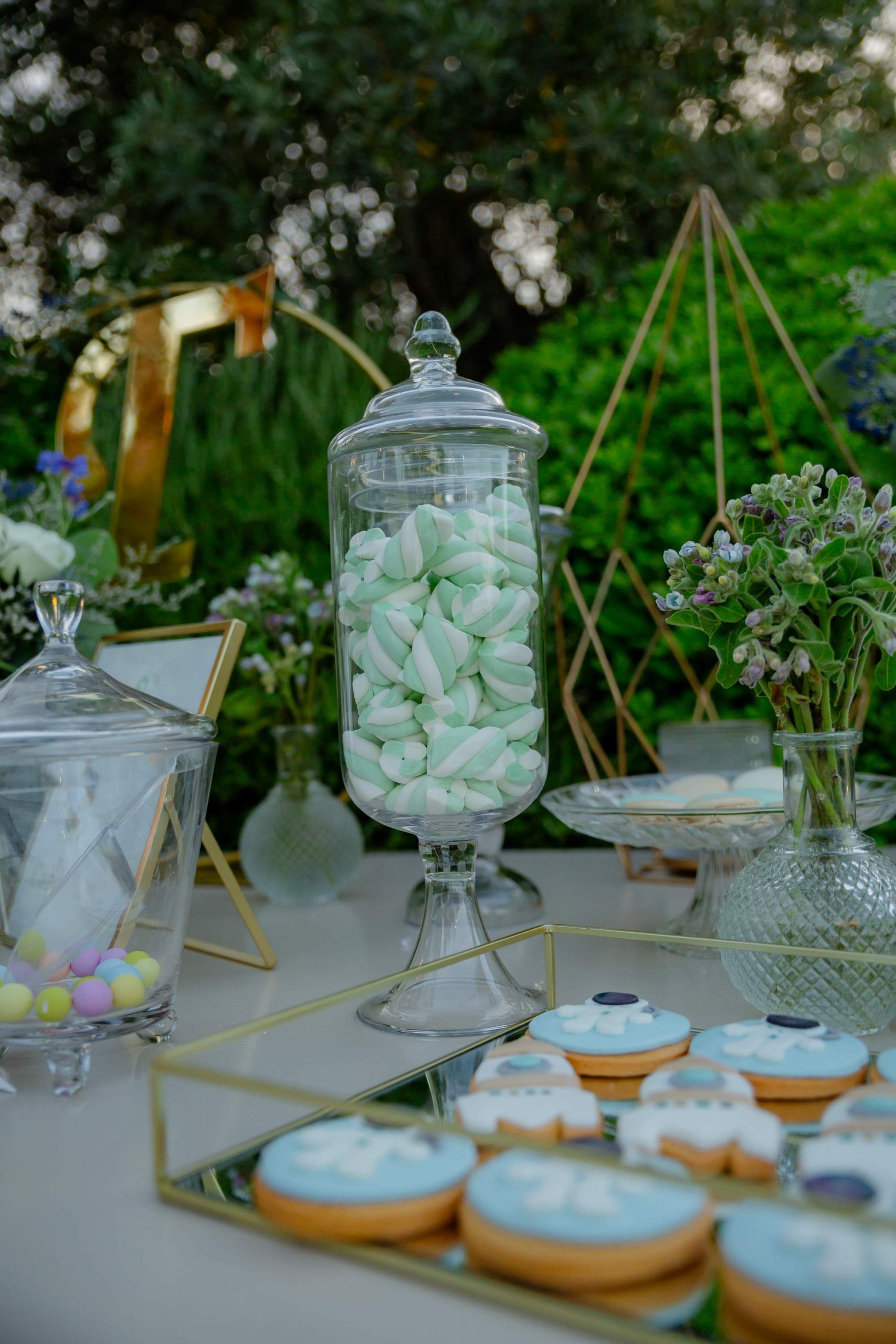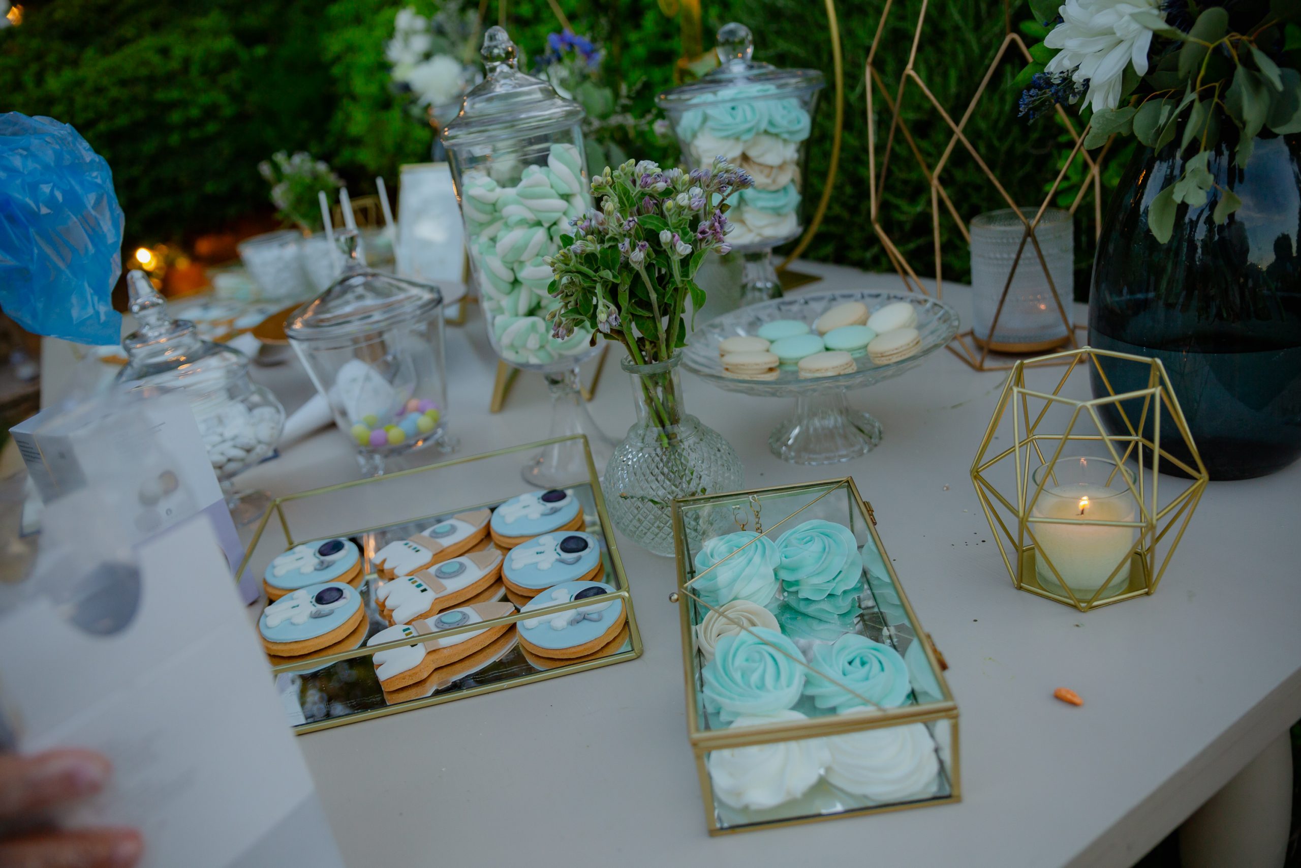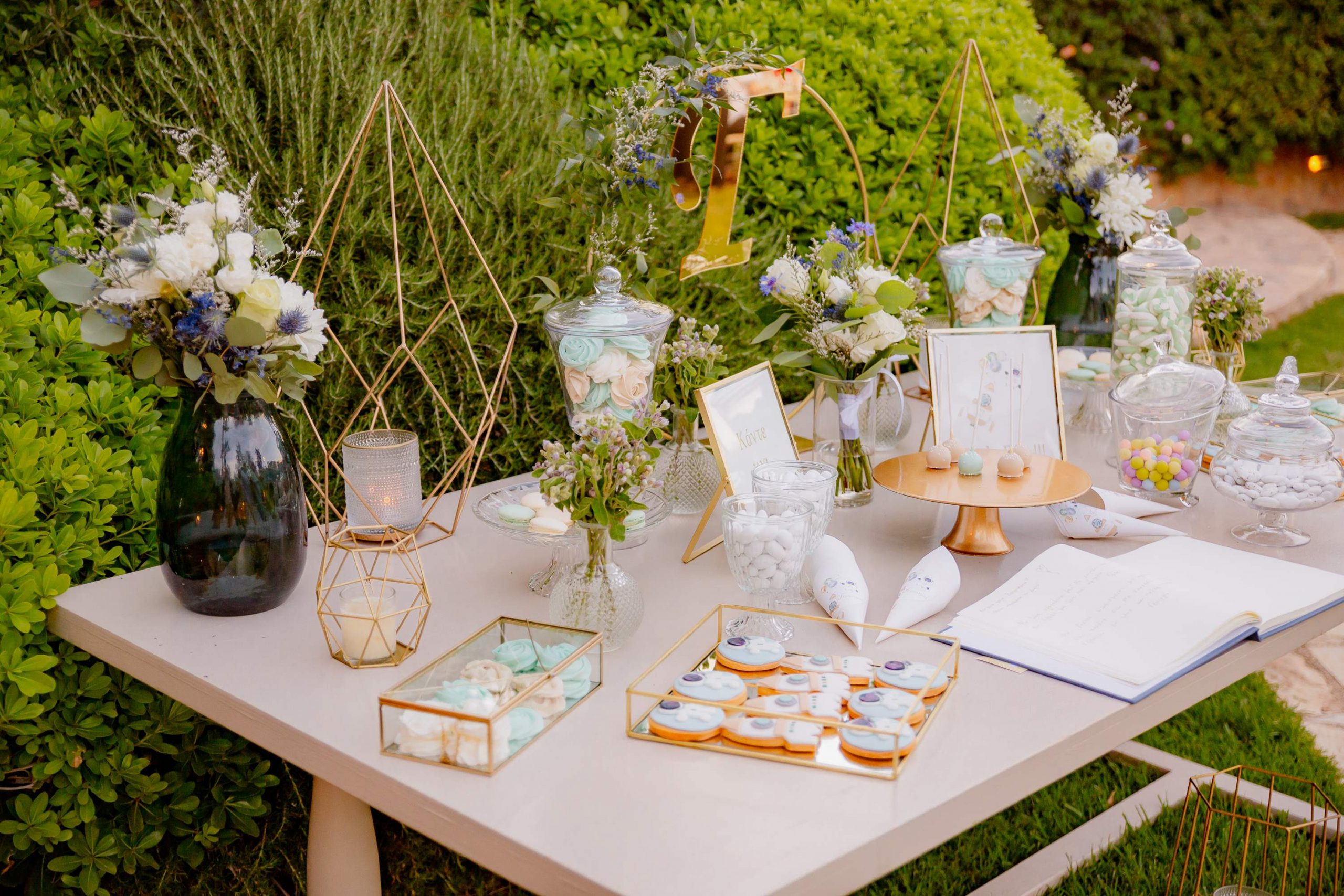 At the reception, the tables were decorated with low-height floral arrangements, to allow comfortable communication between guests. Every part of the space followed the same design philosophy, offering an elegant, modern and perfectly harmonized result. The candy bar was a point of reference and offered a light and joyful note to the reception. Sweets, favors and decorative elements worked together, creating a setting that perfectly suited both the baptism and the wedding celebration.