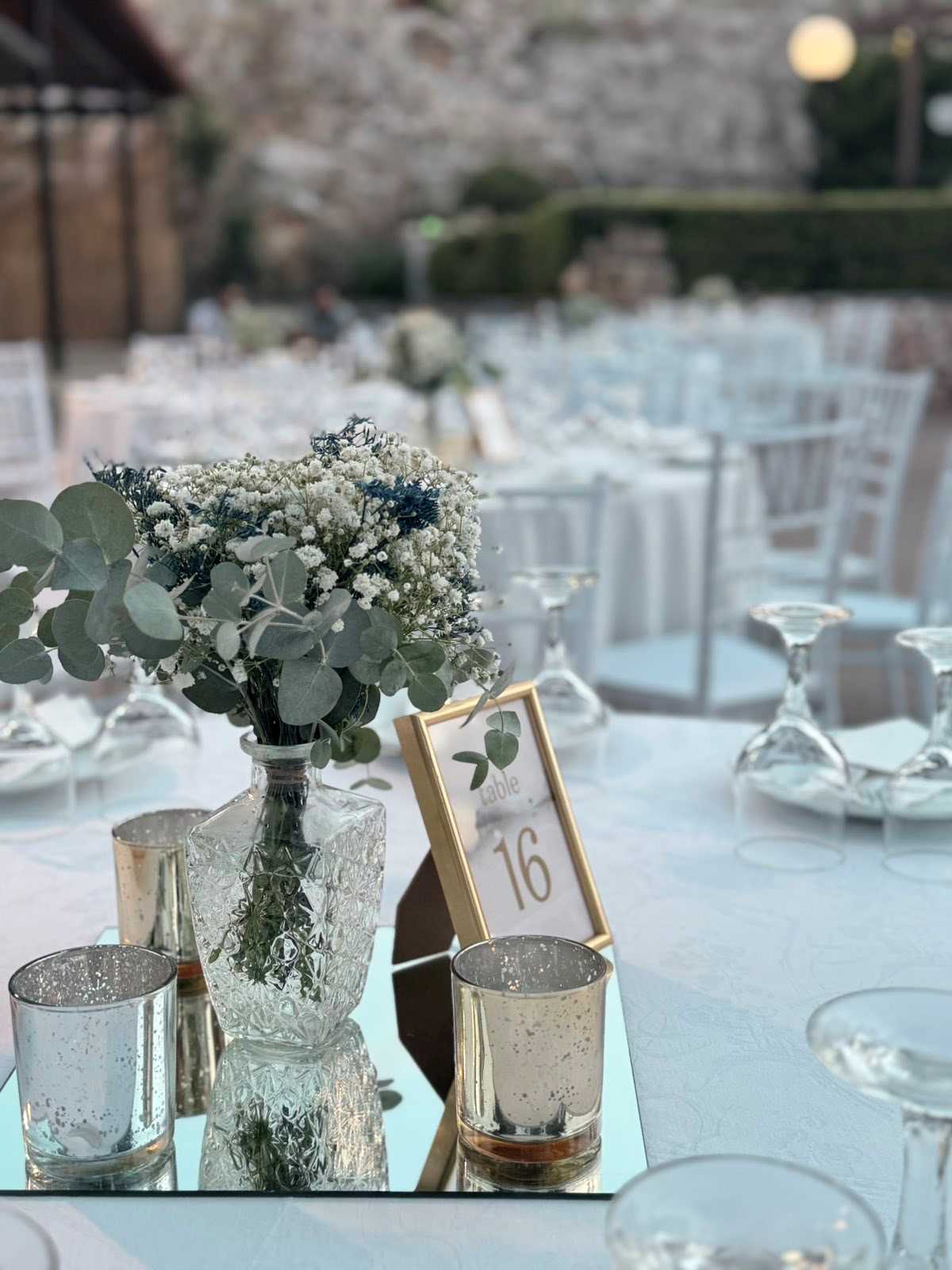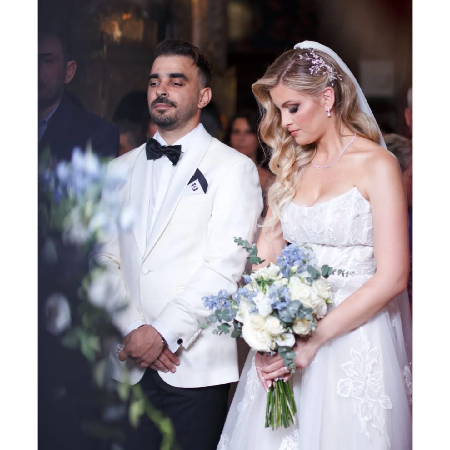 The reception followed the same aesthetic, with elegant tables decorated in white and sky blue shades, natural flowers and discreet touches that created a warm and romantic atmosphere. Everything was harmoniously combined, creating a fairy-tale setting that united the joy of the wedding with the sweetness of the baptism.