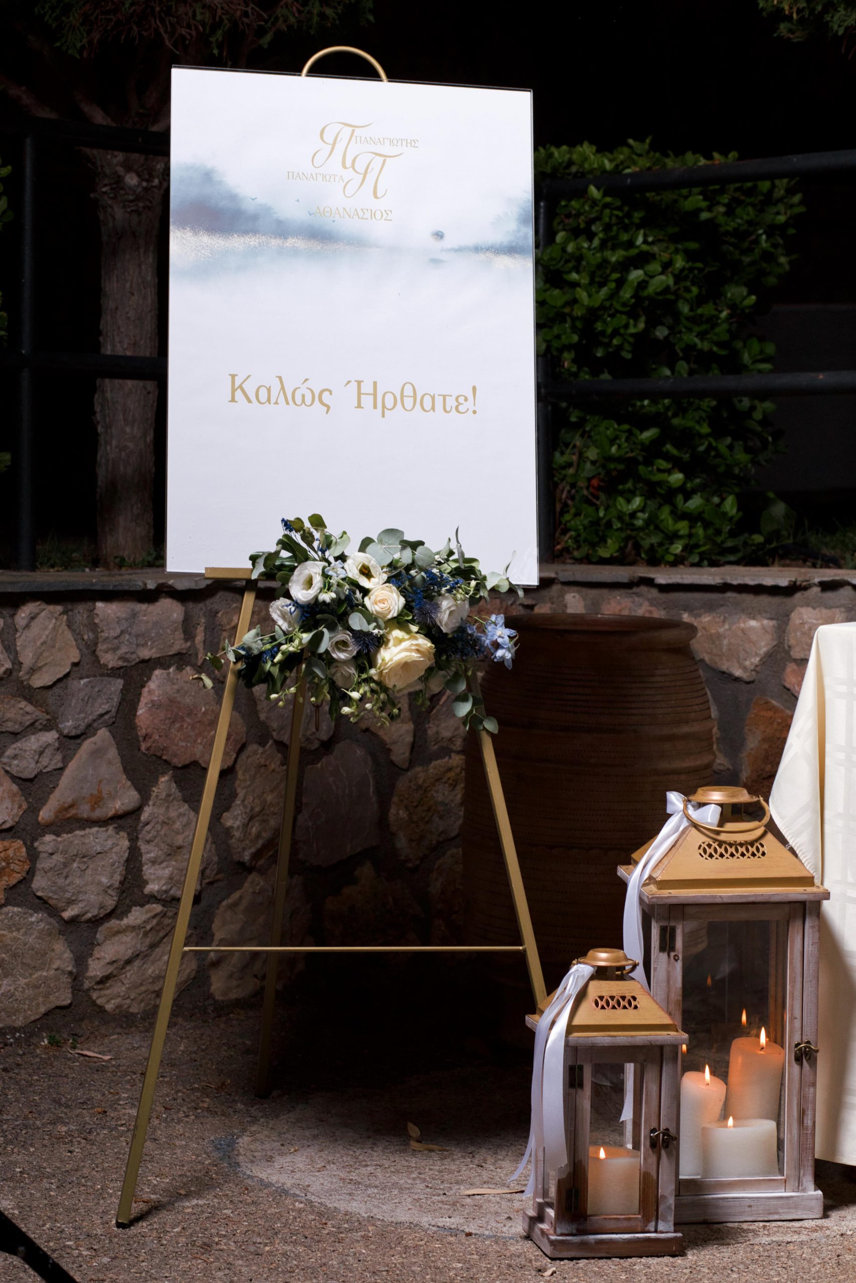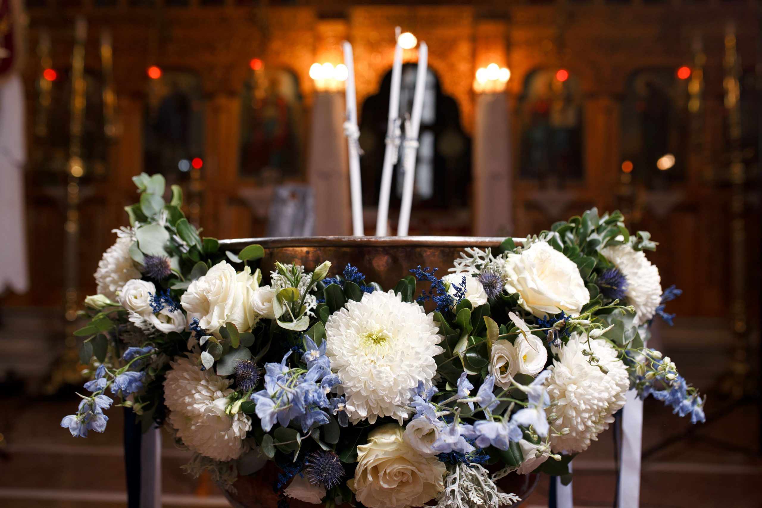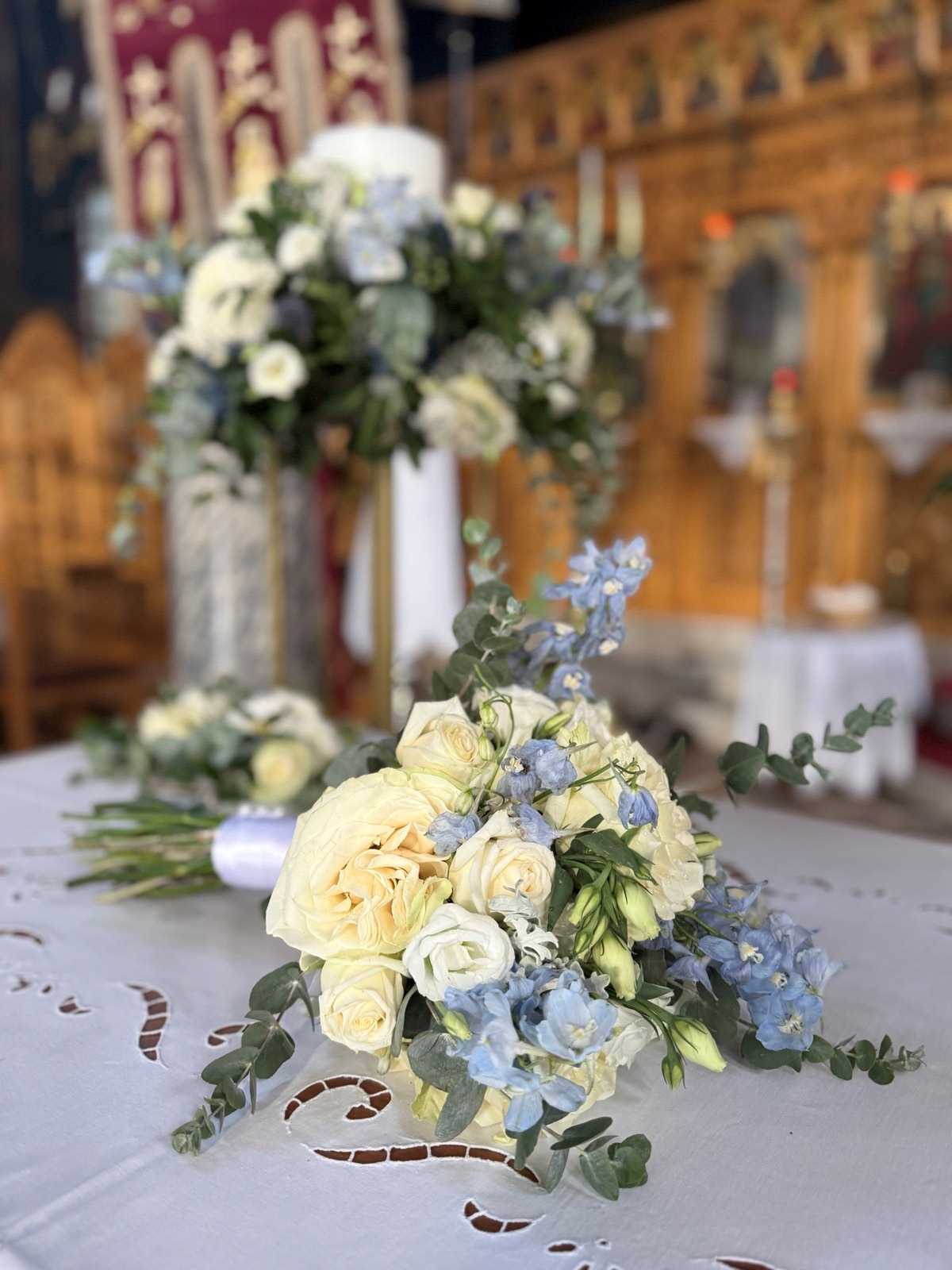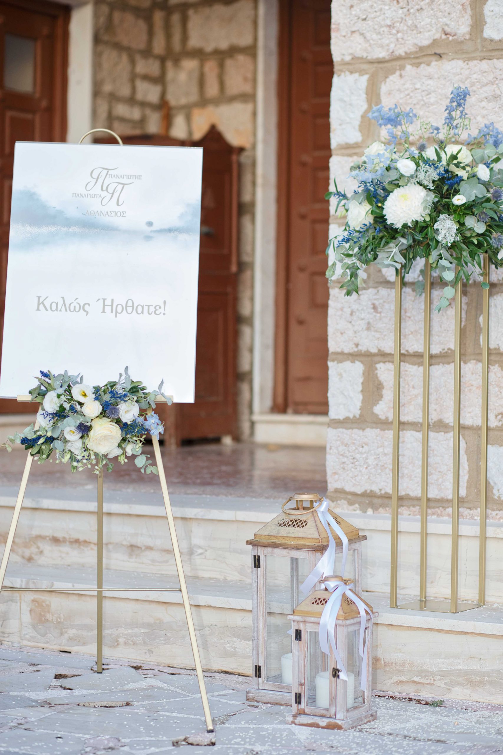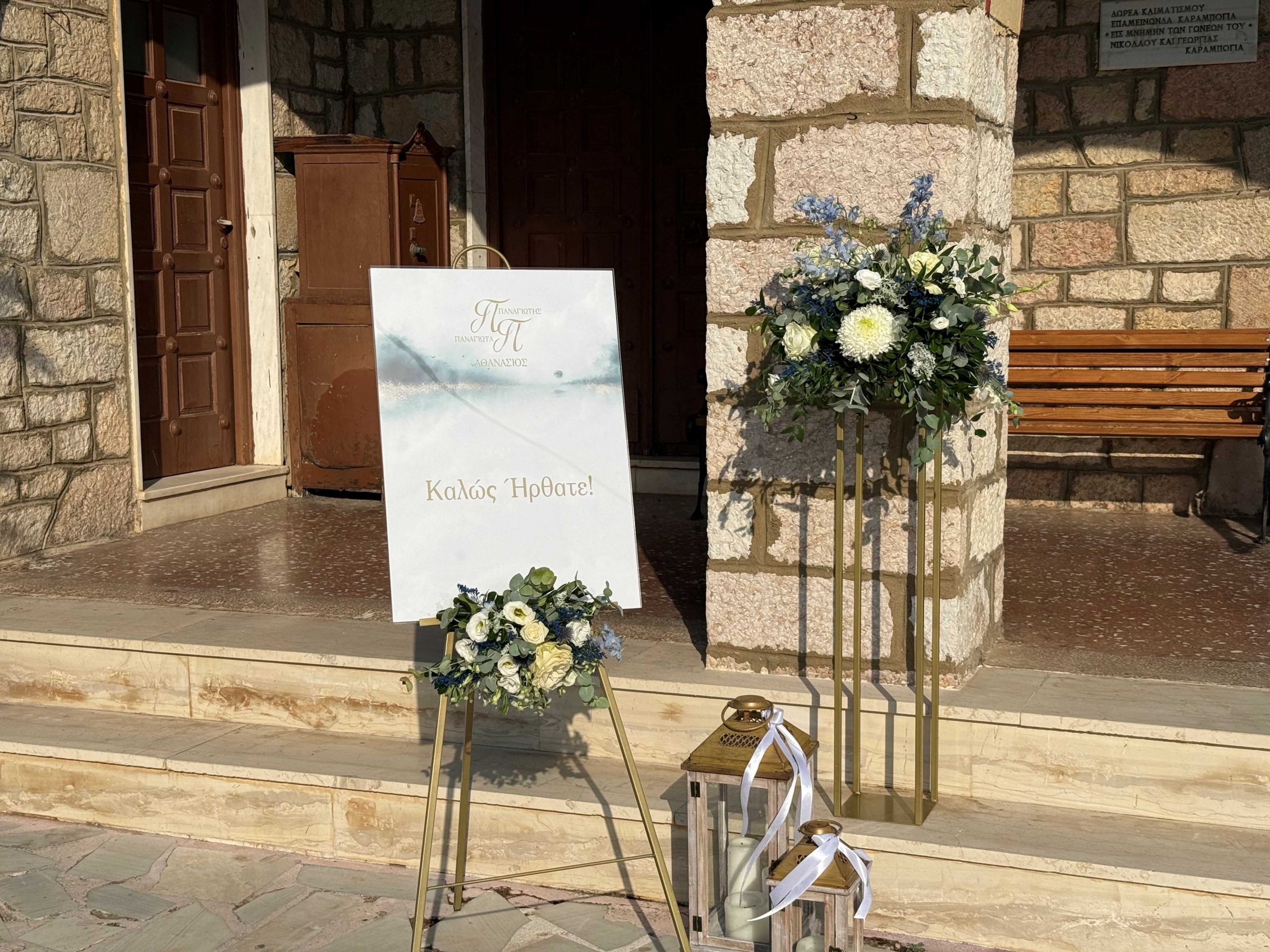 The decoration in the church moved in soft tones of white and blue, exuding elegance and tranquility. White flowers were harmoniously combined with eucalyptus and discreet blue details, creating a sense of freshness and purity. In the sacred space "kolympithra" and the ceremony areas were decorated with natural compositions that highlighted the warmth and importance of the moment. A romantic and bright decoration, full of love, that uniquely dressed the two mysteries!