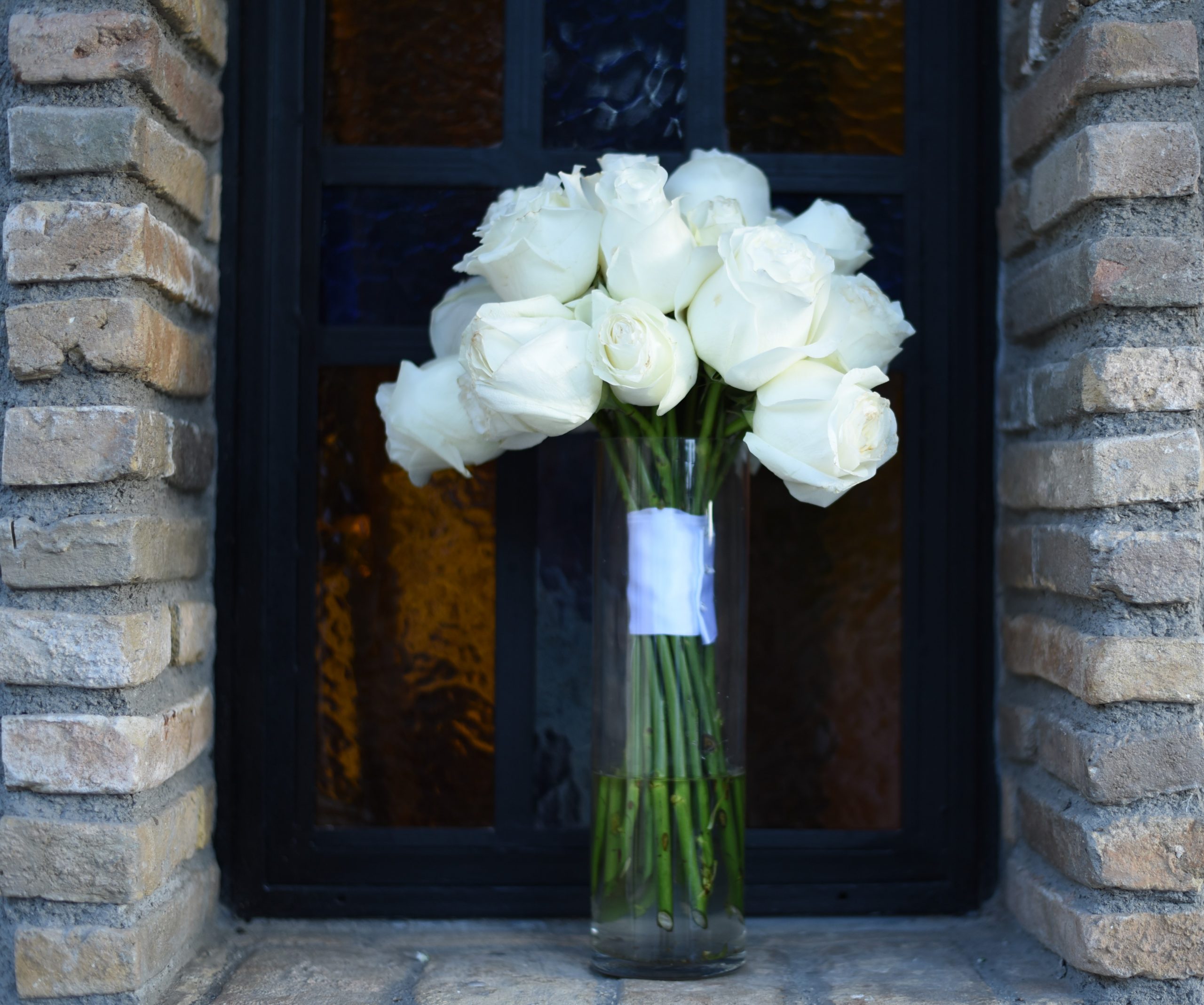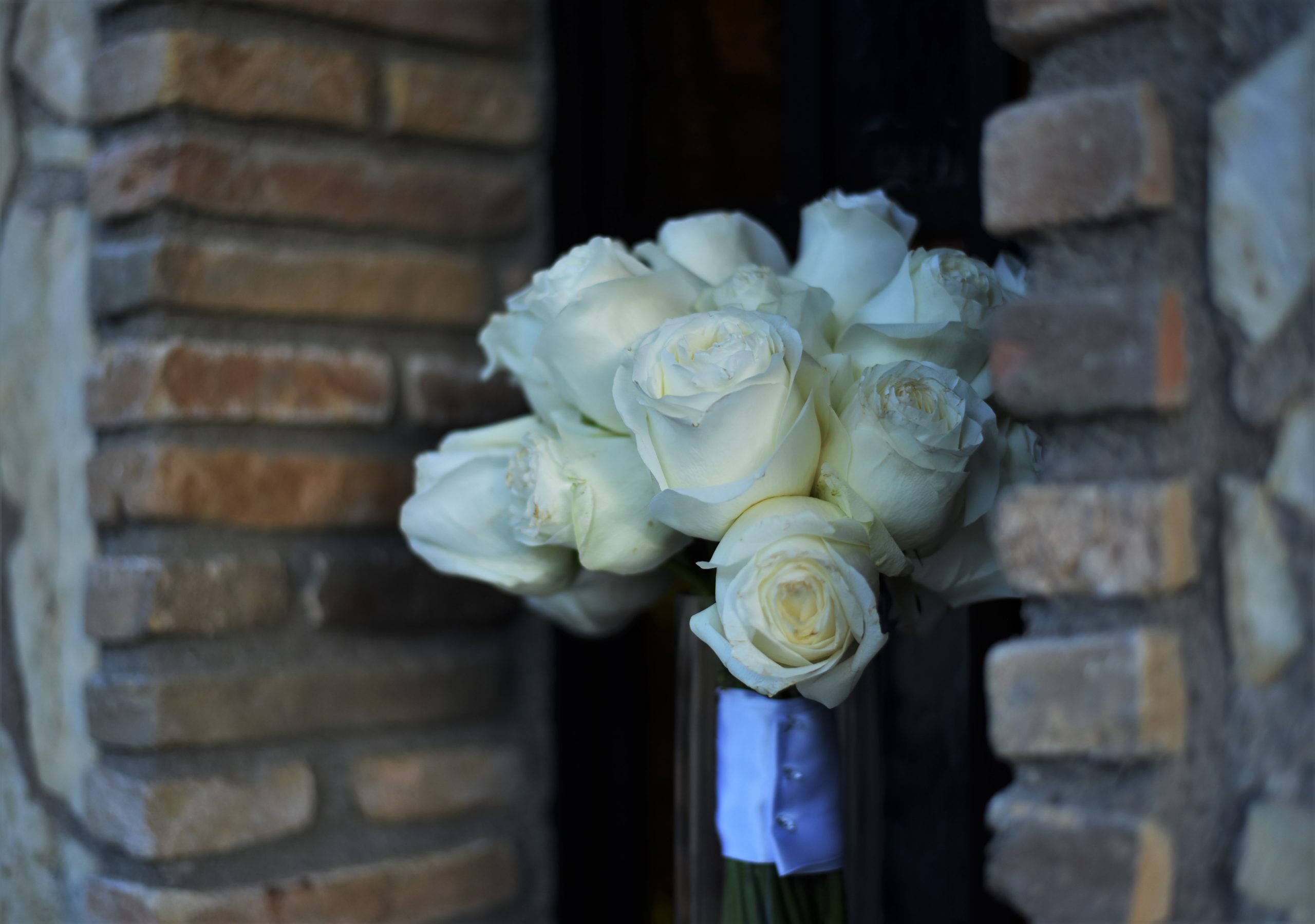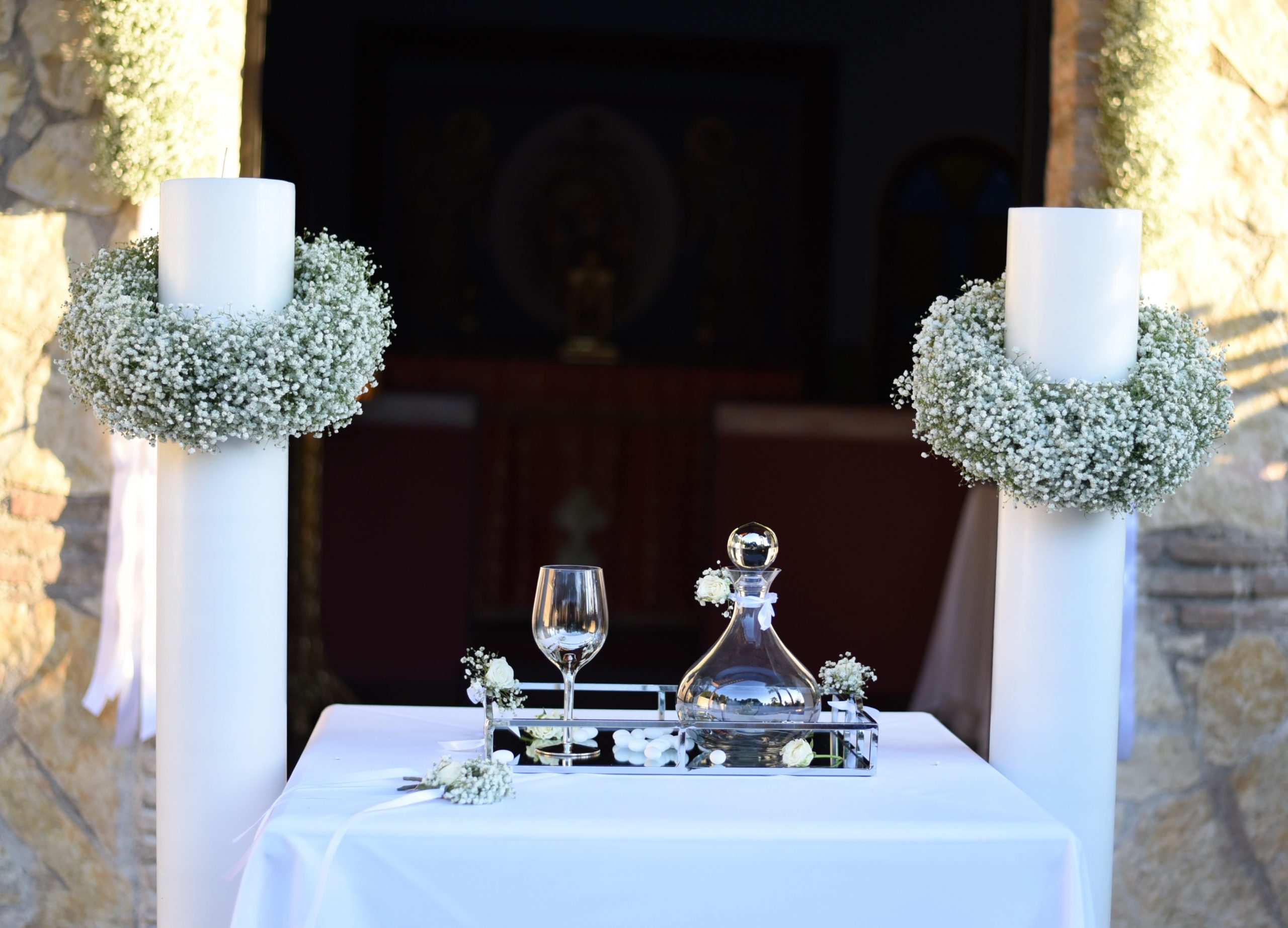 In the church, the gypsophila garland embraced the stone and natural material of the space, creating a calm contrast. The candles, tall and simple, decorated with spherical gypsophila compositions, highlighted the symmetry and seriousness of the ceremony without exaggeration. Every detail seemed to float, letting the light pass gently between the flowers. The bridal bouquet, made exclusively of white roses, was ultra-elegant and ideally complemented the bridal look, emphasizing freshness and timeless elegance.