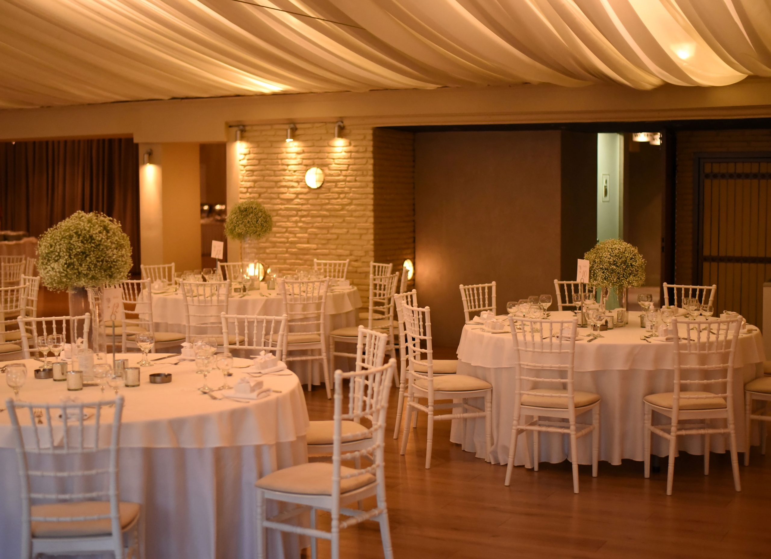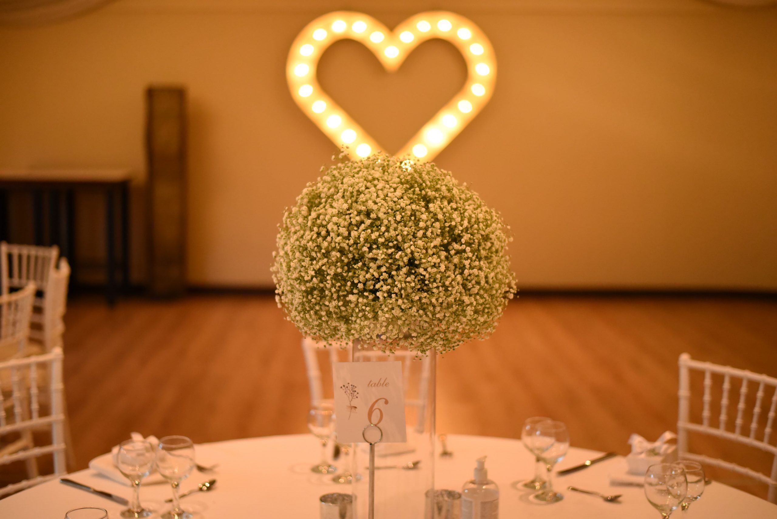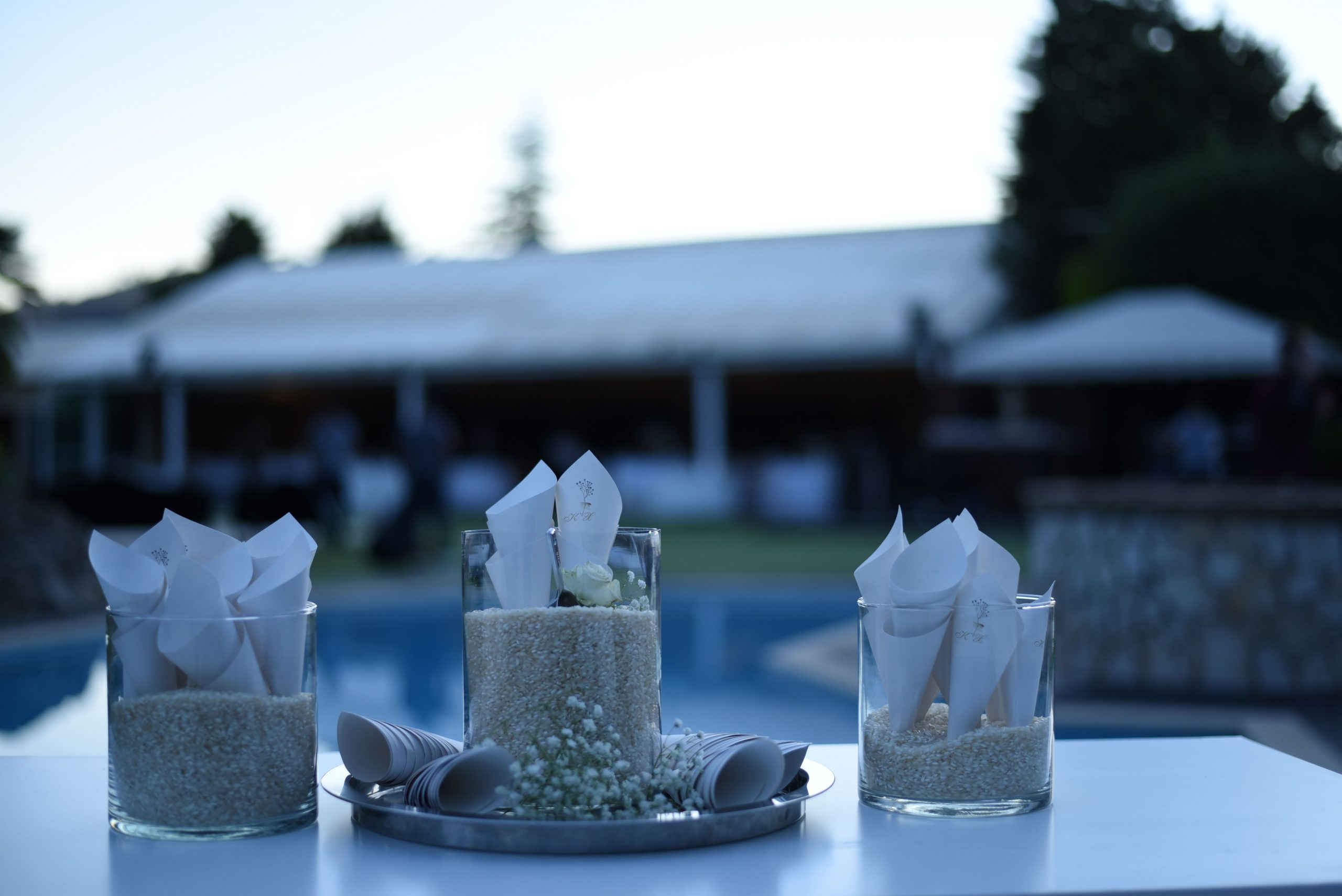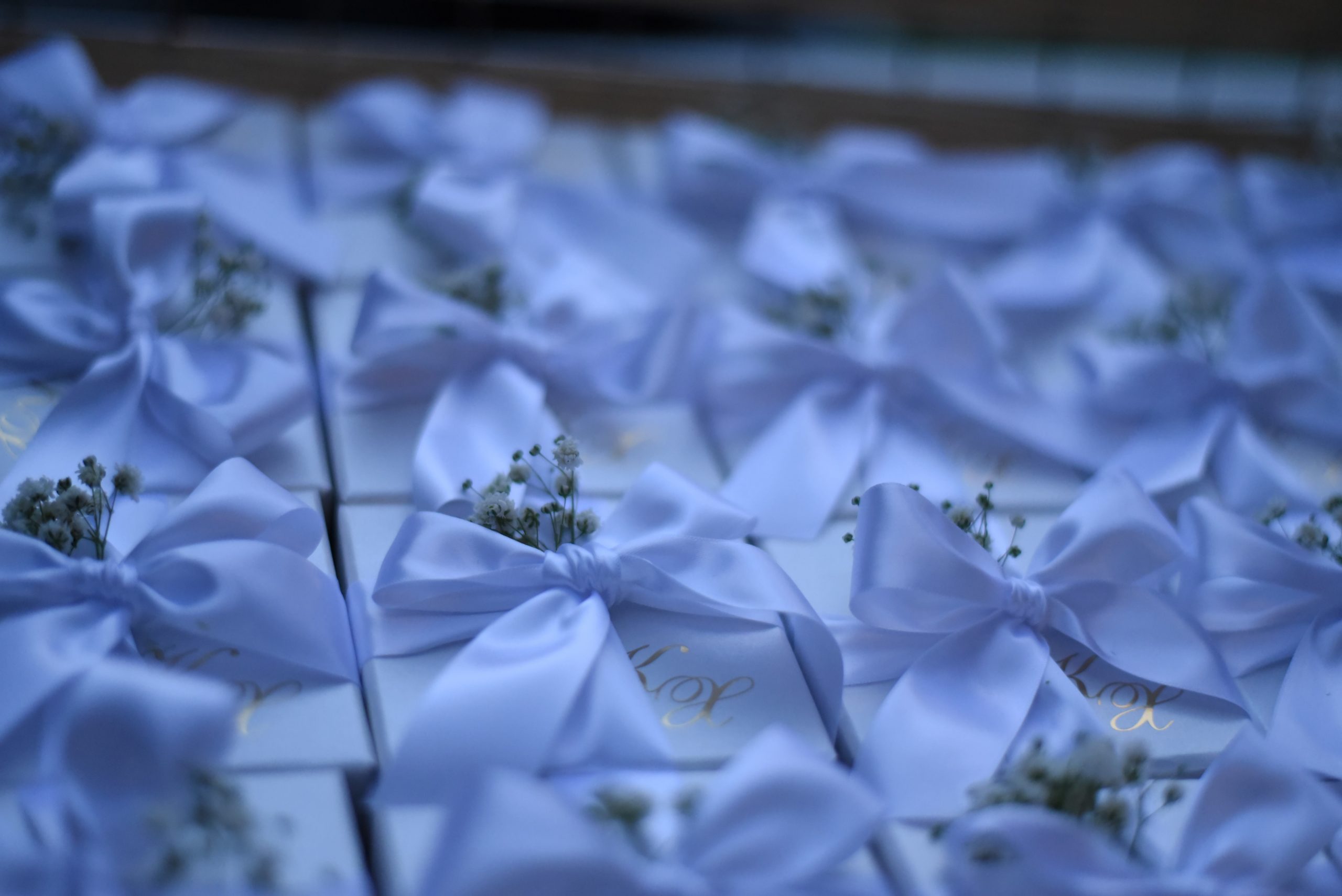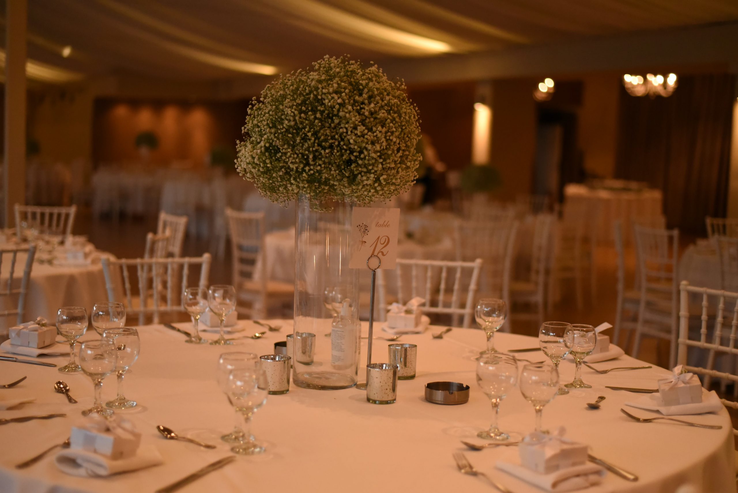 The reception area was a natural continuation of the ceremony, maintaining the same sense of purity and tranquility. In the center of the tables, spherical compositions made of white gypsum placed in transparent glass vases gave height and airy movement, without weighing down the composition. The wedding favor followed the same philosophy of simplicity and delicacy. A small, white box, tied with a satin ribbon and decorated with a subtle detail of gypsophila, was placed on each guest’s tableware. A quiet, elegant element that did not seek to stand out, but to harmoniously complete the overall concept.