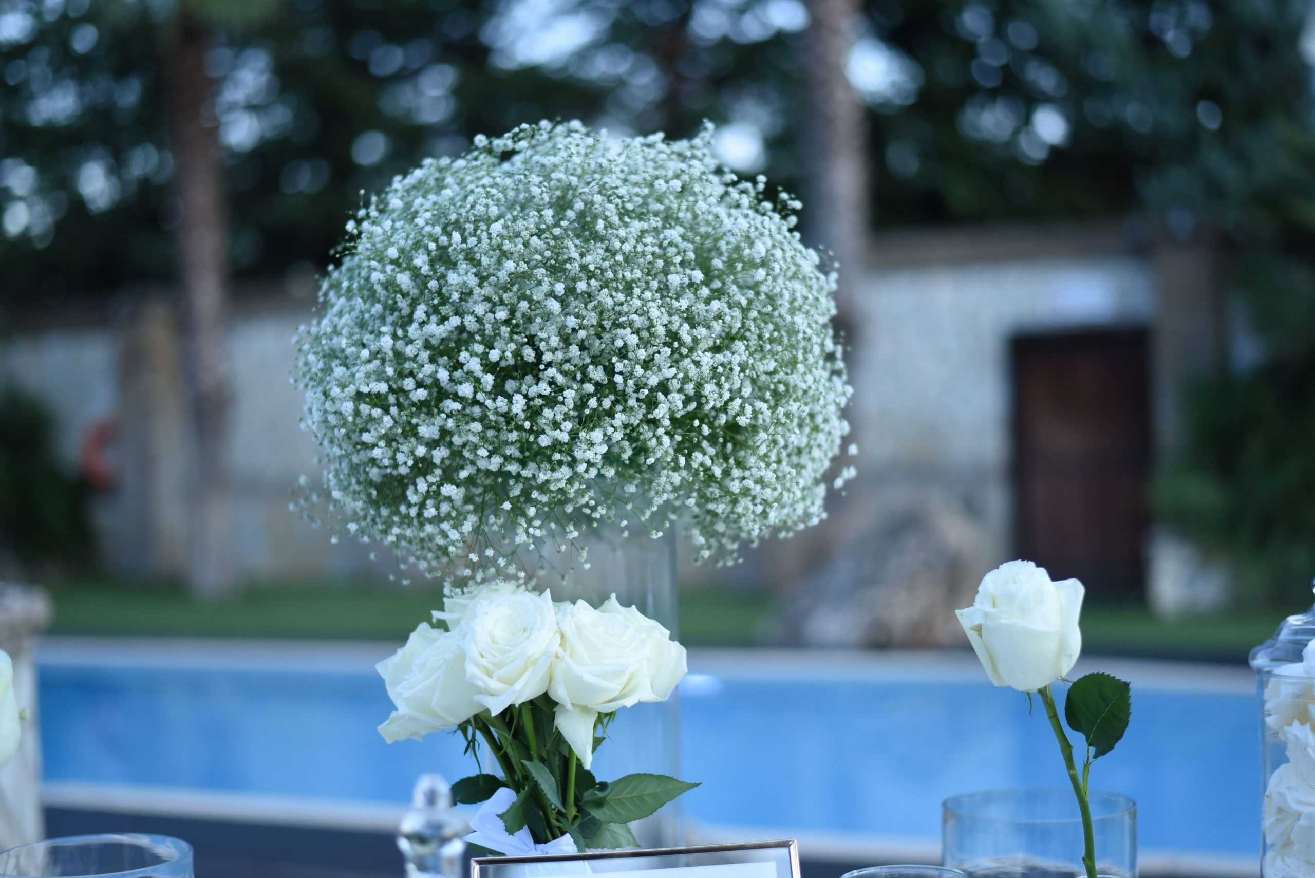 Christina knew exactly what she wanted for the style and decoration of their wedding “Simplicity and Elegance” for this reason, the white gypsophila was chosen exclusively, an airy and timeless flower, which functioned as a symbol of purity, light and discreet luxury.