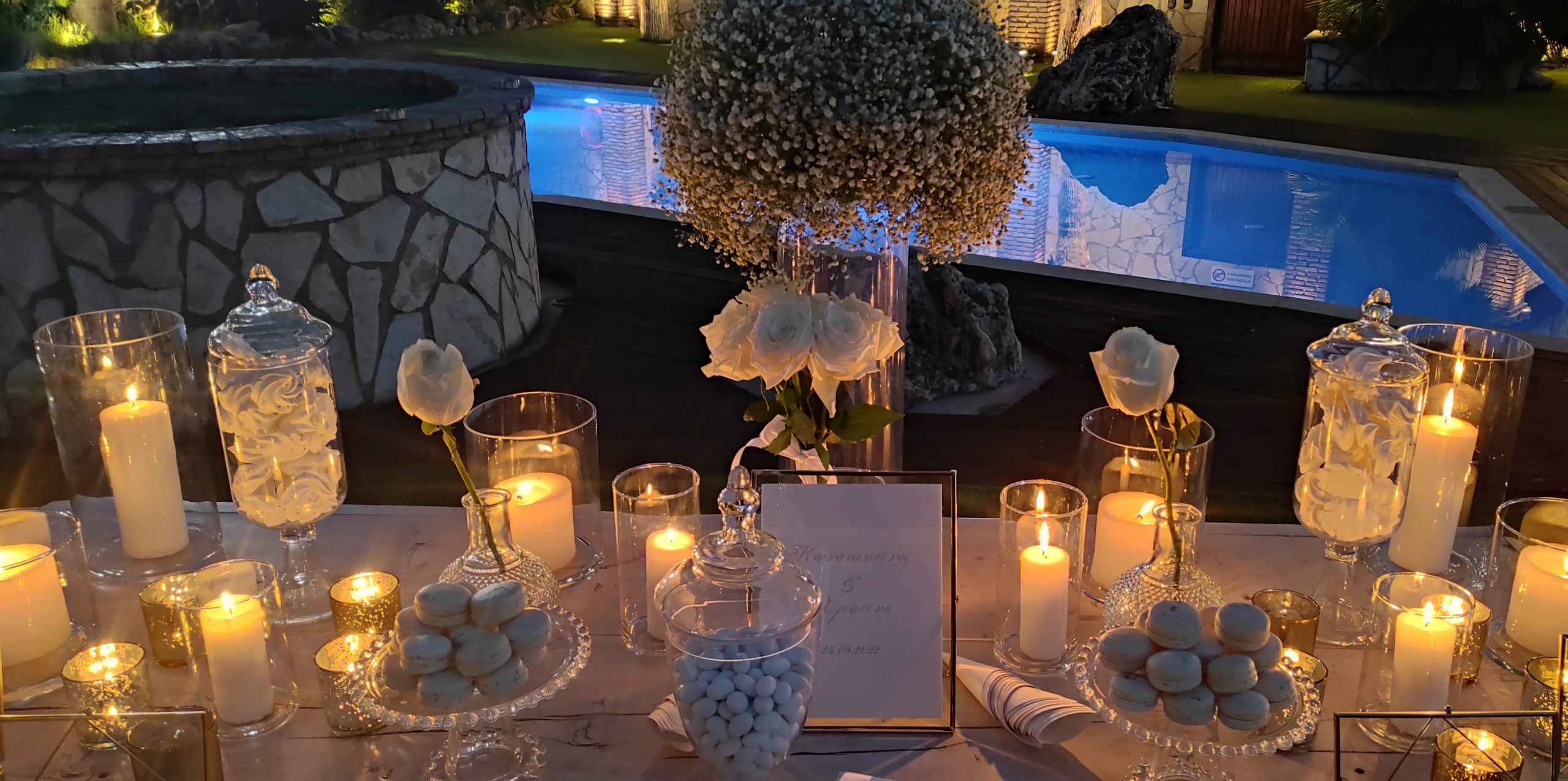 On the table with the Book of Wishes, the same aesthetic continued with absolute consistency. White sweets, glass surfaces and candles were combined with gypsum details, creating a bright and airy setting. The decoration did not seek to impress with volume, but with purity and harmony.