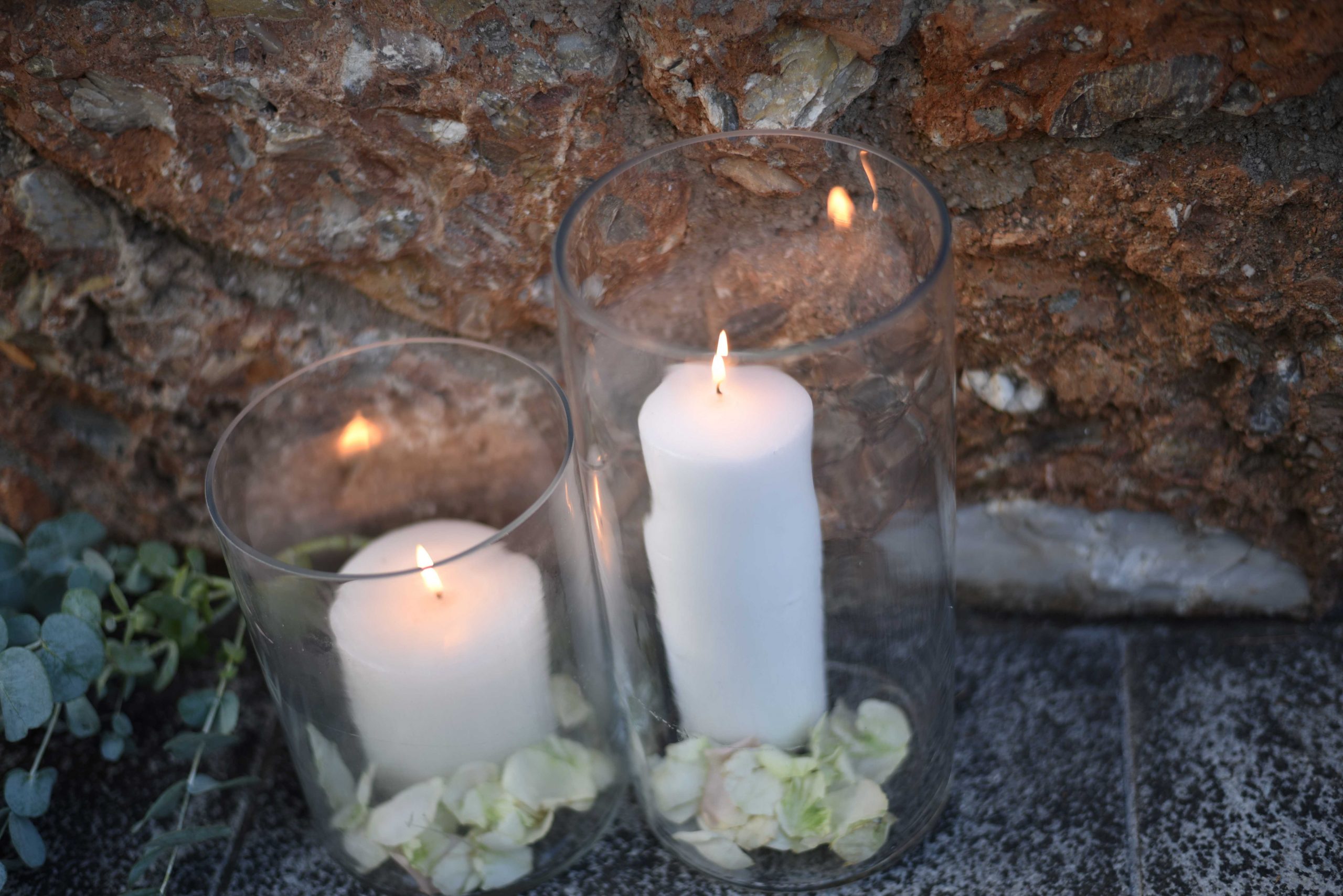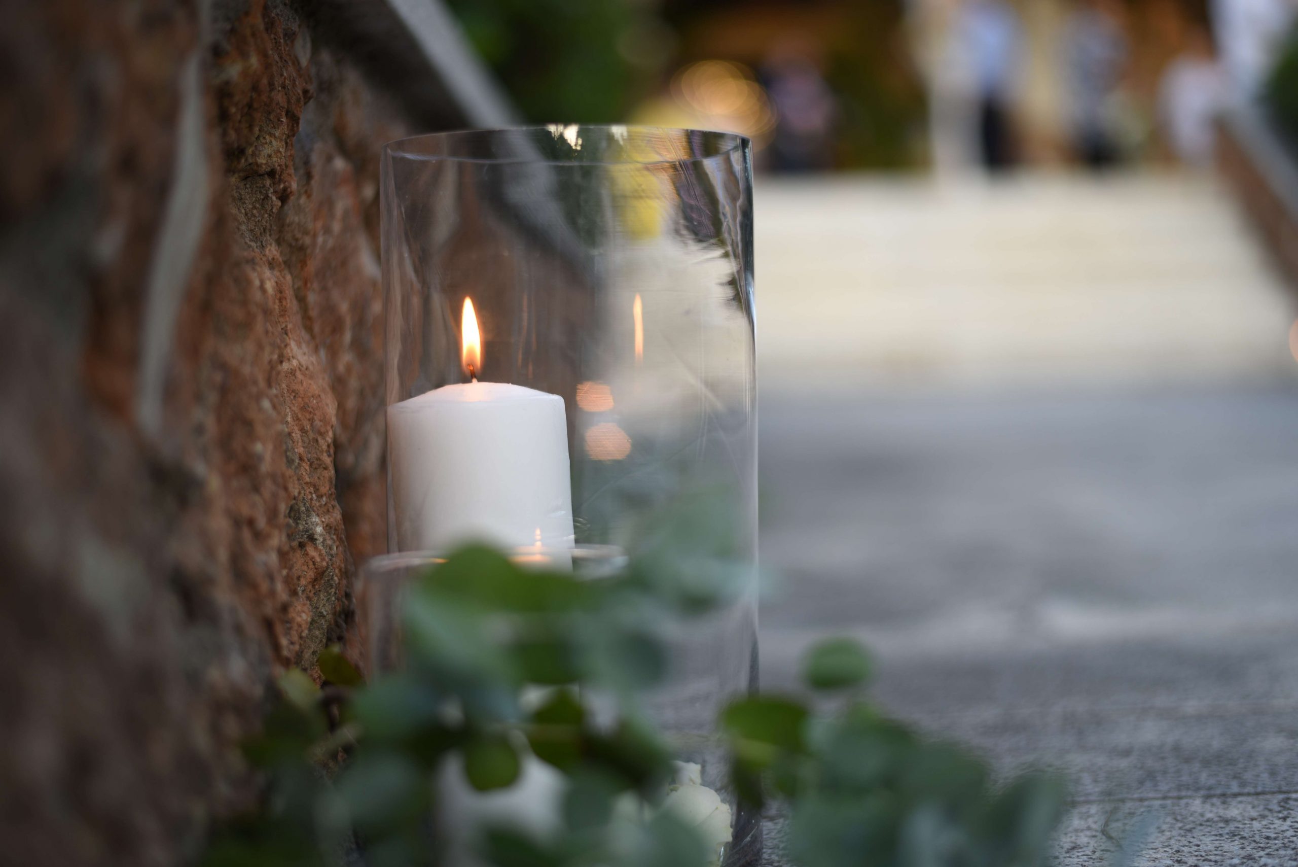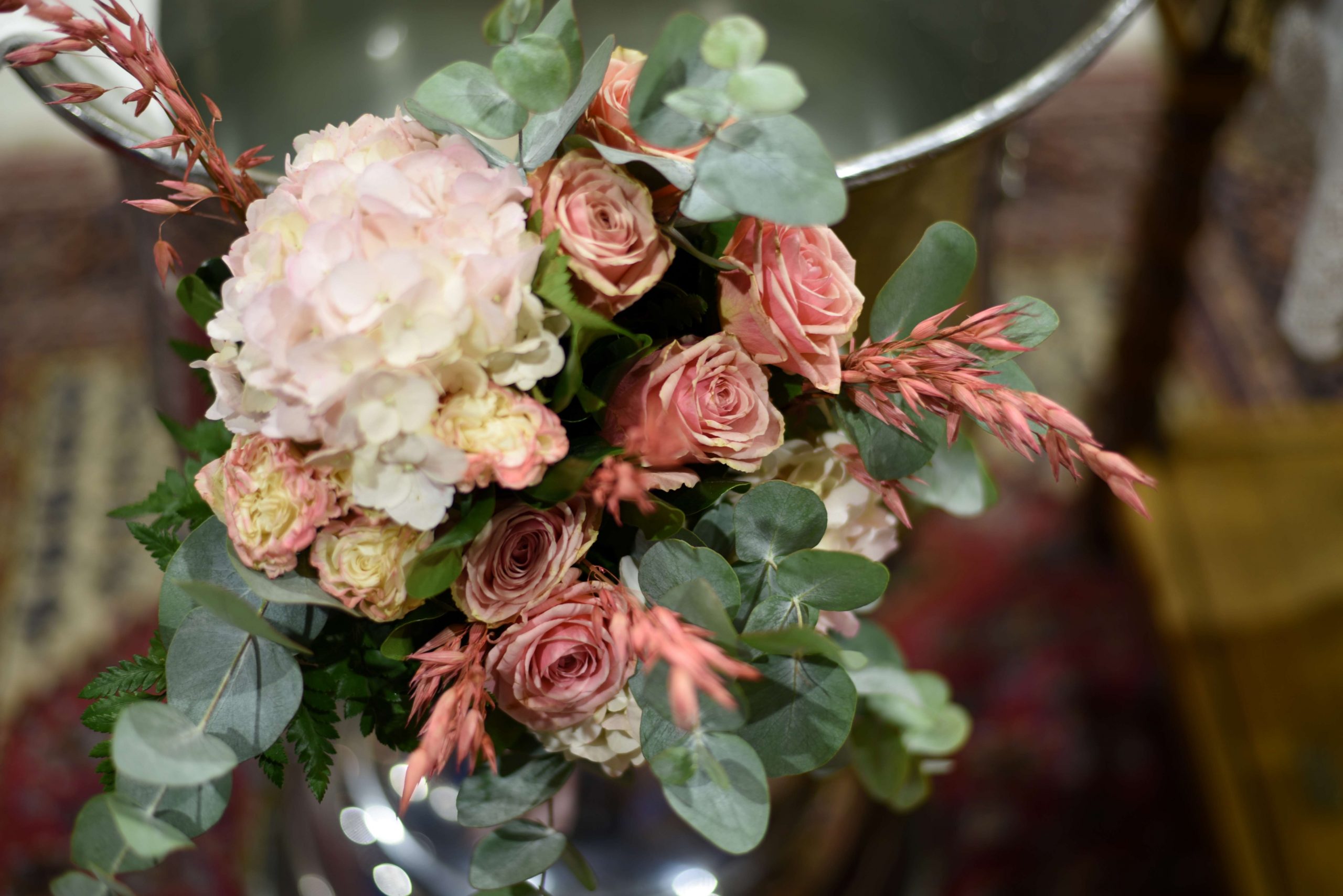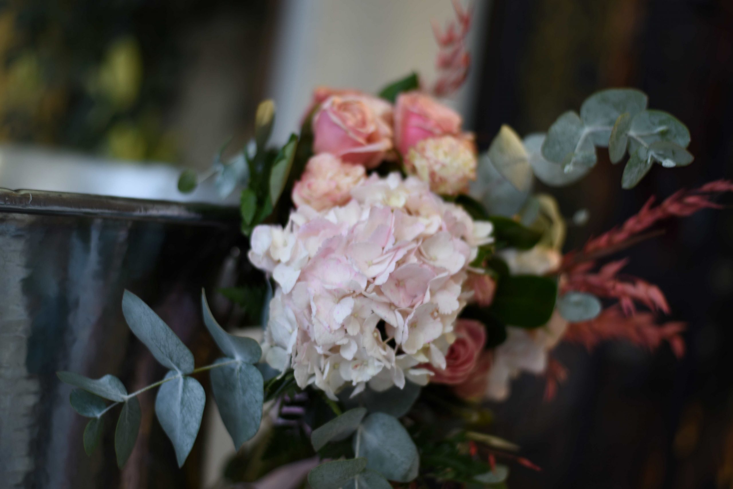 The compositions with pink peonies, roses, white hydrangeas and green eucalyptus leaves discreetly decorated the exterior of the church. In the sacrament, the candles, dressed with flowers in pastel shades and natural materials, added romantic touches without detracting from the magnificence of the church. Every detail was designed with an emphasis on natural elegance.