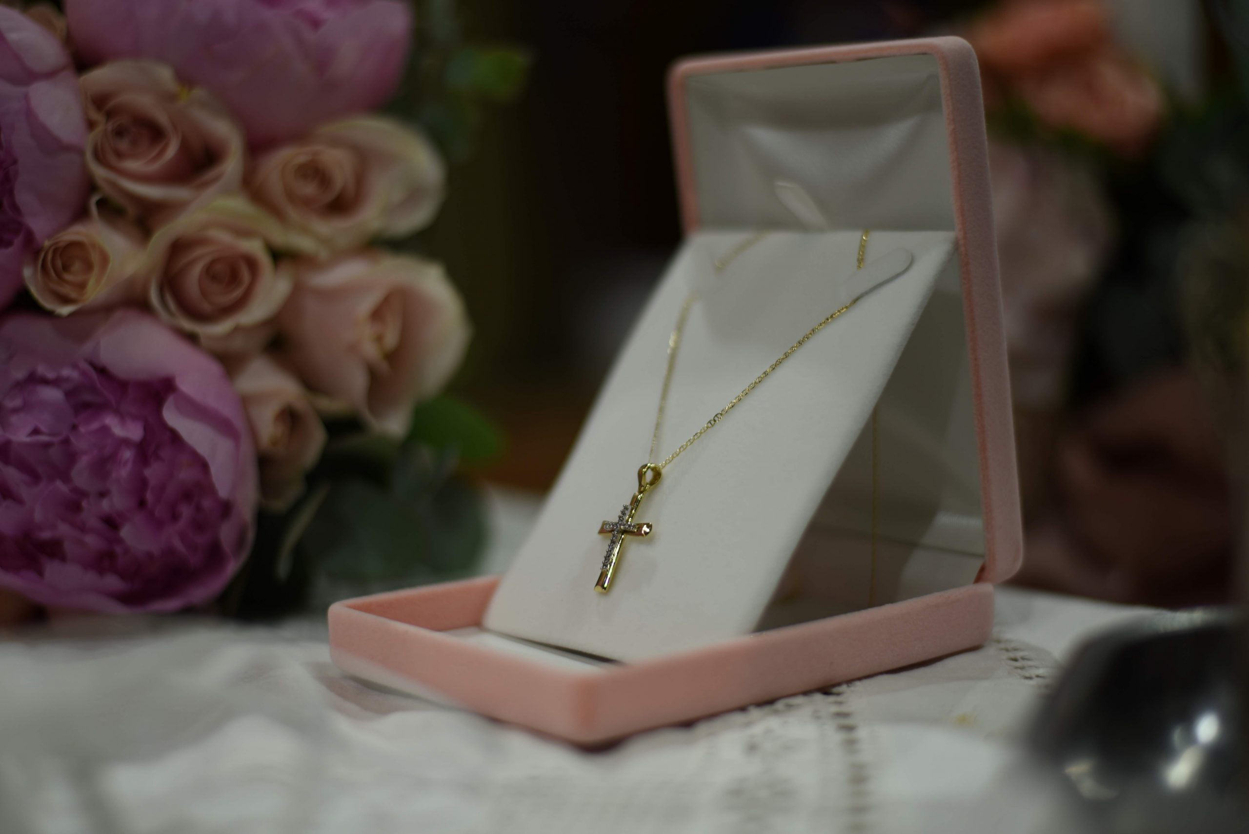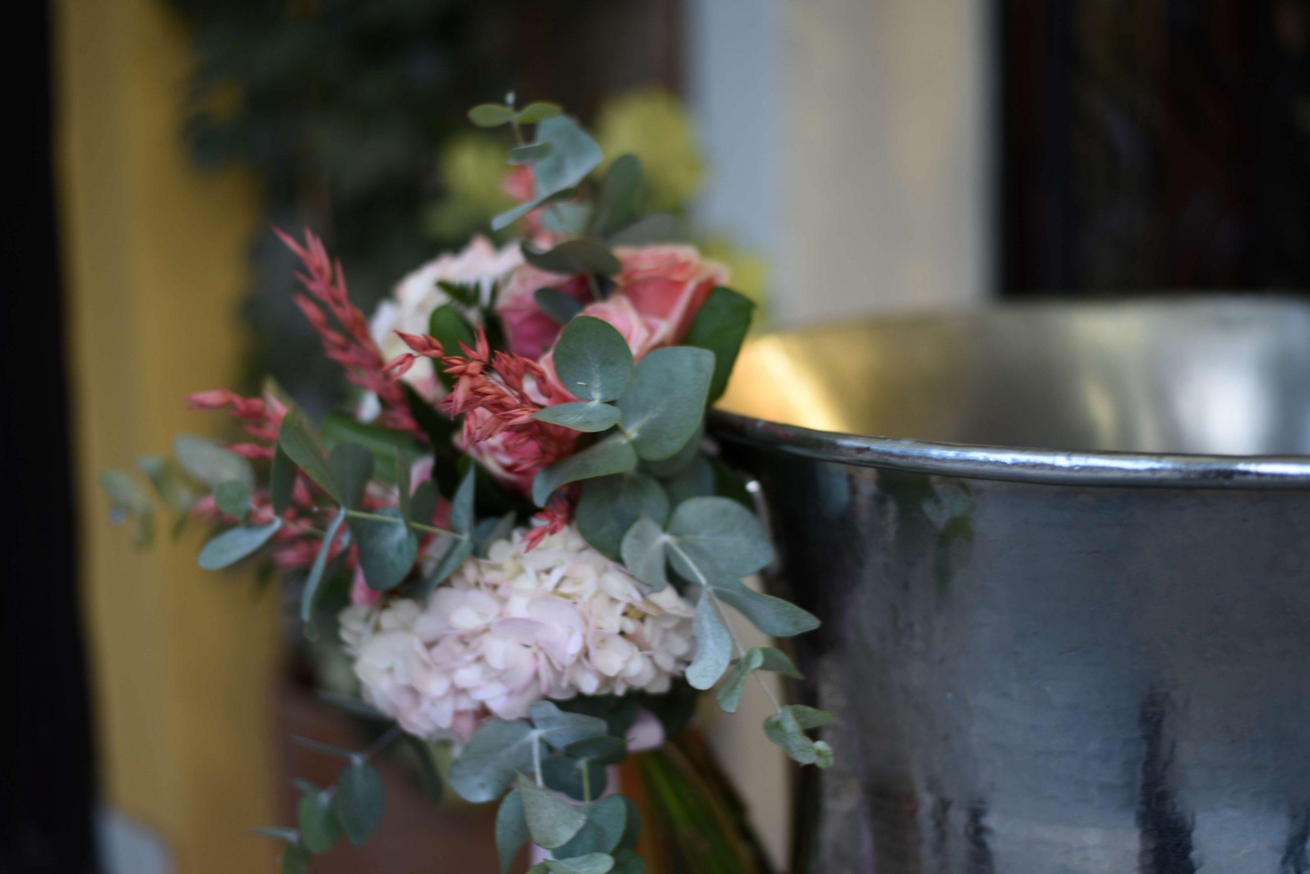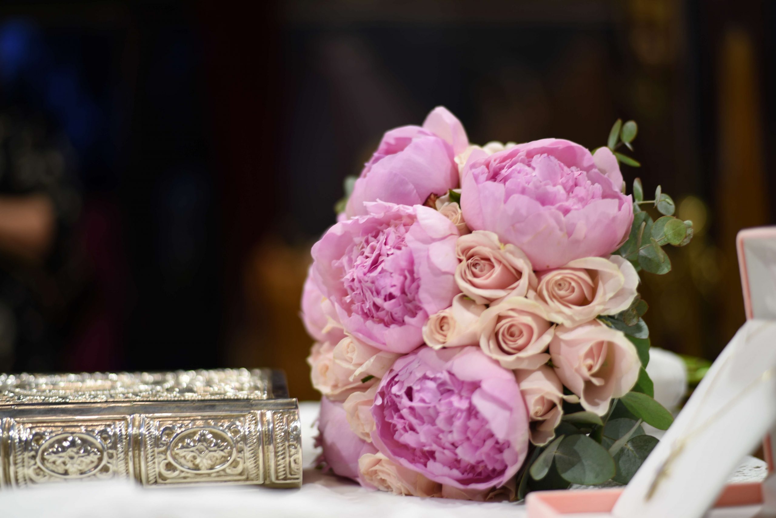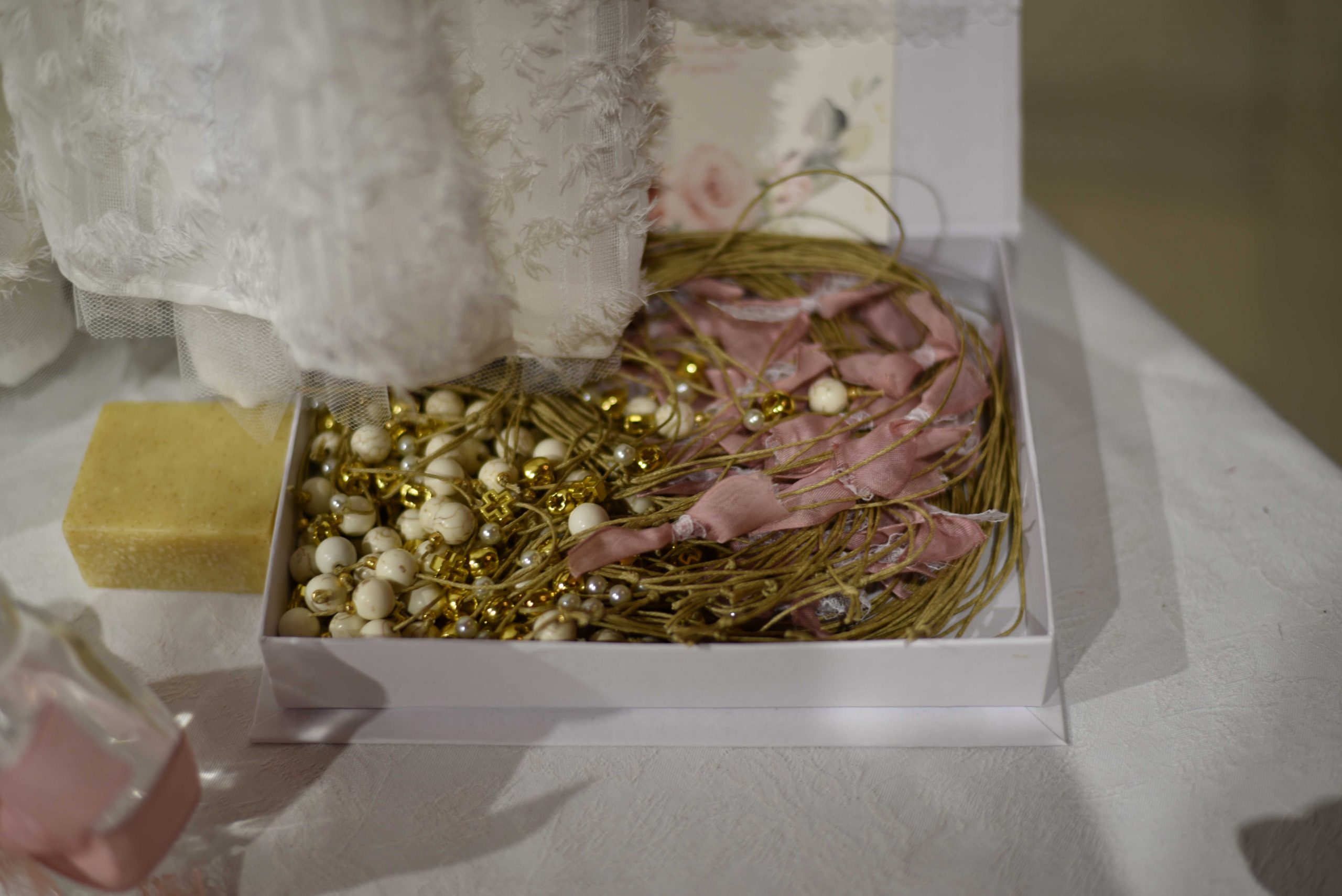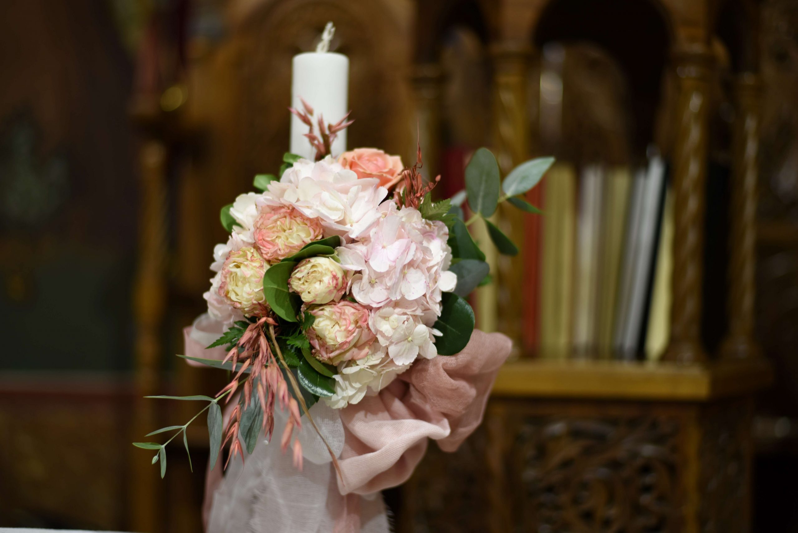 The baptism was captured through a more playful but equally sophisticated styling. The pastel pink elements, the flowers, the candle and the little girl's dress created a sweet continuation of the day, harmoniously connecting the two mysteries. The bridal bouquet with pink peonies and the vintage scarab decoration was a wonderful result”.