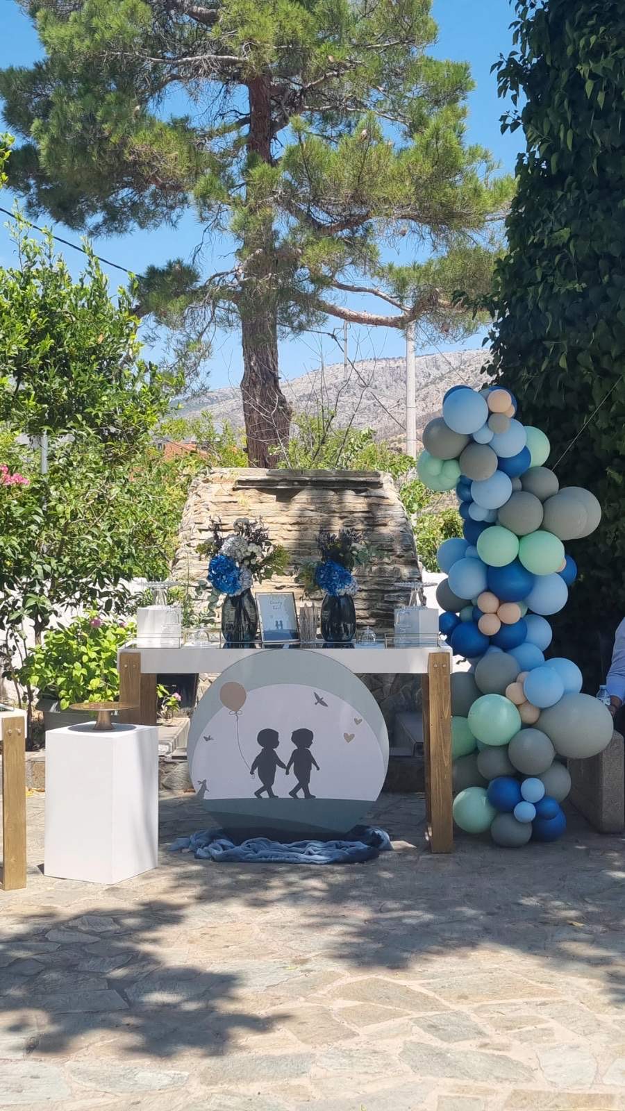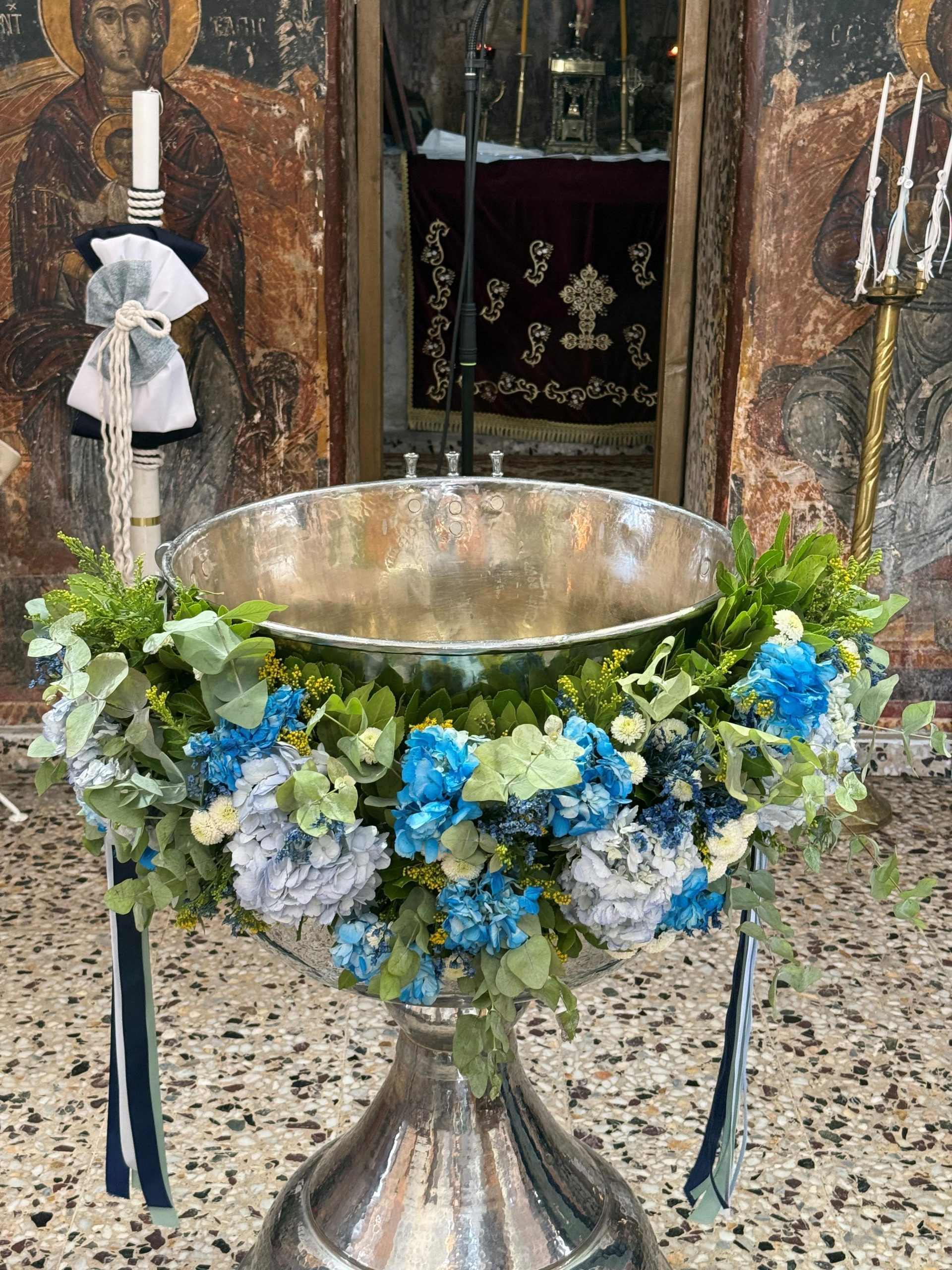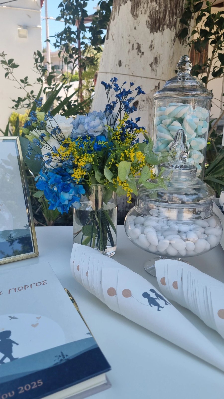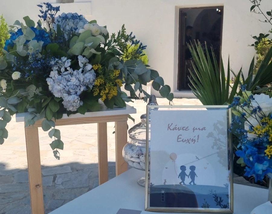 Η χρωματική παλέτα κινήθηκε σε αποχρώσεις του μπλε, του σιελ και του λευκού, δεμένες αρμονικά με φυσικά υλικά και minimal γραμμές με έμφαση στη φυσική κομψότητα και τη διακριτική παιδική αισθητική. Ο στολισμός πλαισιώθηκε από πλούσιες συνθέσεις με ορτανσίες σε μπλε και λευκούς τόνους, ευκάλυπτο και μικρά λευκά άνθη, δημιουργώντας ένα φρέσκο και κομψό αποτέλεσμα που ανέδειξε την απλότητα της εκκλησίας. Τα μπαλόνια σε απαλές μπλε και μέντα αποχρώσεις συμπλήρωσαν τον στολισμό.