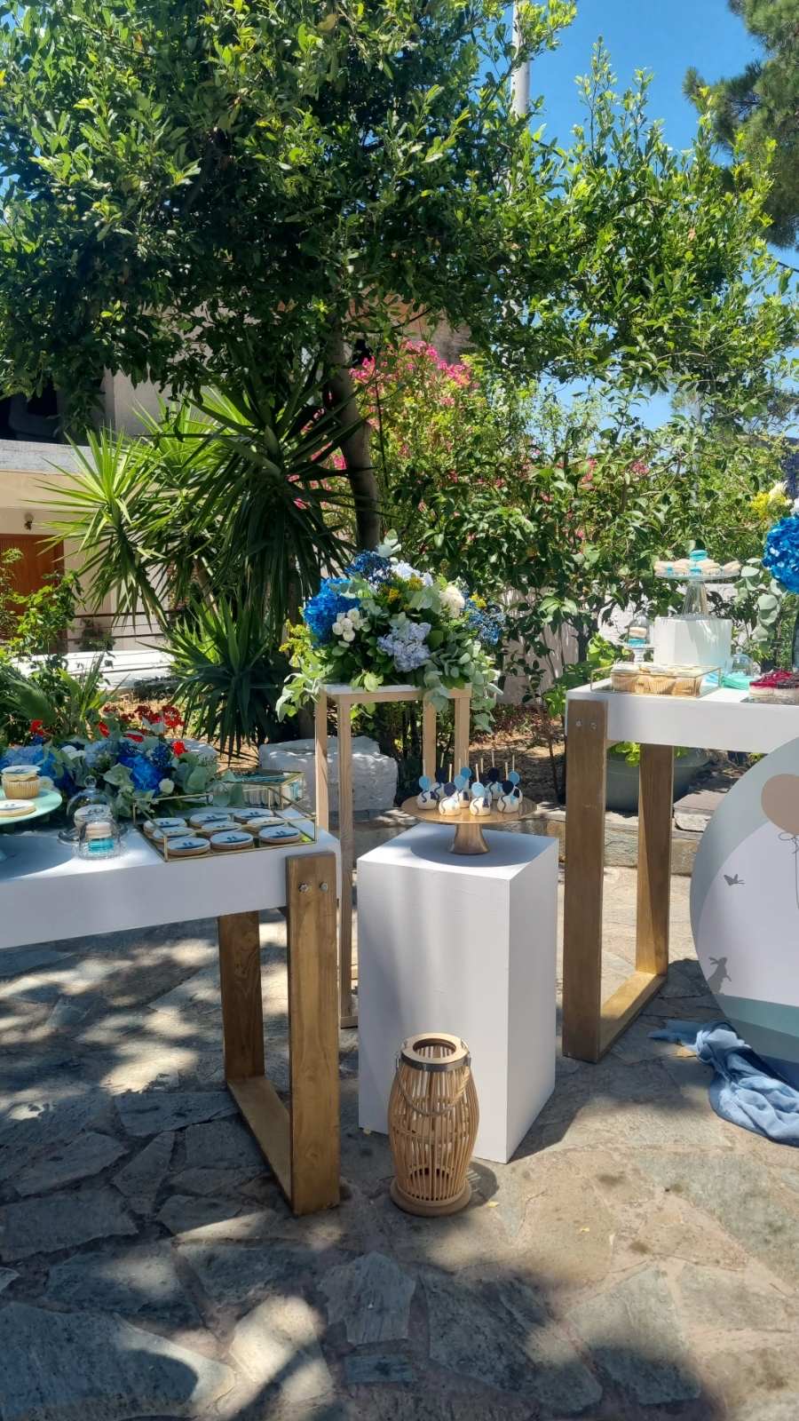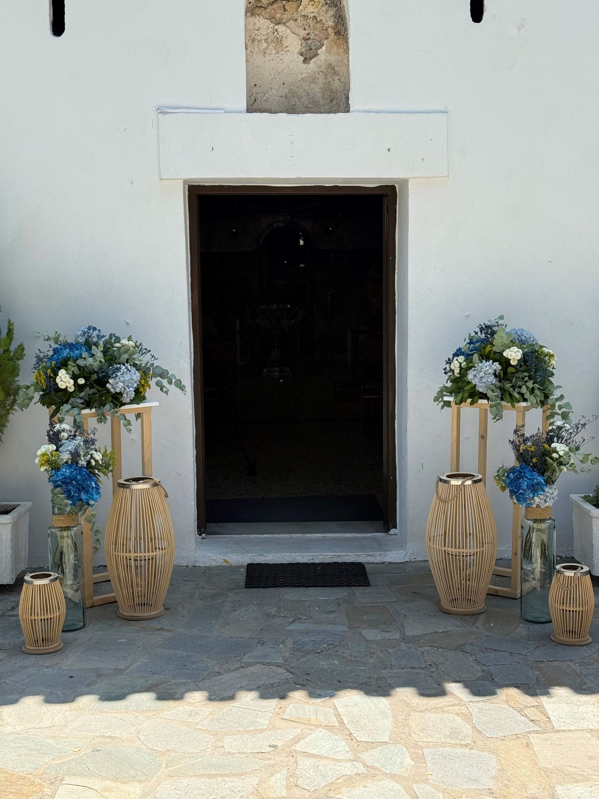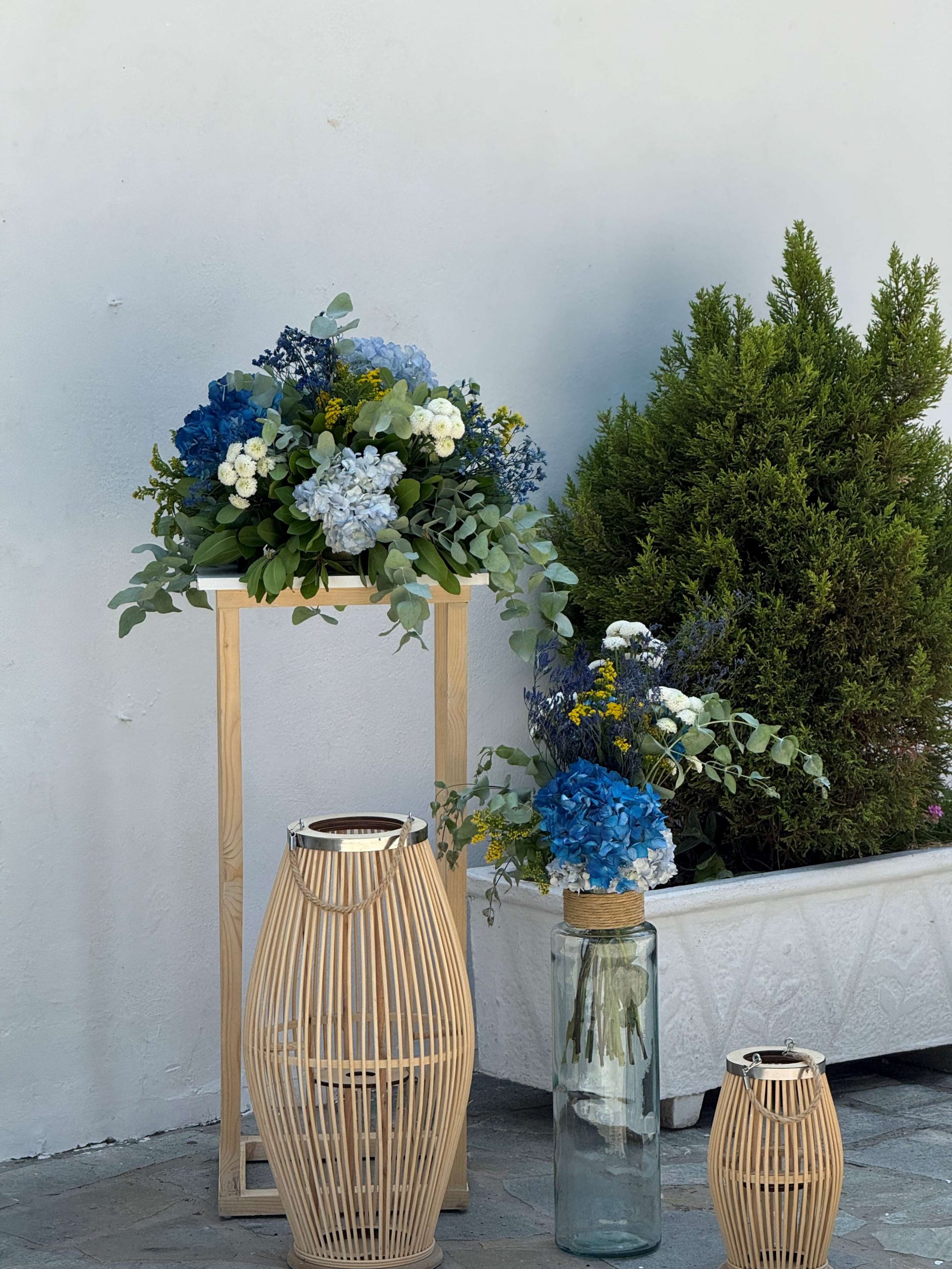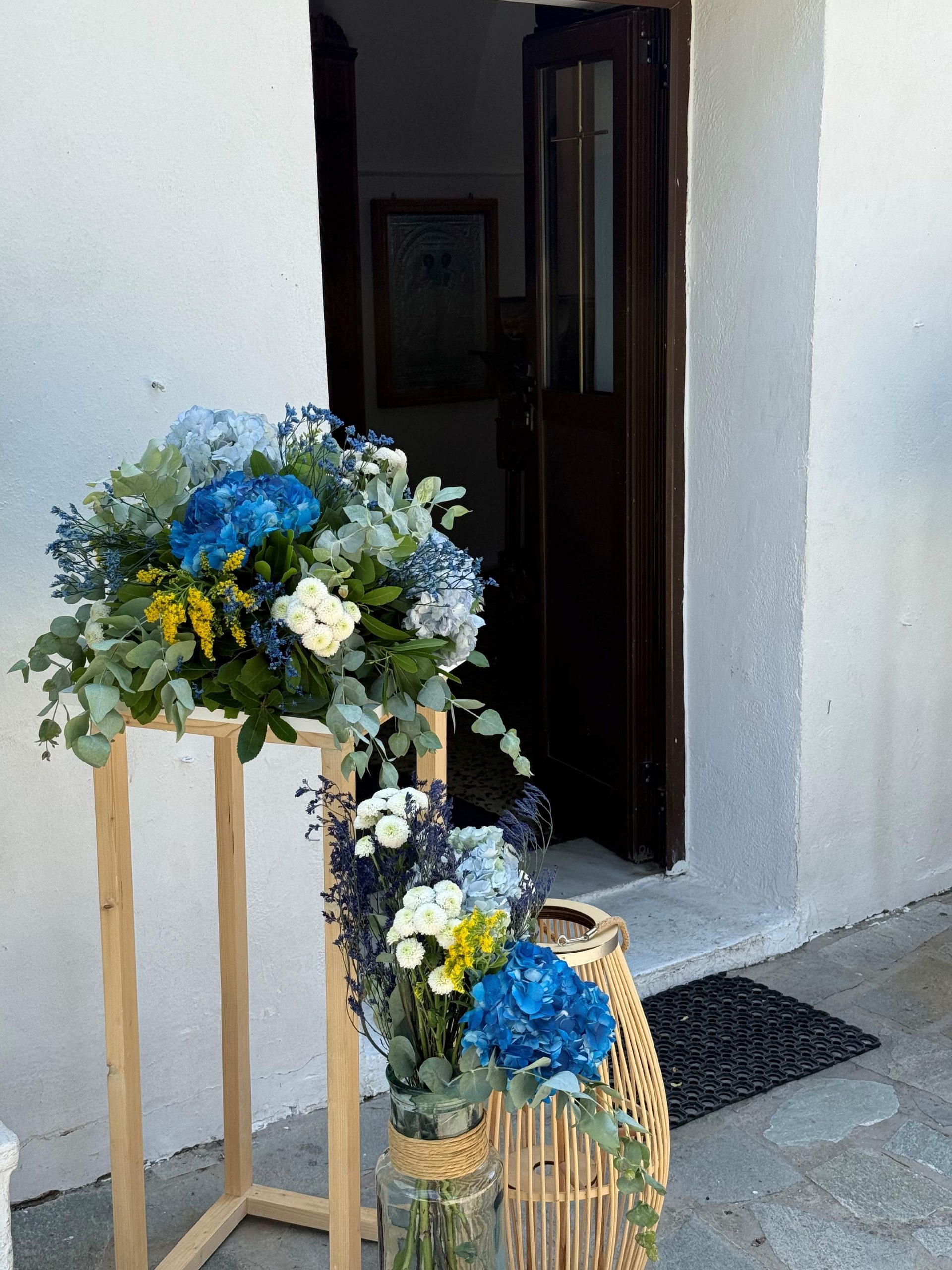 Η χρωματική παλέτα κινήθηκε σε αποχρώσεις του μπλε, του σιελ και του λευκού, δεμένες αρμονικά με φυσικά υλικά και minimal γραμμές με έμφαση στη φυσική κομψότητα και τη διακριτική παιδική αισθητική. Ο στολισμός πλαισιώθηκε από πλούσιες συνθέσεις με ορτανσίες σε μπλε και λευκούς τόνους, ευκάλυπτο και μικρά λευκά άνθη, δημιουργώντας ένα φρέσκο και κομψό αποτέλεσμα που ανέδειξε την απλότητα της εκκλησίας. Τα μπαλόνια σε απαλές μπλε και μέντα αποχρώσεις συμπλήρωσαν τον στολισμό.