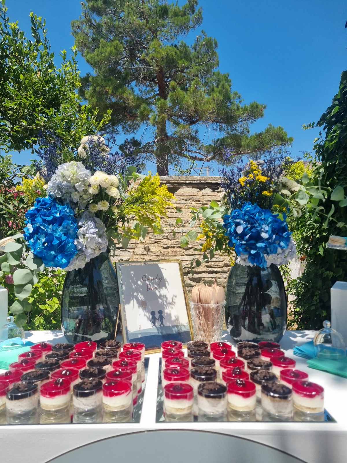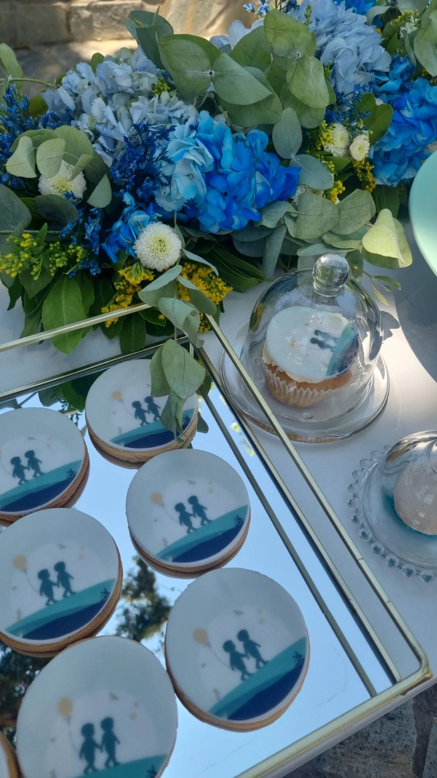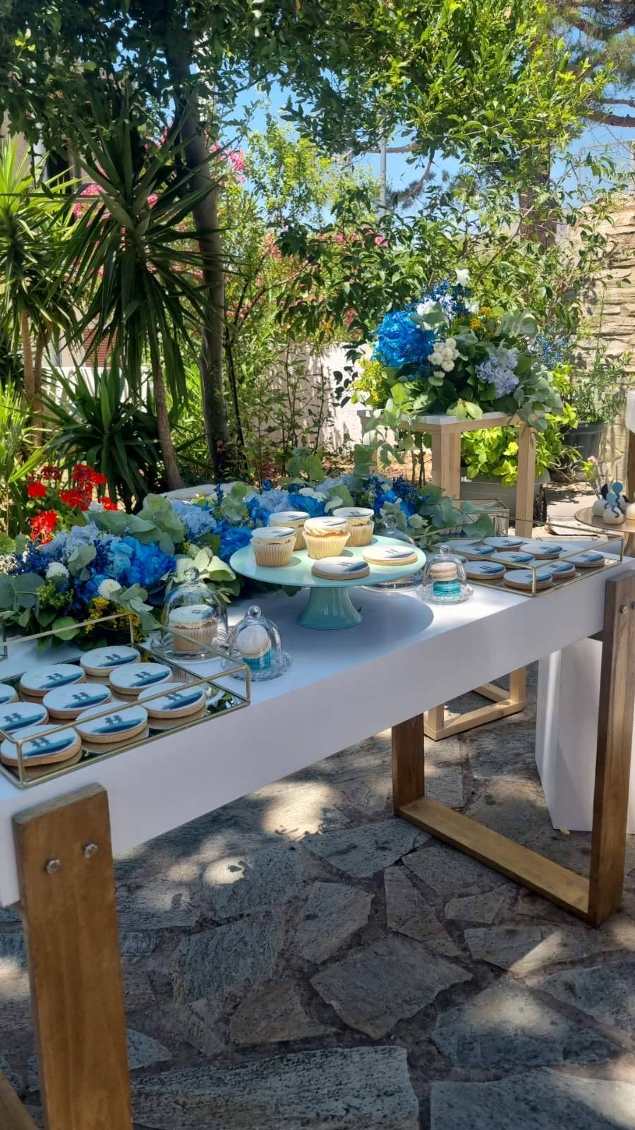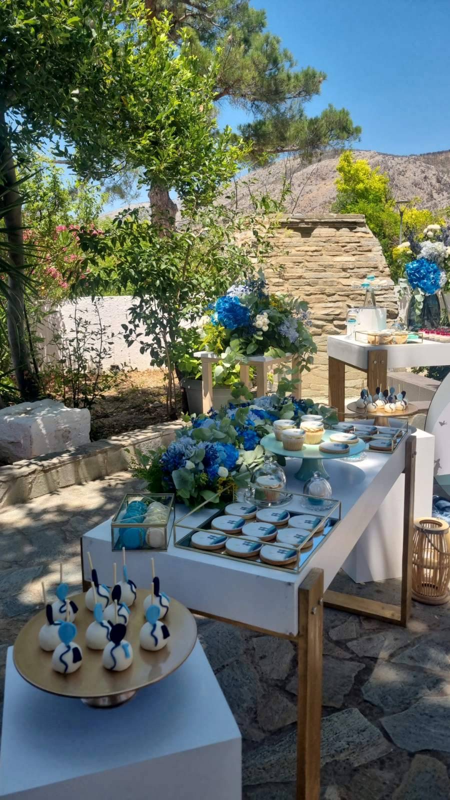 Το Candy Bar στήθηκε πάνω σε λευκές ξύλινες βάσεις και περιλάμβανε γλυκές λιχουδιές σε μπλε και λευκές αποχρώσεις, μακαρόν, cake pops, cup cakes και mini σφηνάκια, όλα δεμένα χρωματικά και αισθητικά με το concept της βάπτισης. ενώ το backdrop με τις φιγούρες των δυο δίδυμων αγοριών υποδέχονταν τους καλεσμένους με παιχνιδιάρικη αλλά κομψή διάθεση.
