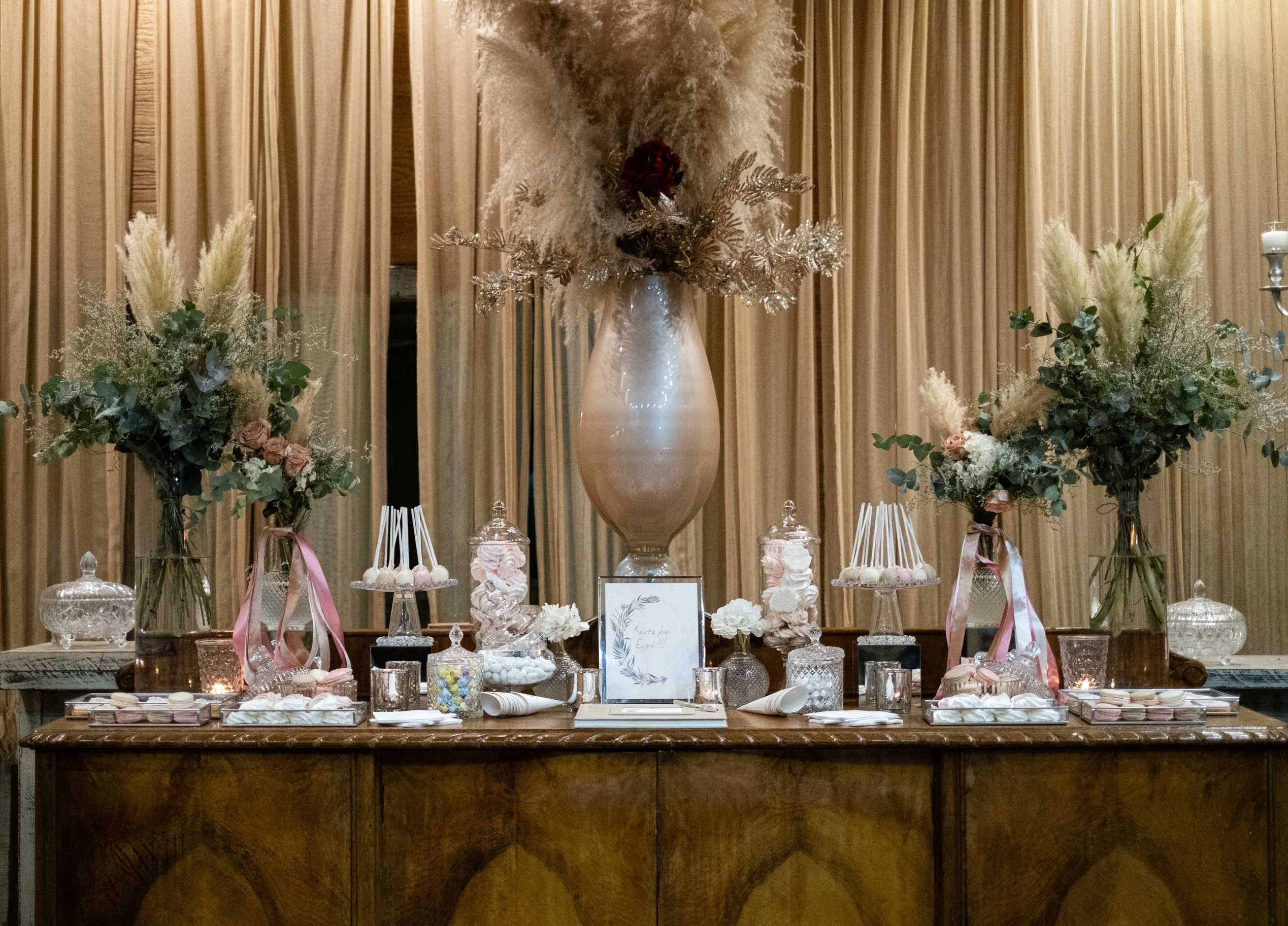The dessert table is not just a beautiful detail — it is a sweet experience that has become a favorite spot at every reception!!! It adds character, color and atmosphere, enhancing the overall decoration and aesthetics of your wedding. Its design is inspired and perfectly harmonized with the style and concept of the event, aiming to impress visually and offer a delightful, tasteful touch to your guests.